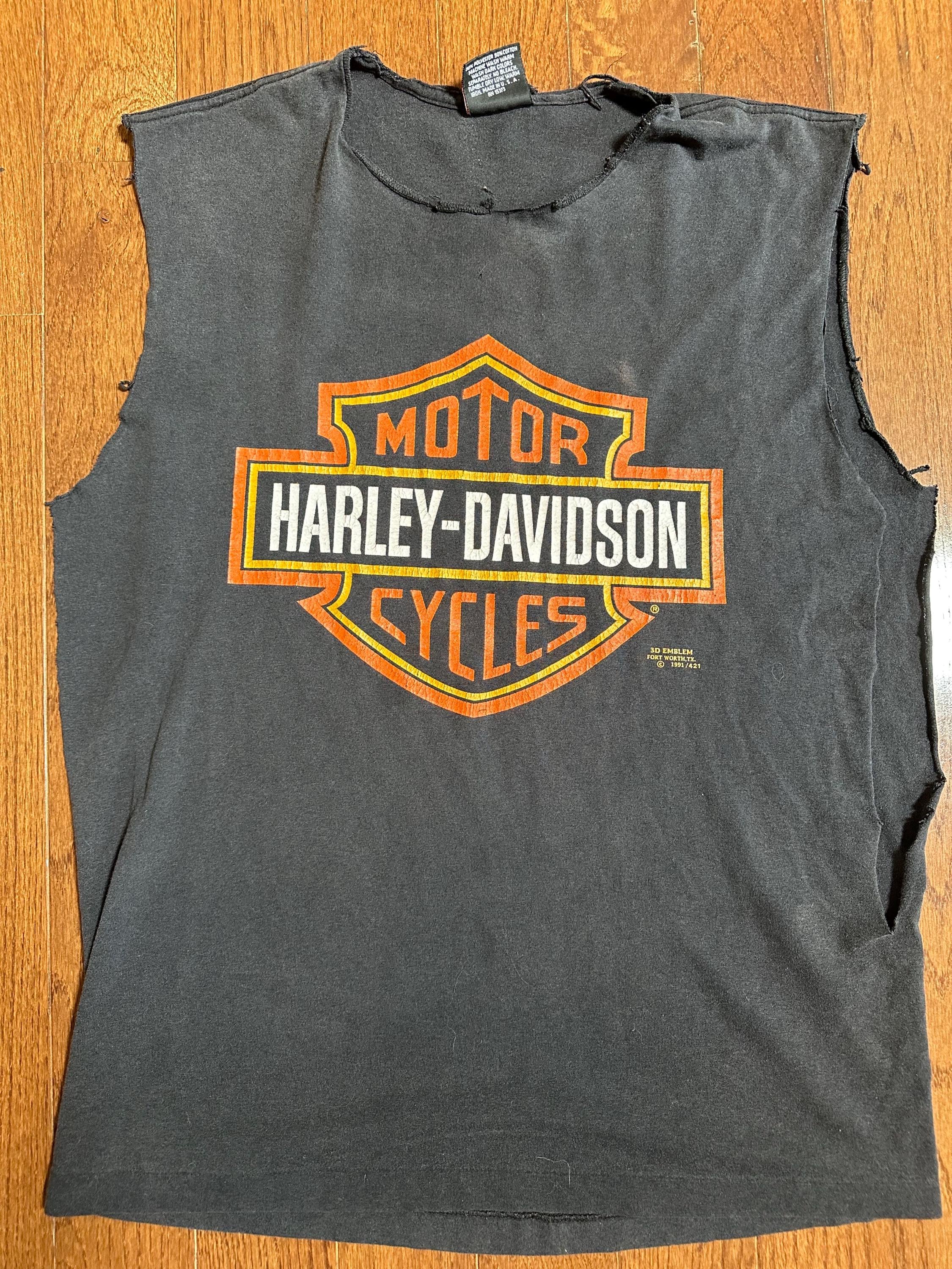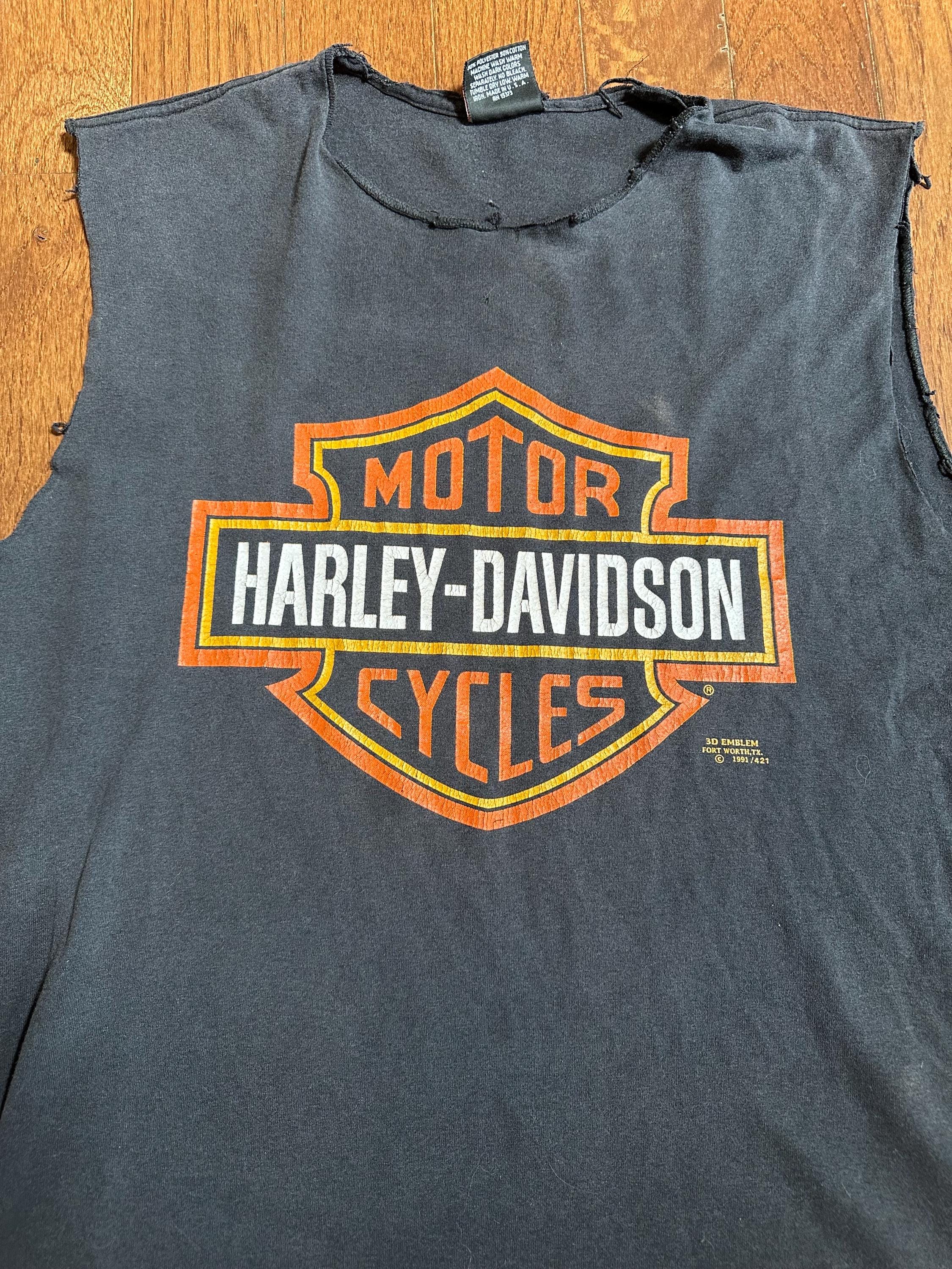 Killer 1991 3D Emblem Harley graphics that are bold and full of that classic early-90’s vibe. Thrashed to perfection with a ripped sleeve down the side that just adds to its “don’t mess with me” charm.
