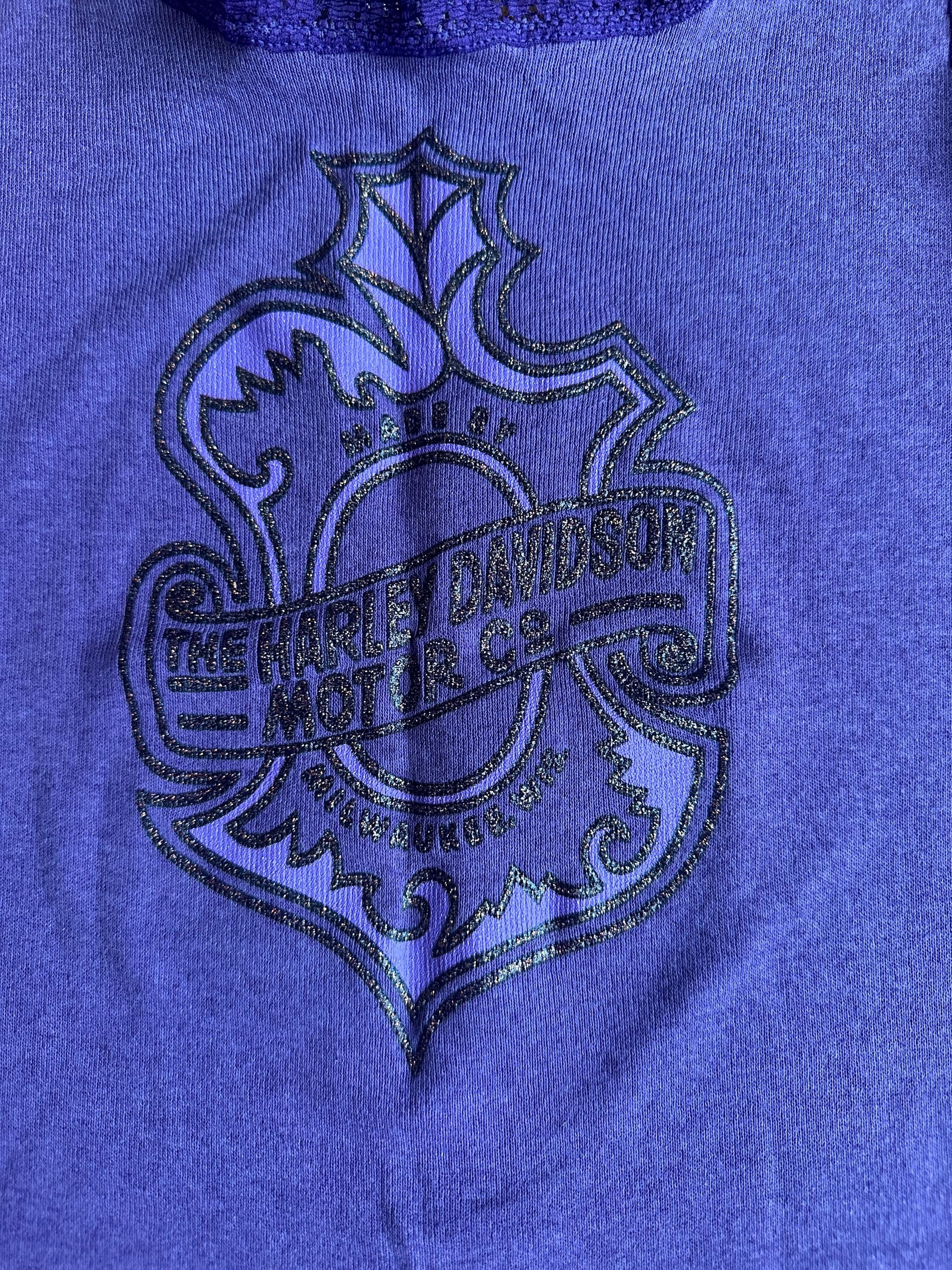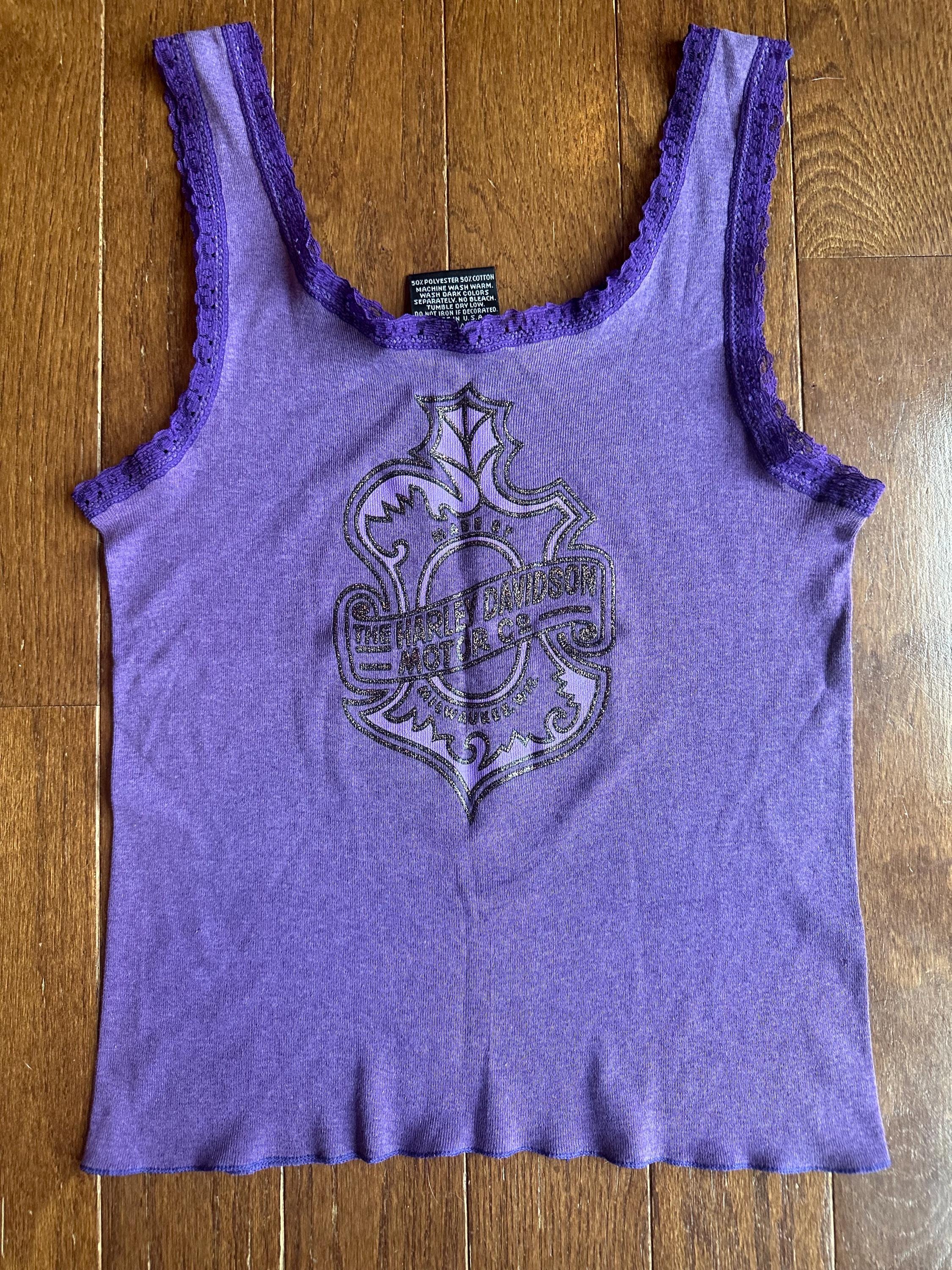 A seriously cute 1989 Harley-Davidson tank in the prettiest shade of purple. The puffy sparkle Harley graphic is the star here, it adds texture and shine without feeling over the top. A great example of how fun and playful late-80s Harley pieces can be.