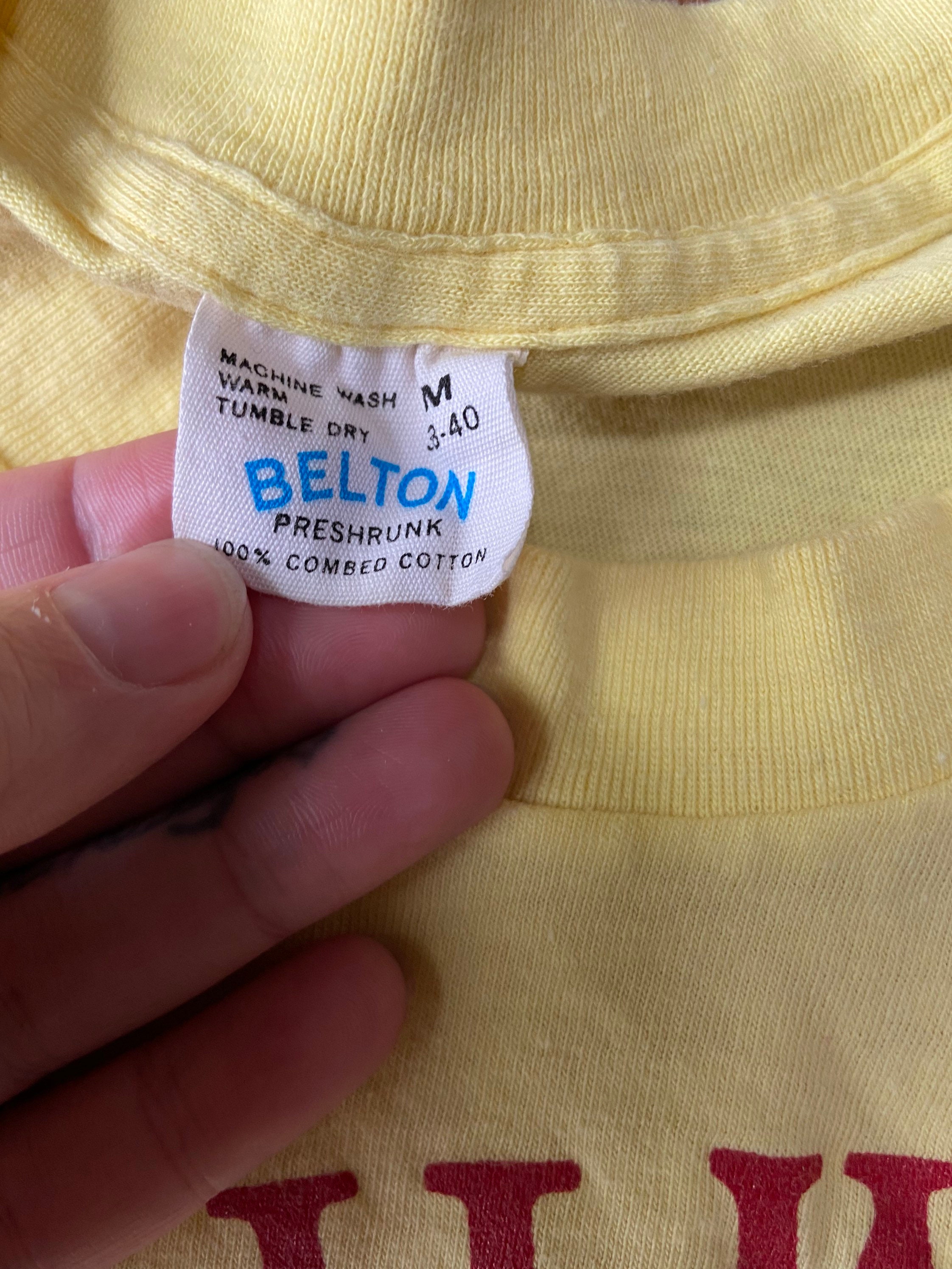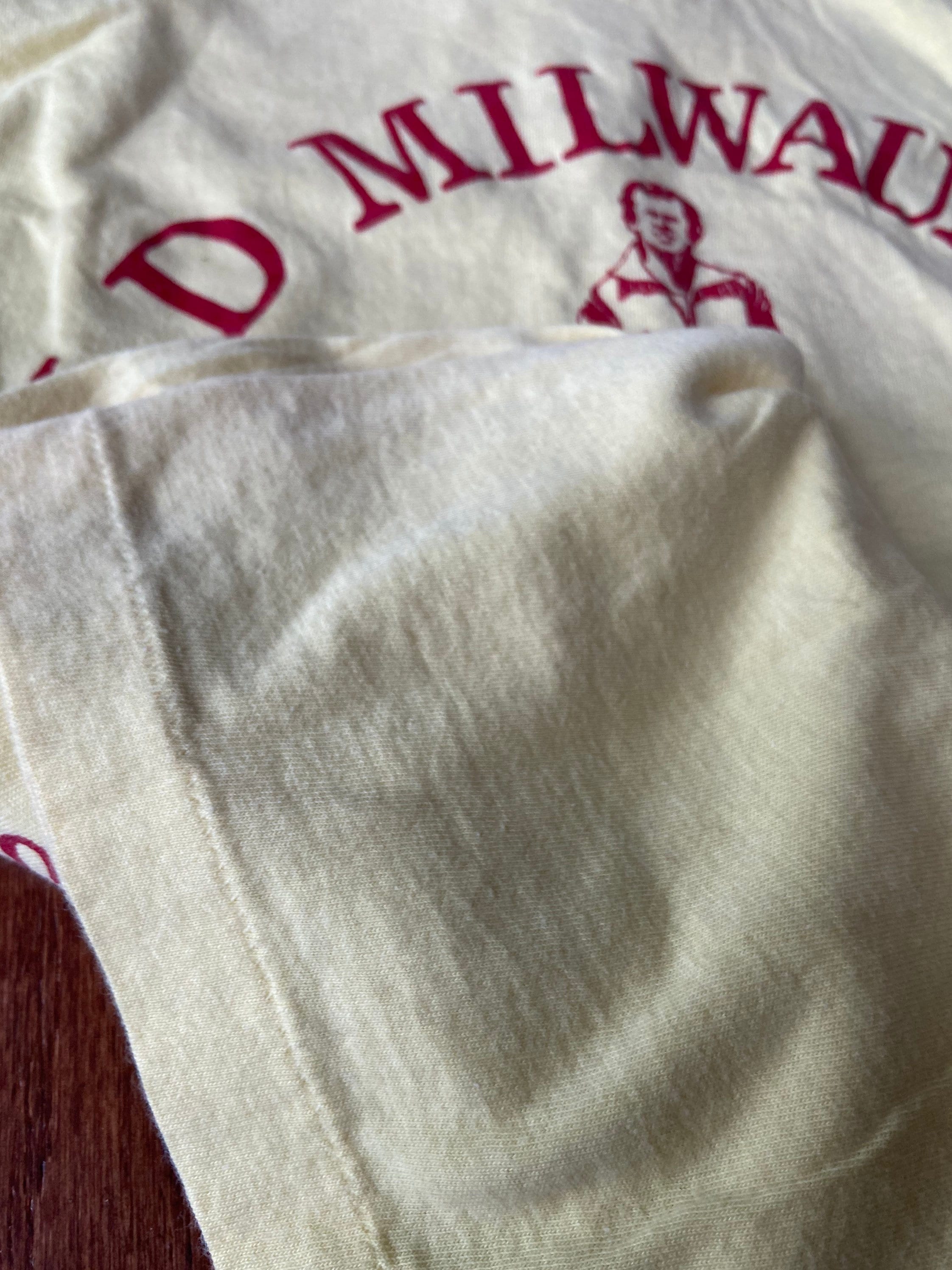 A great vintage Old Milwaukee Mini-Marathon tee in that perfect soft yellow you just do not see as often. The runner graphic on the front has a strong, simple look, and the back graphics add a nice extra detail without feeling busy.