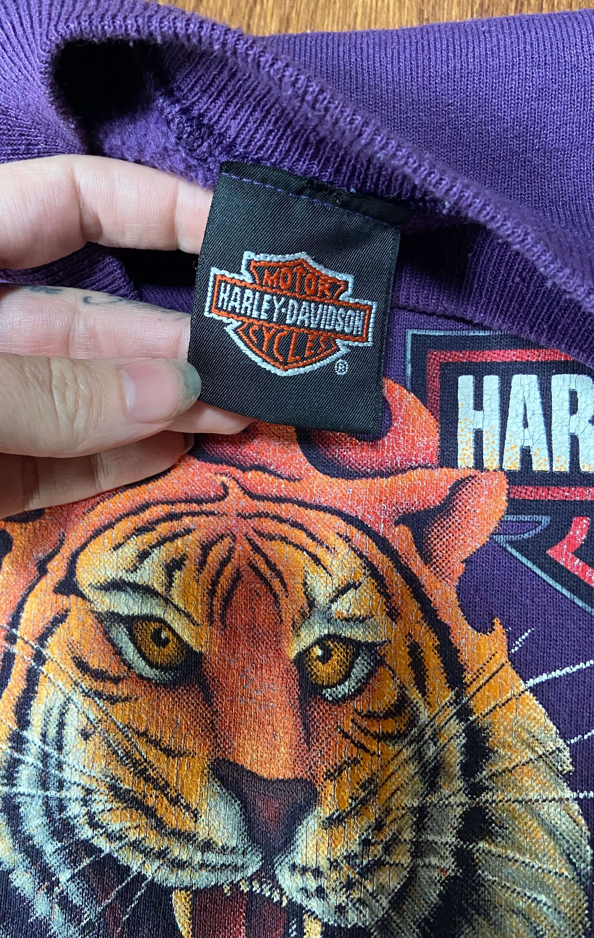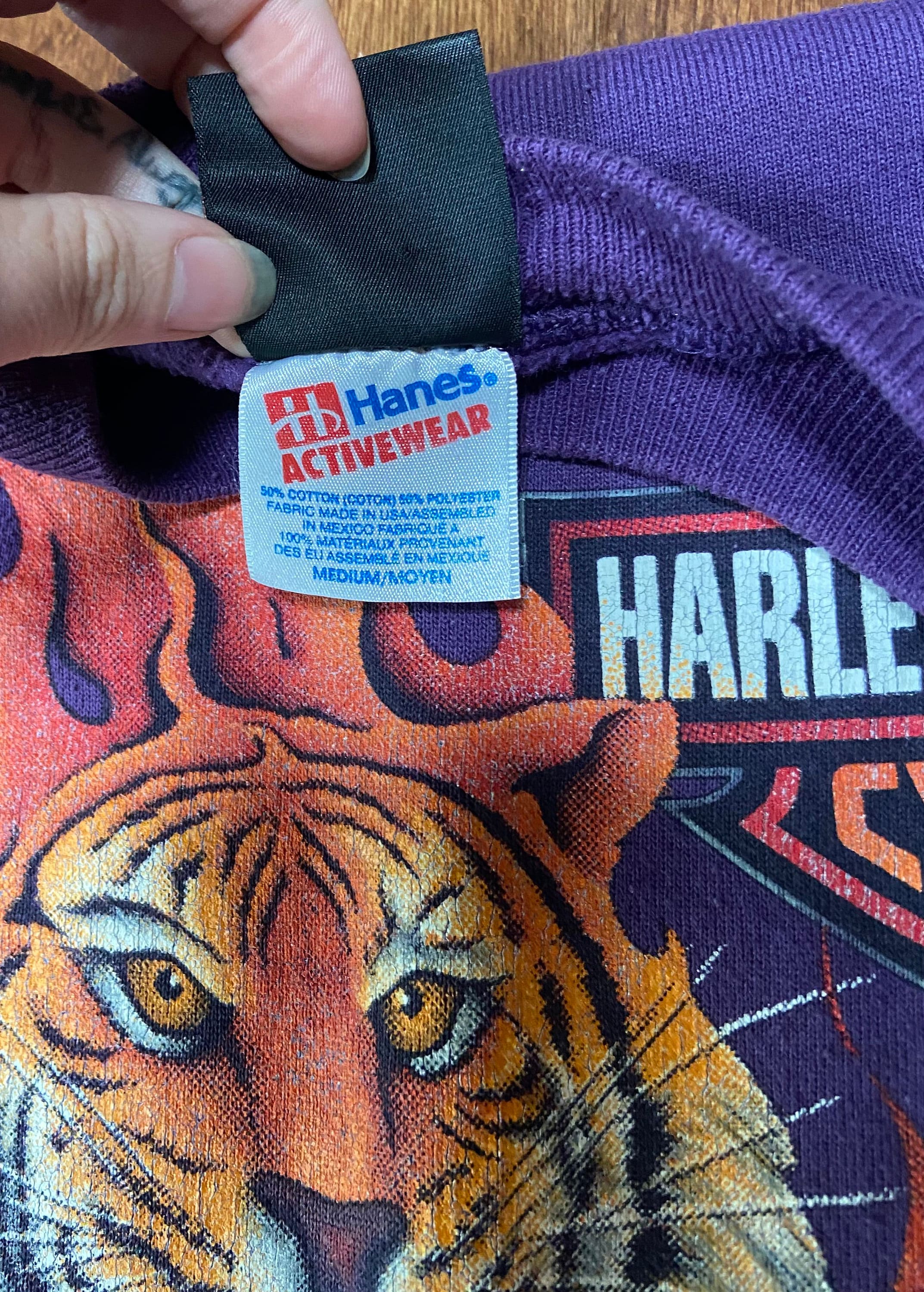 A true thrashed 1994 Harley-Davidson pullover with bold Untamed tiger graphics on the front and cracked shop graphics on the back. This one shows real wear, including visible pilling and oil stains on both the front and back, which is why it is being listed as thrashed.