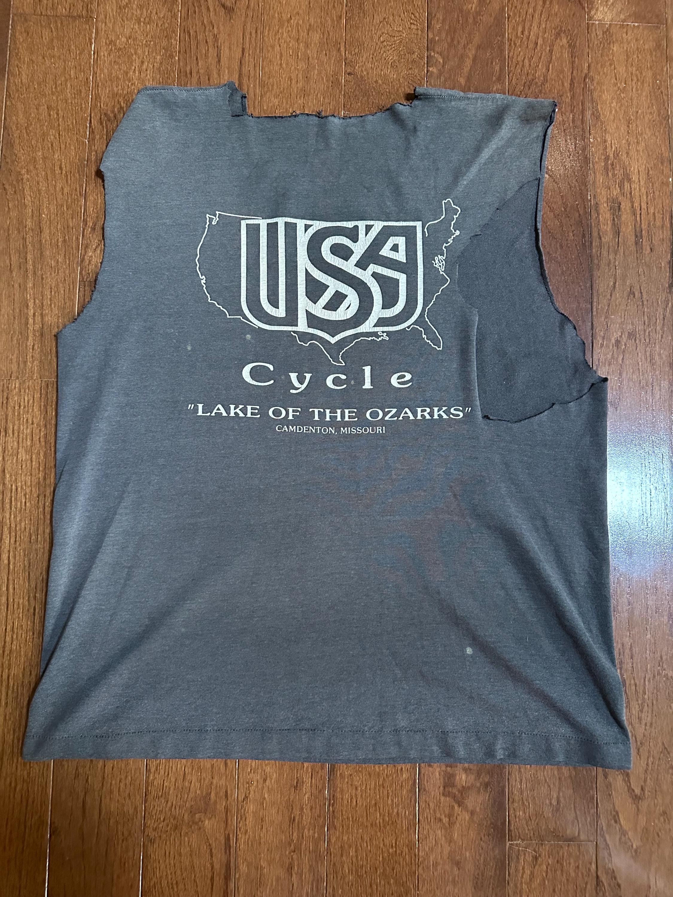 Condition: Heavily thrashed—fading, staining, and cuts throughout. The perfect beat-up vintage tee with major character.
