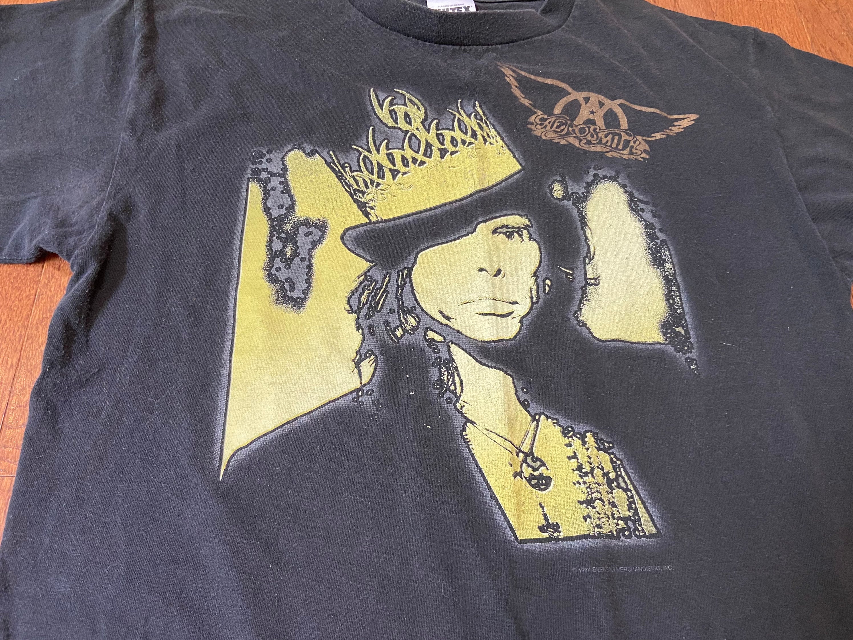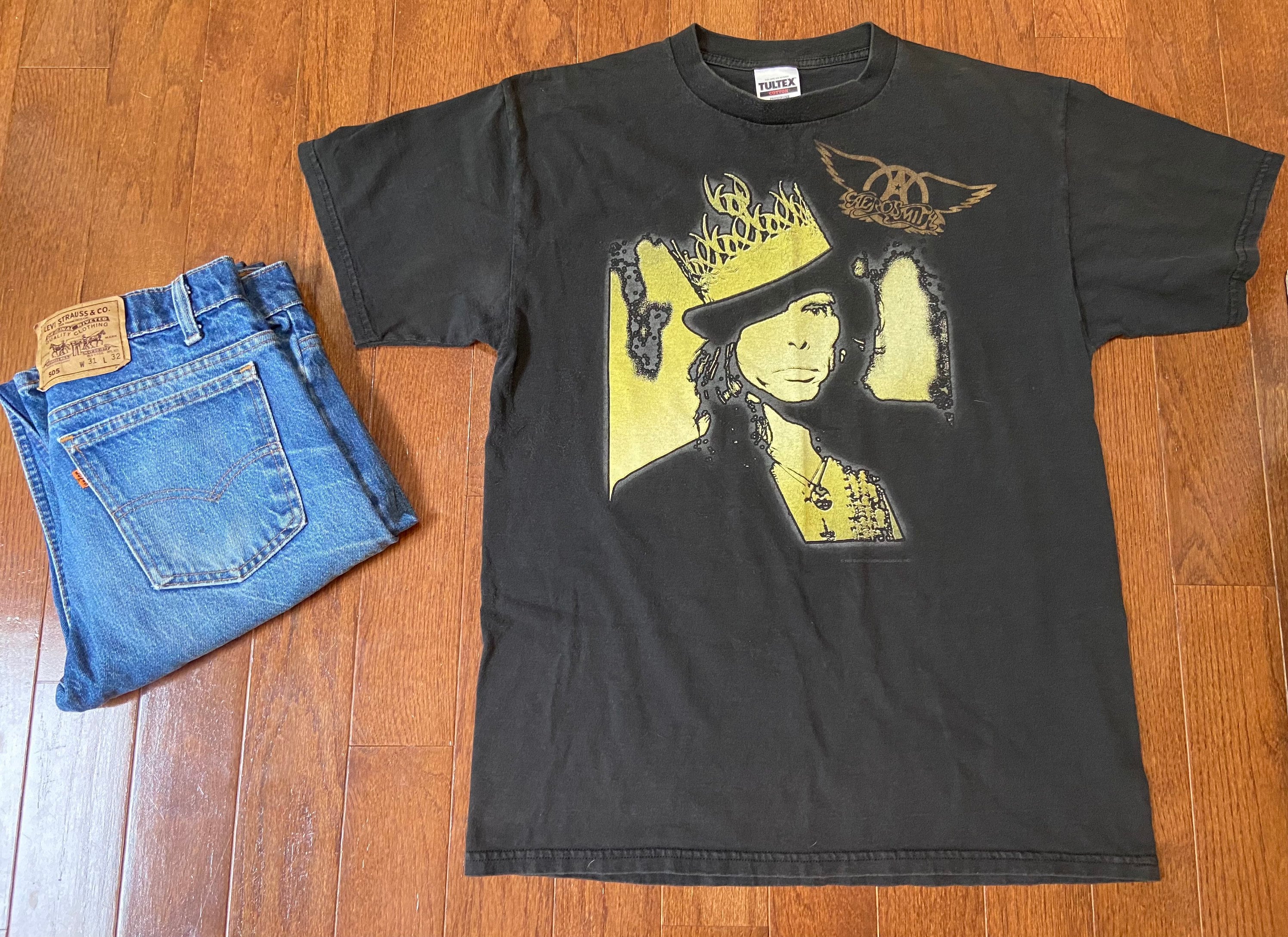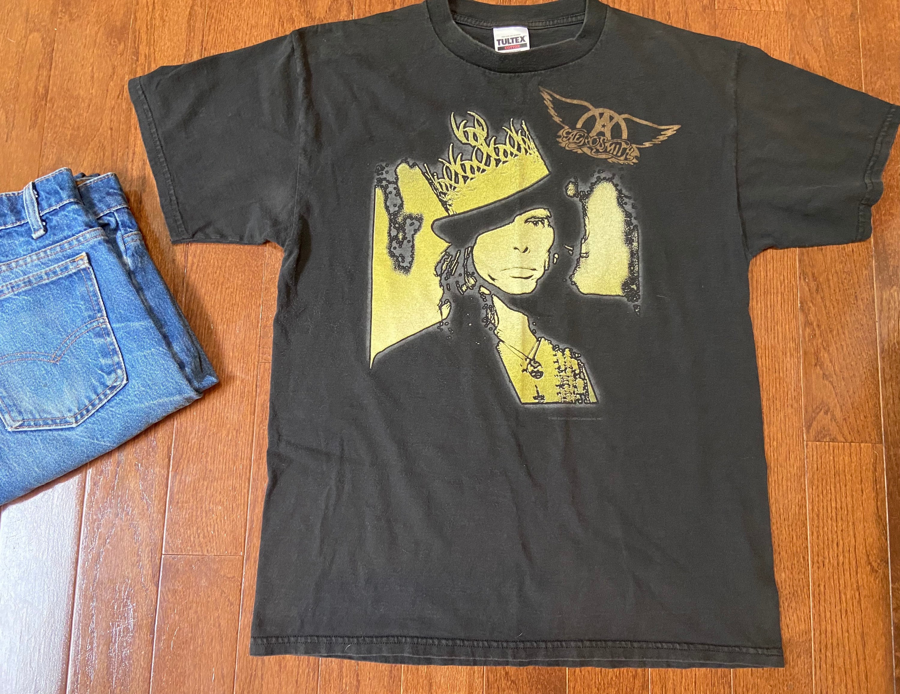 This is a true late 90s tour tee with both a strong front graphic and back hit, which makes it more collectible and harder to find. The Steven Tyler artwork gives it that extra edge that sets it apart from standard band tees.
