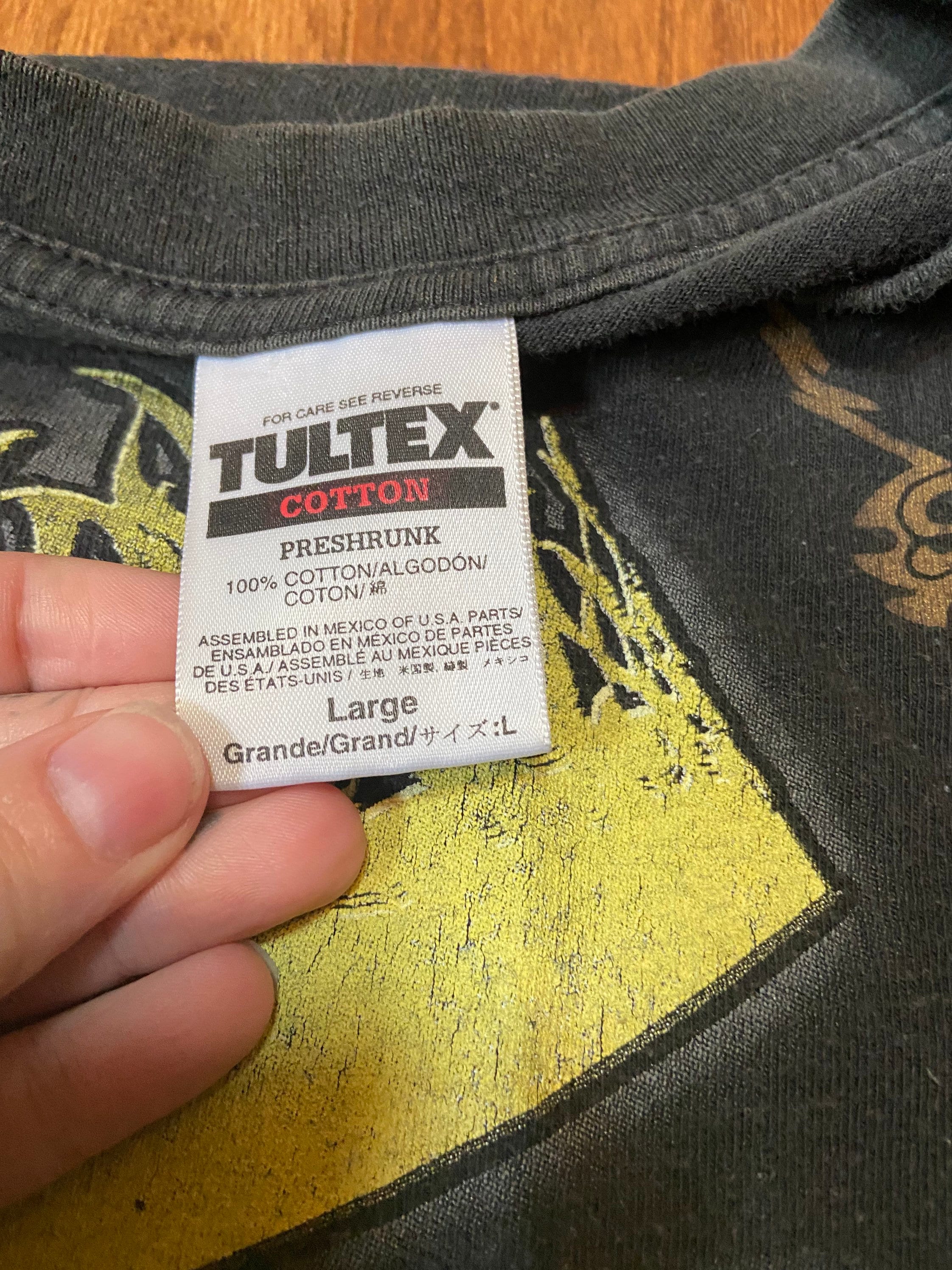 Soft black cotton with natural fading that gives it that perfectly worn-in vintage feel. The graphic shows some cracking, adding to the character and authenticity of the piece.