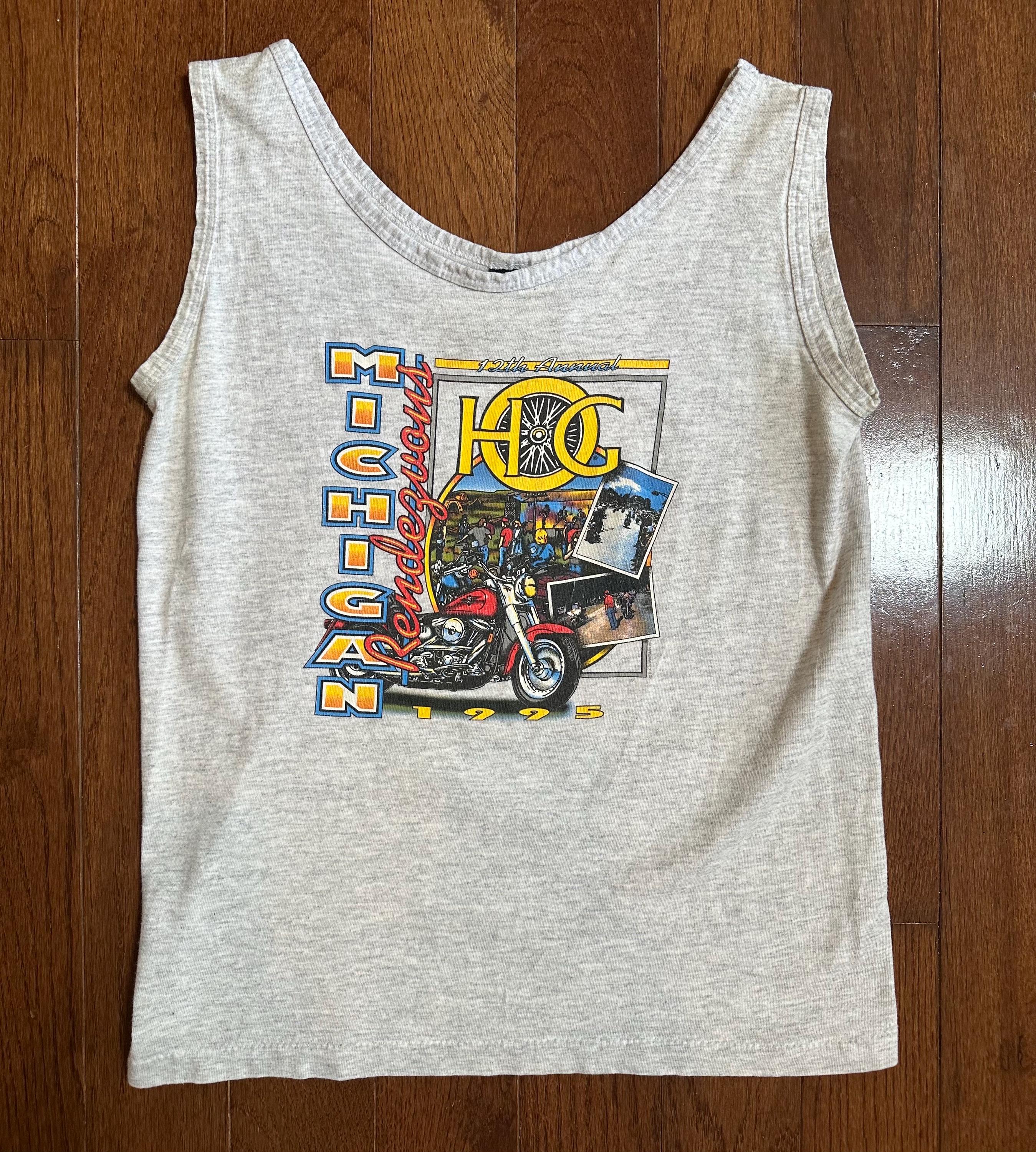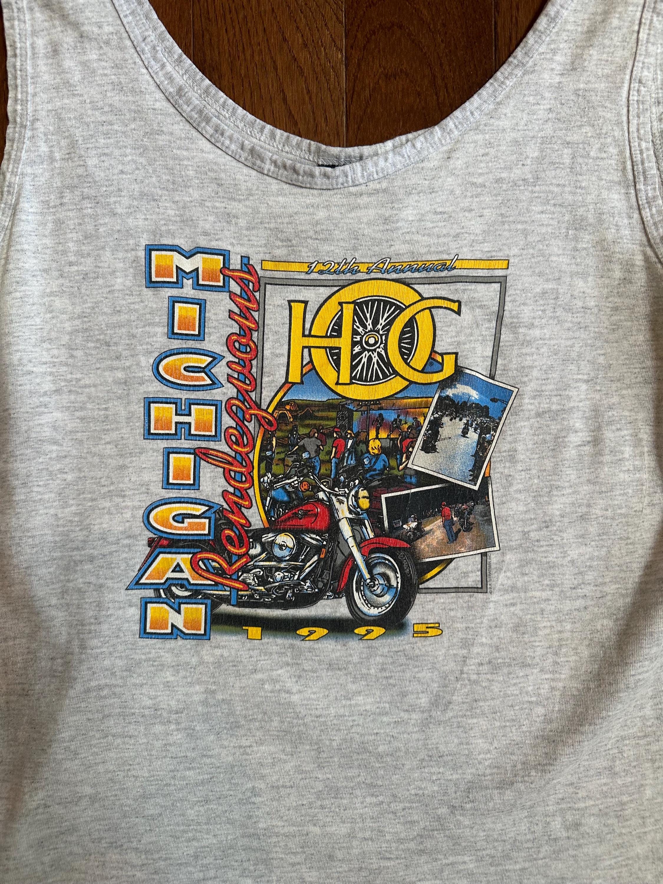 A bold mid-90s Harley tank from the 12th Annual Michigan Rendezvous, 1995. Bright graphics pop against the soft cotton, with just the right amount of cracking for that authentic vintage look.