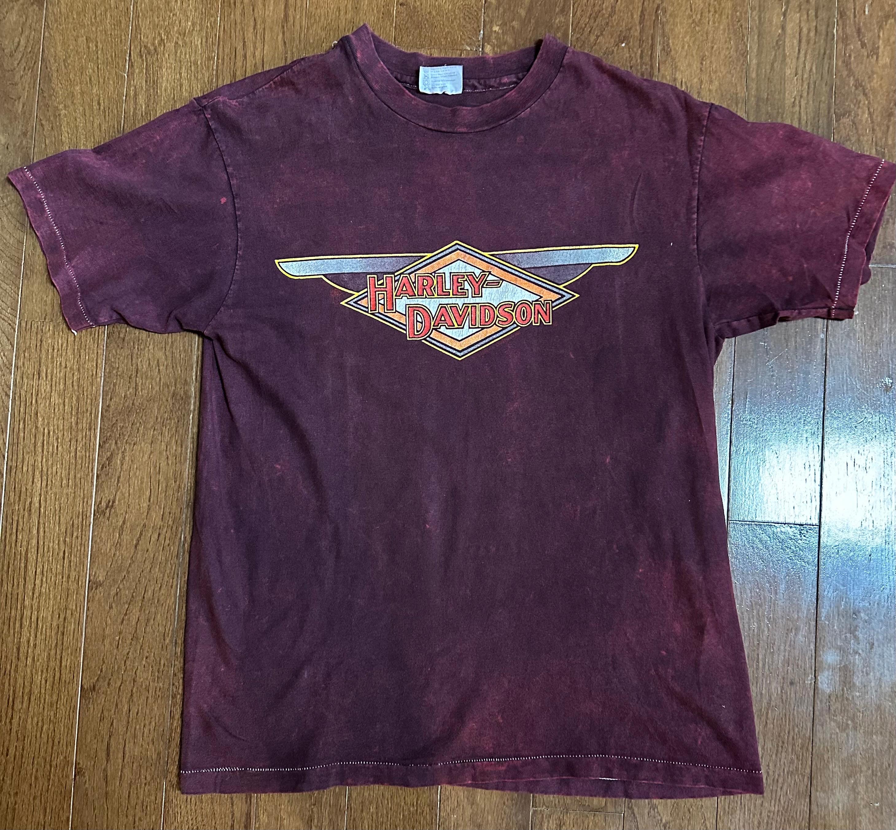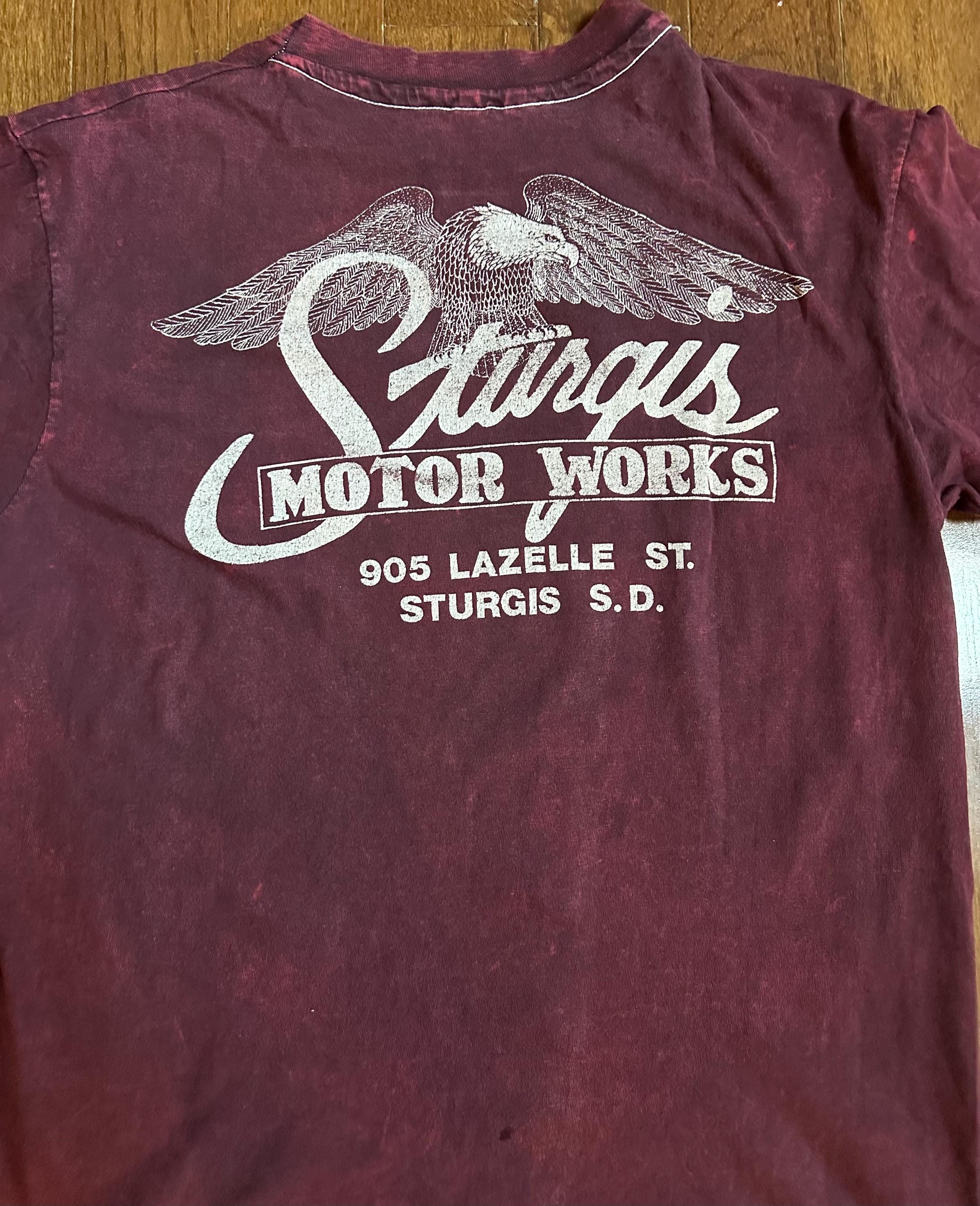 A true vintage Harley gem from the 1980s. This Sturgis tee features bold orange, yellow, and red graphics with striking purple contrast and crisp white stitching. Perfectly broken-in with that authentic Harley attitude.