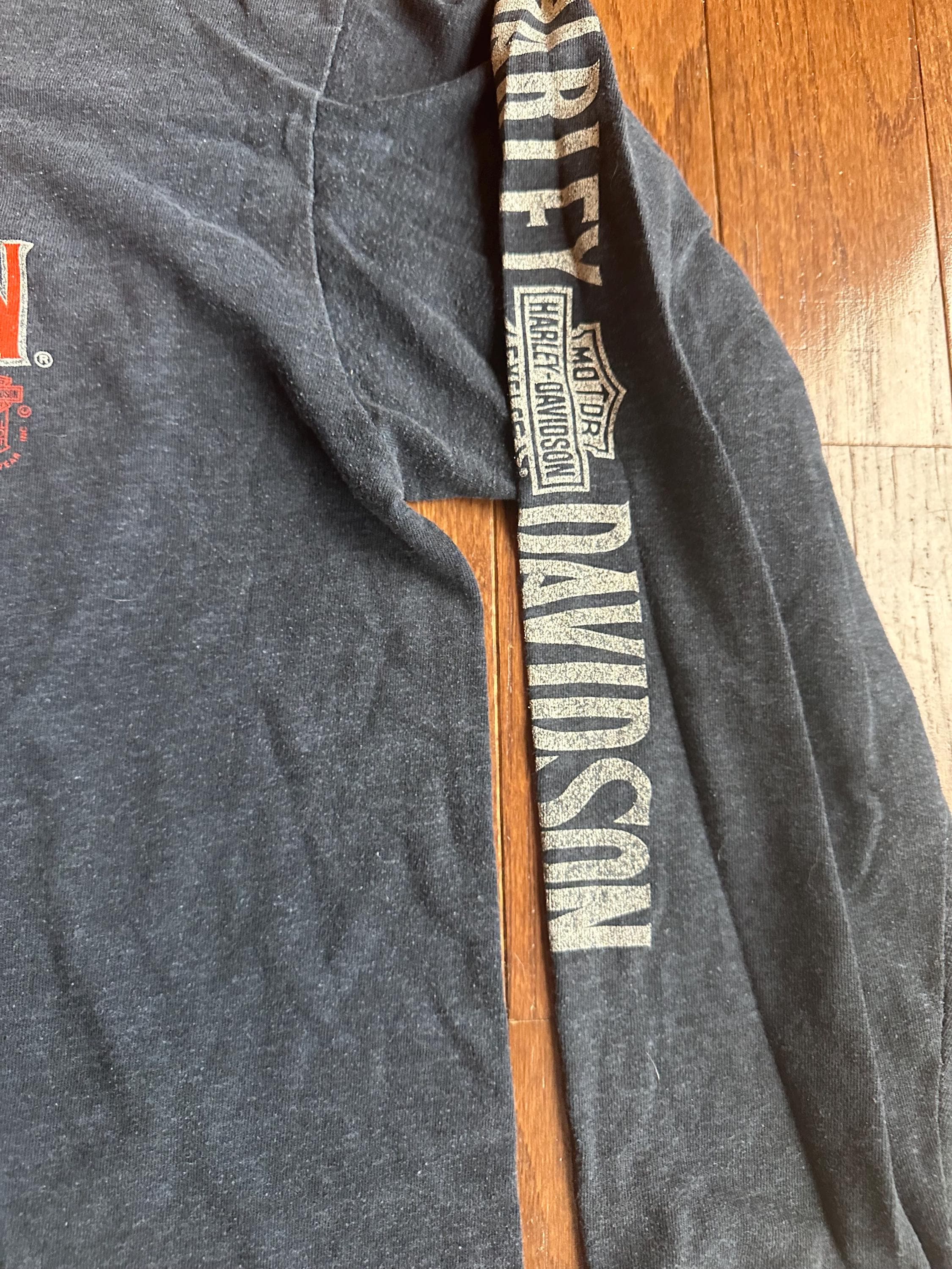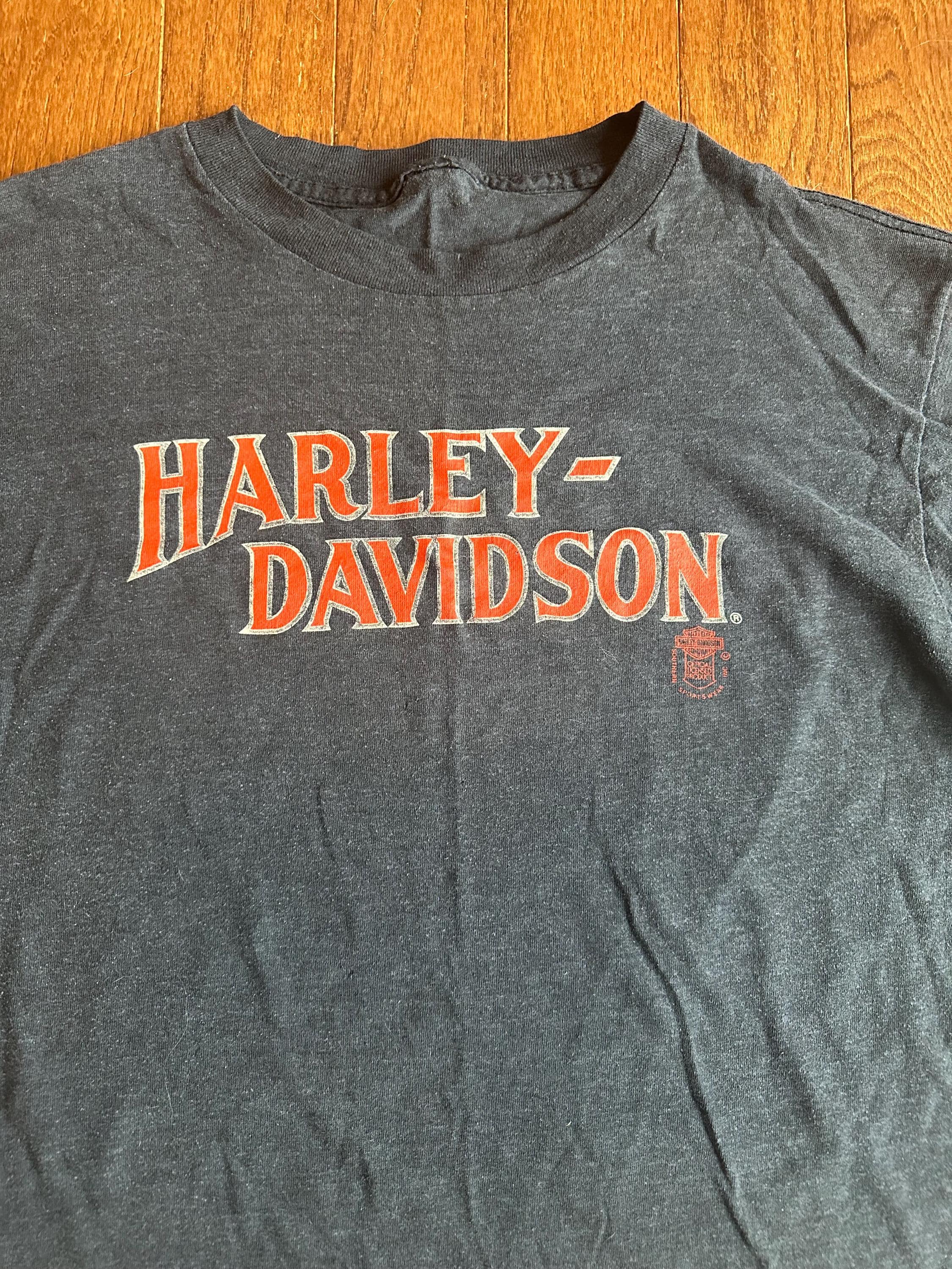 Styling note: easy everyday vintage, throw it on with jeans, layer it under a jacket, or wear it oversized for a relaxed Harley look