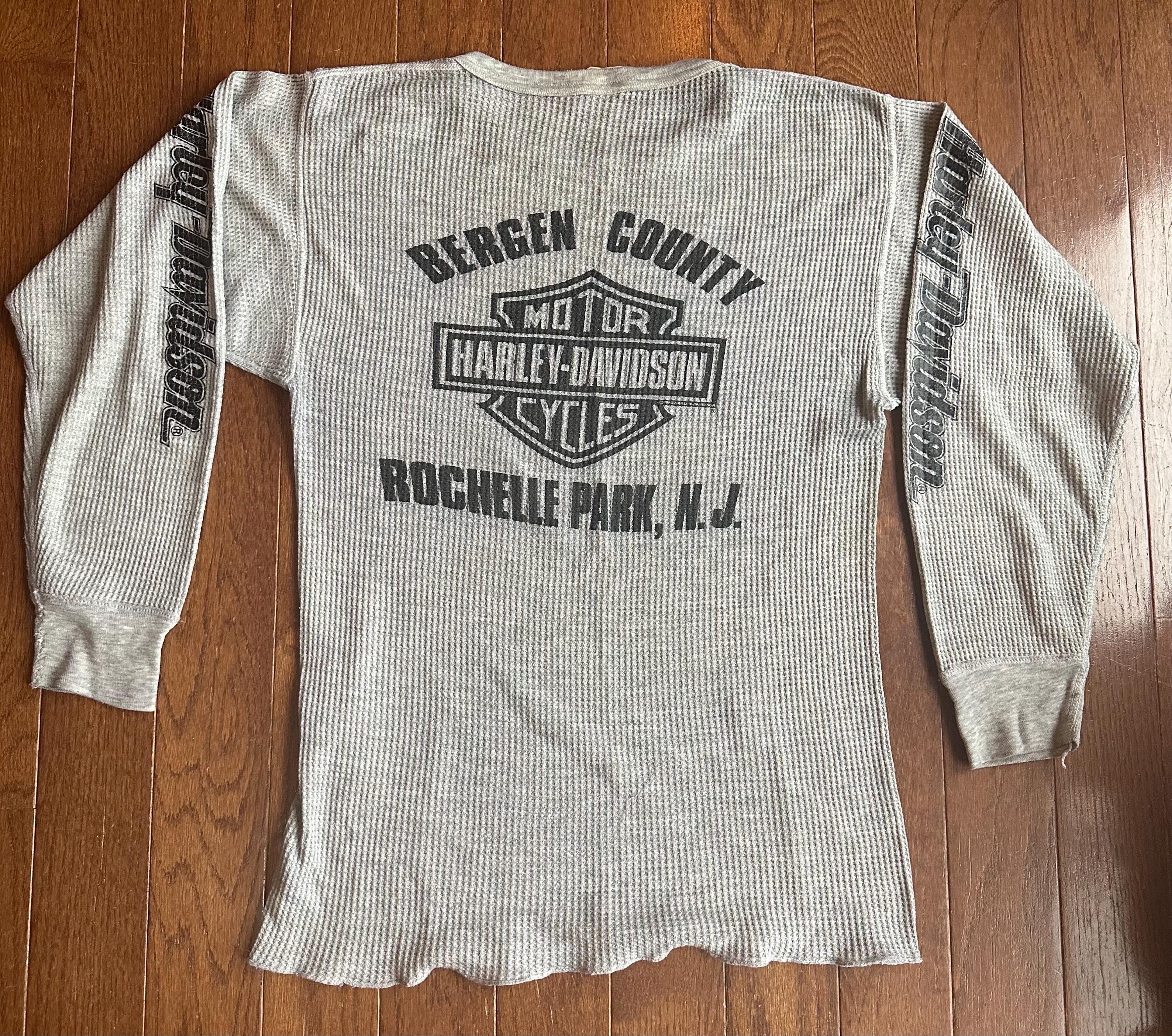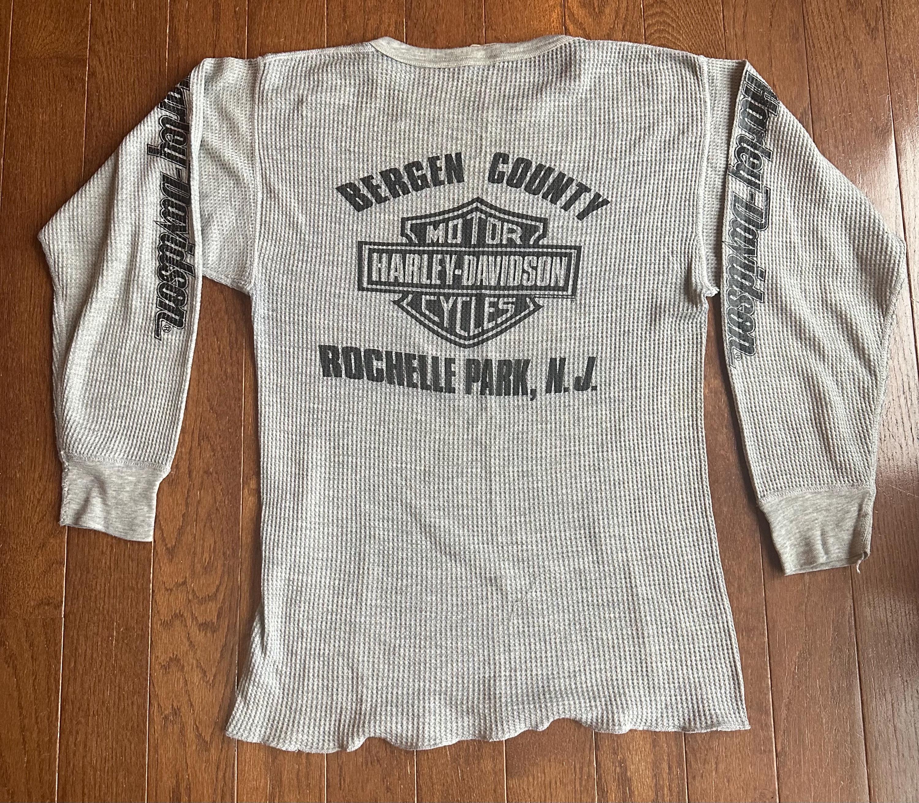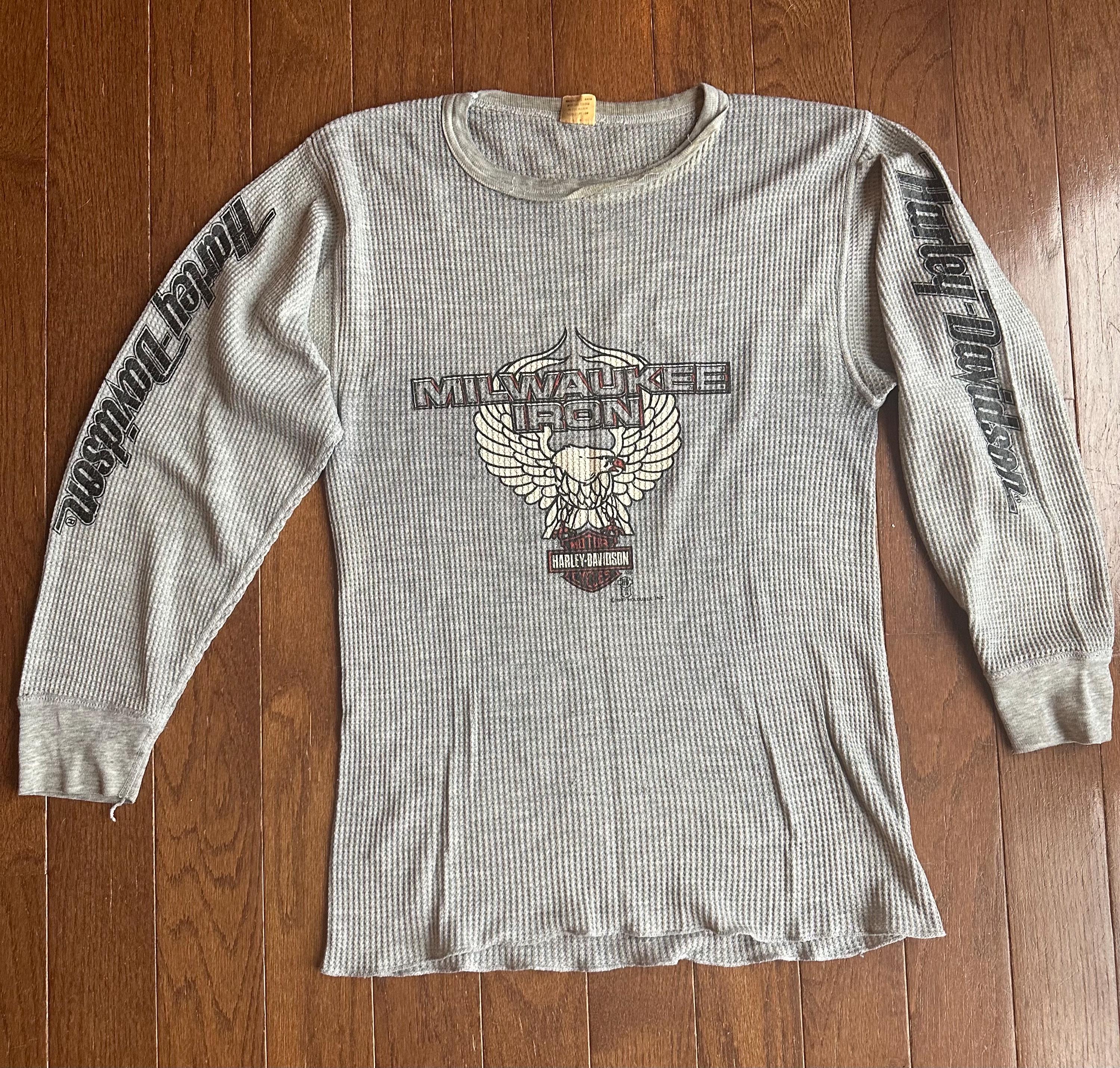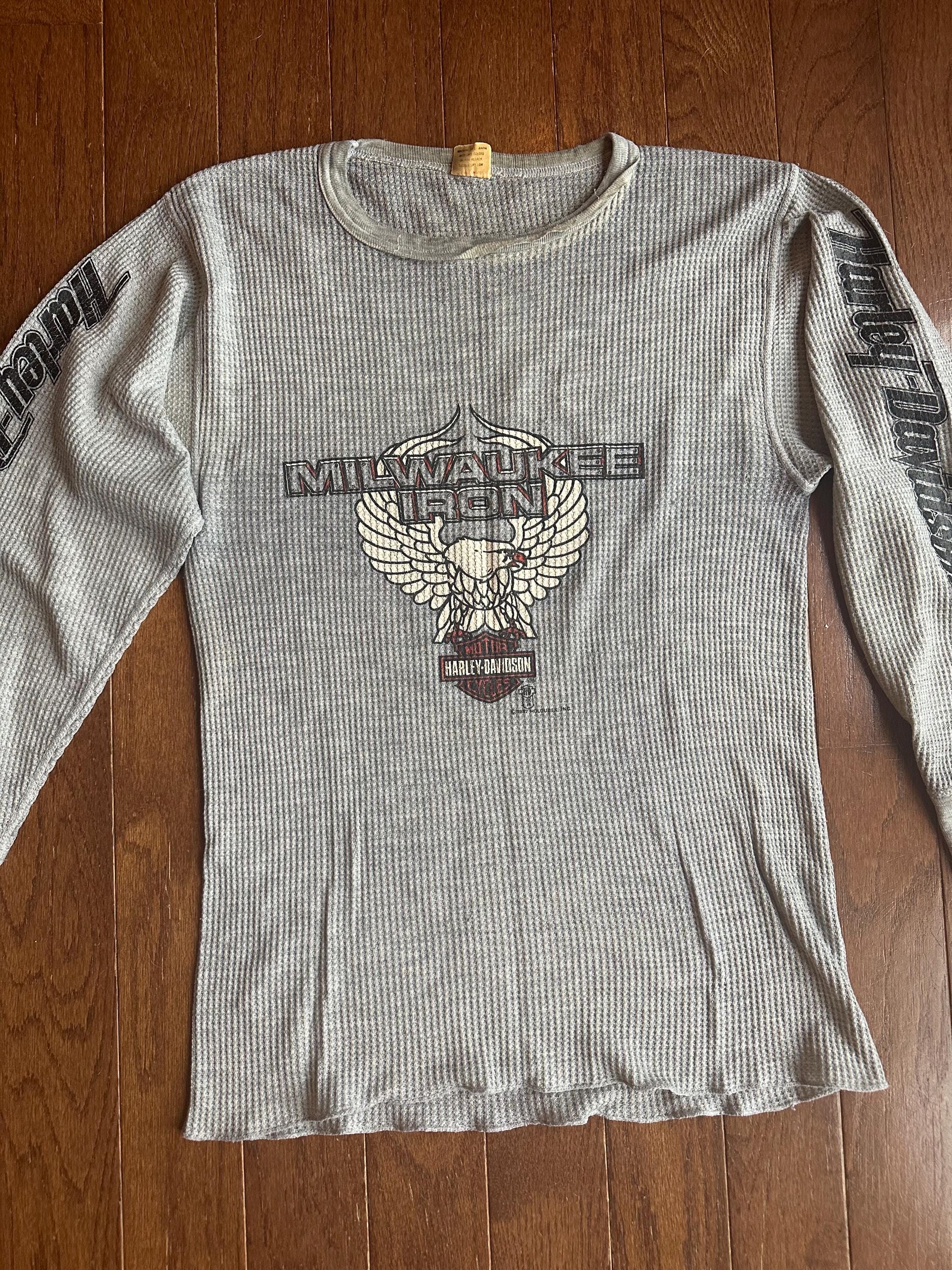 This 1987 Milwaukee Iron Harley thermal is the real deal, broken in, butter soft, and worn exactly the way vintage should be. The classic Harley eagle graphic sits front and center, with Harley-Davidson script running down both sleeves for that full statement look.