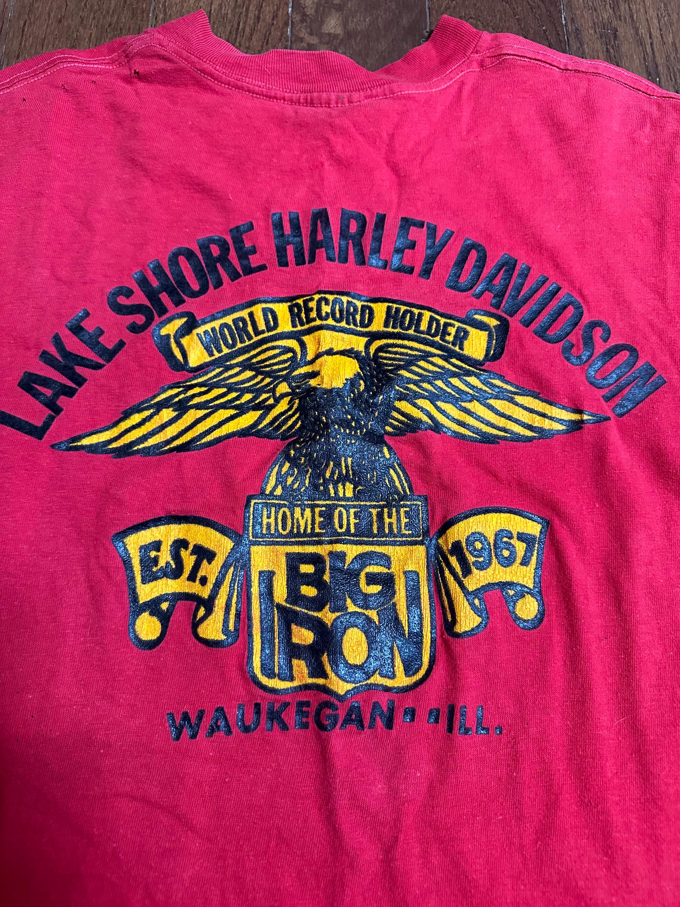 This one is all about the details. The front pocket features the Lake Shore Harley-Davidson eagle logo, while the back shows off bold yellow-and-blue graphics: “World Record Holder – Home of the Big Iron – Est. 1967.” A true piece of Illinois Harley history.