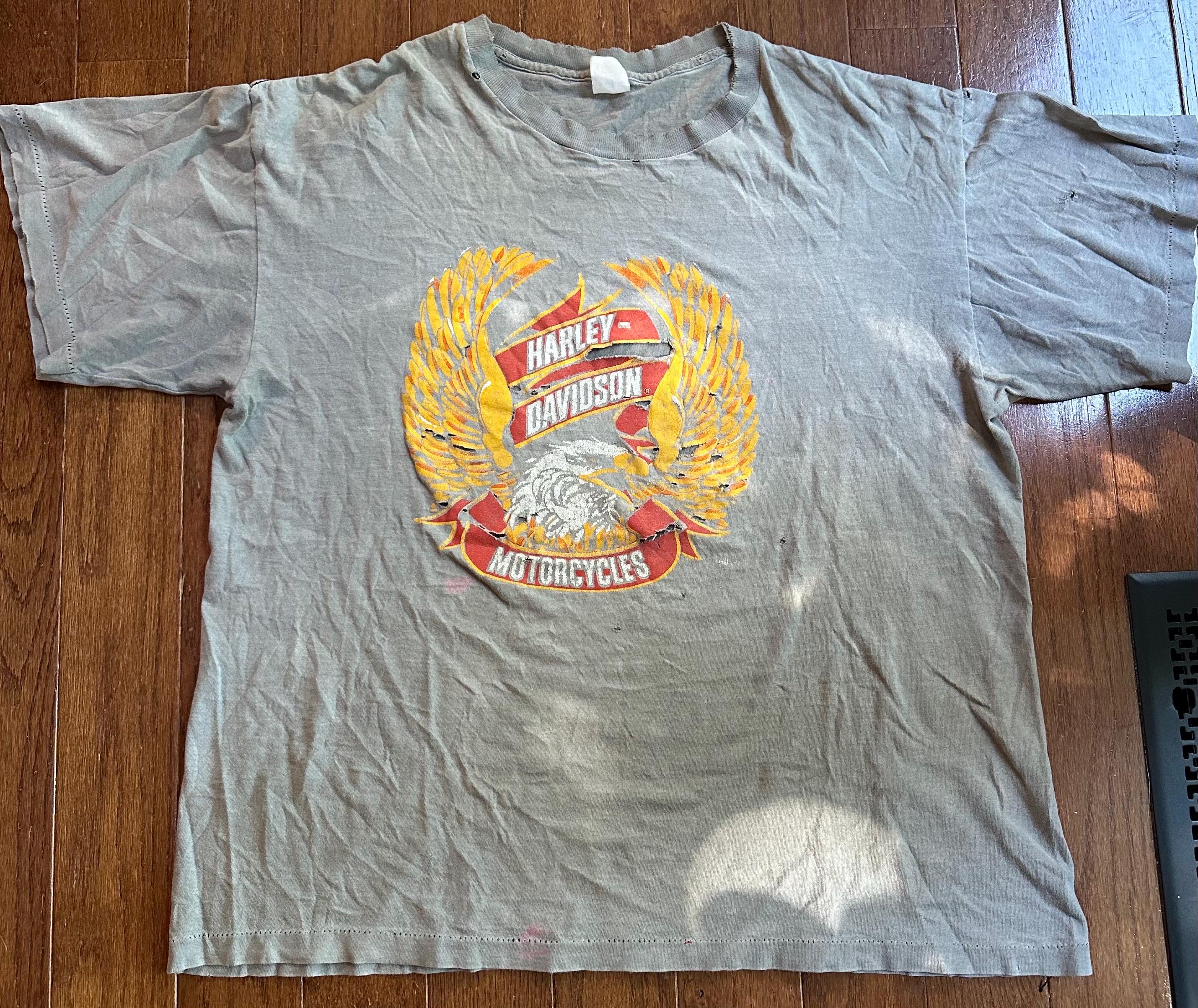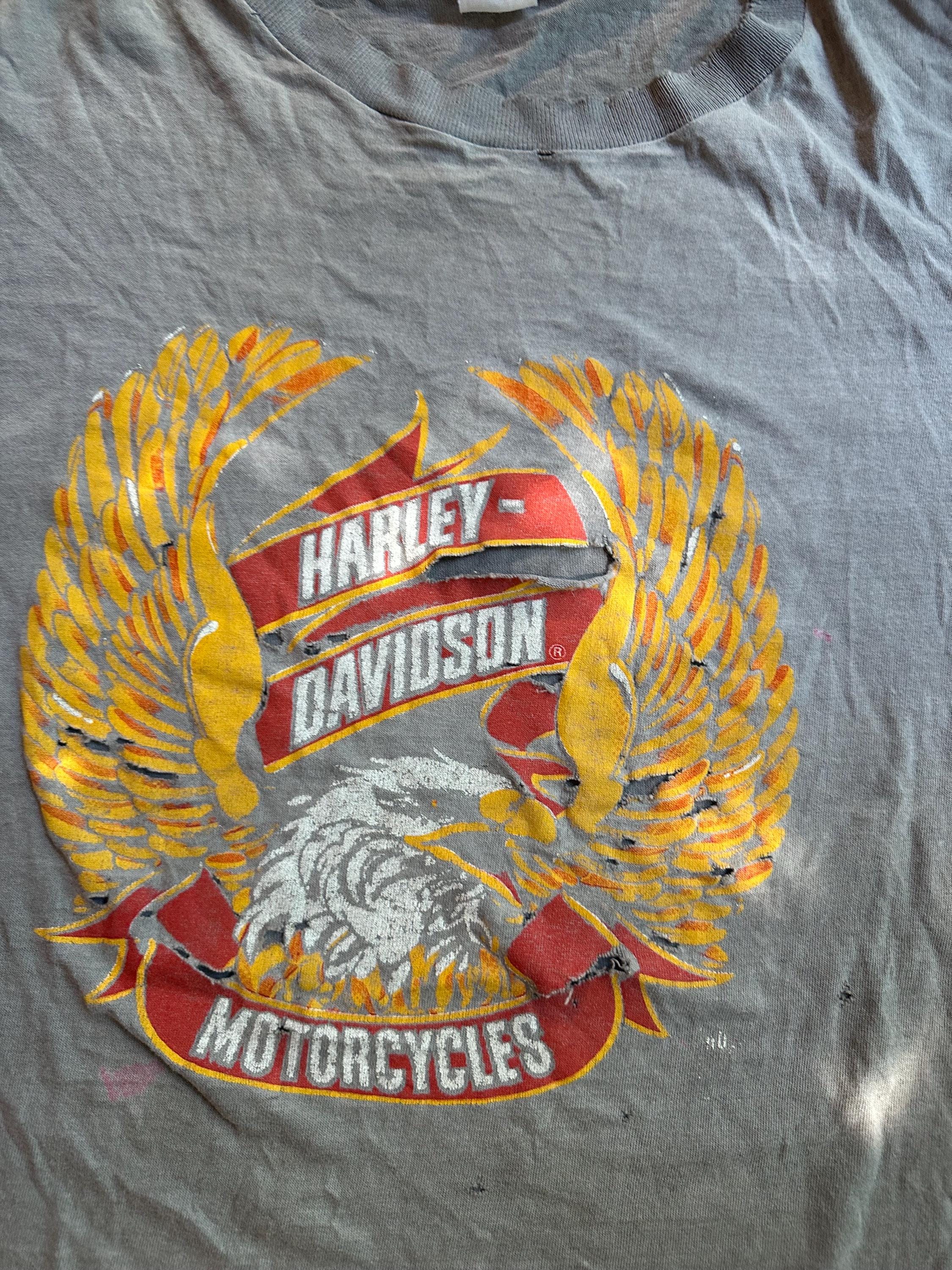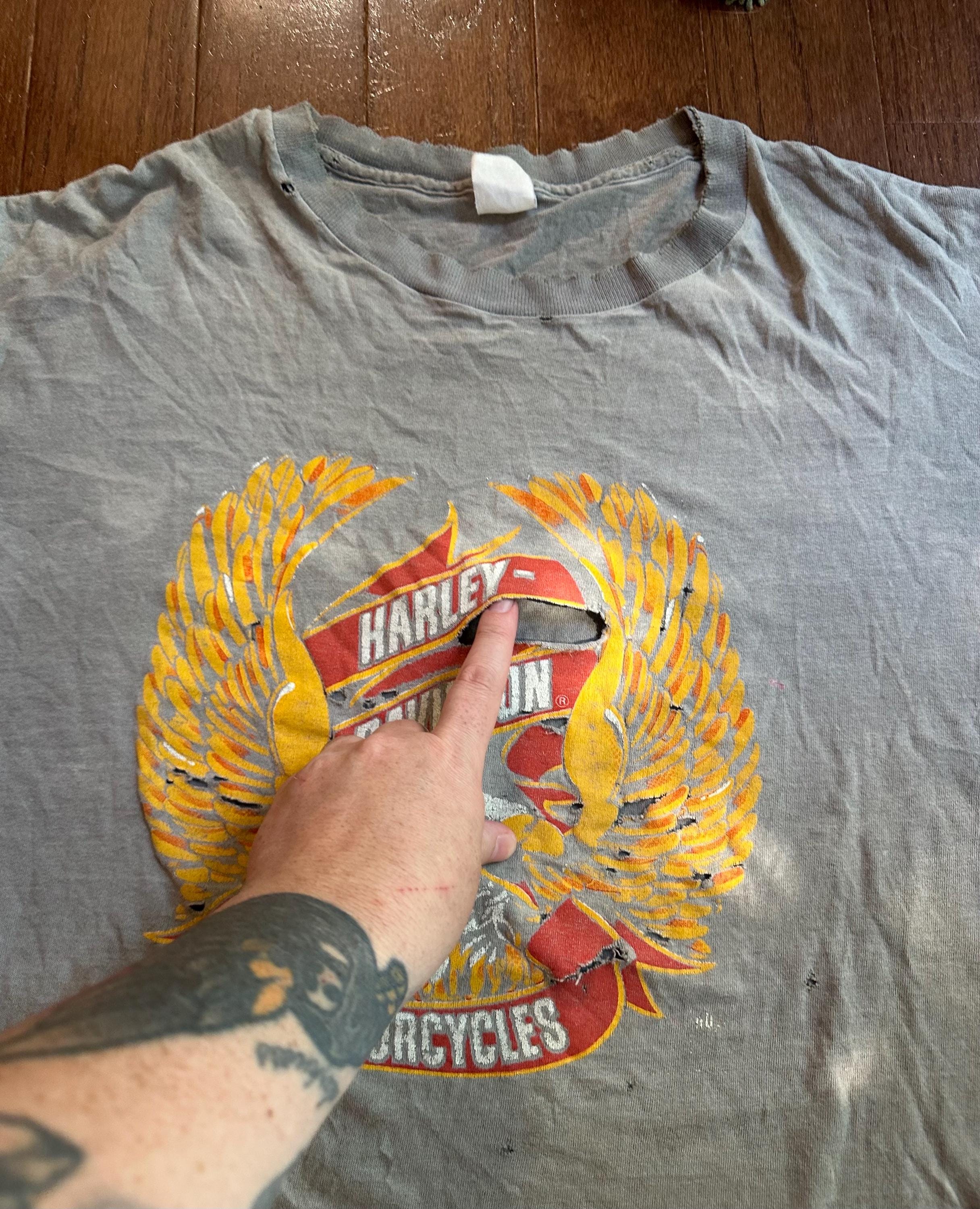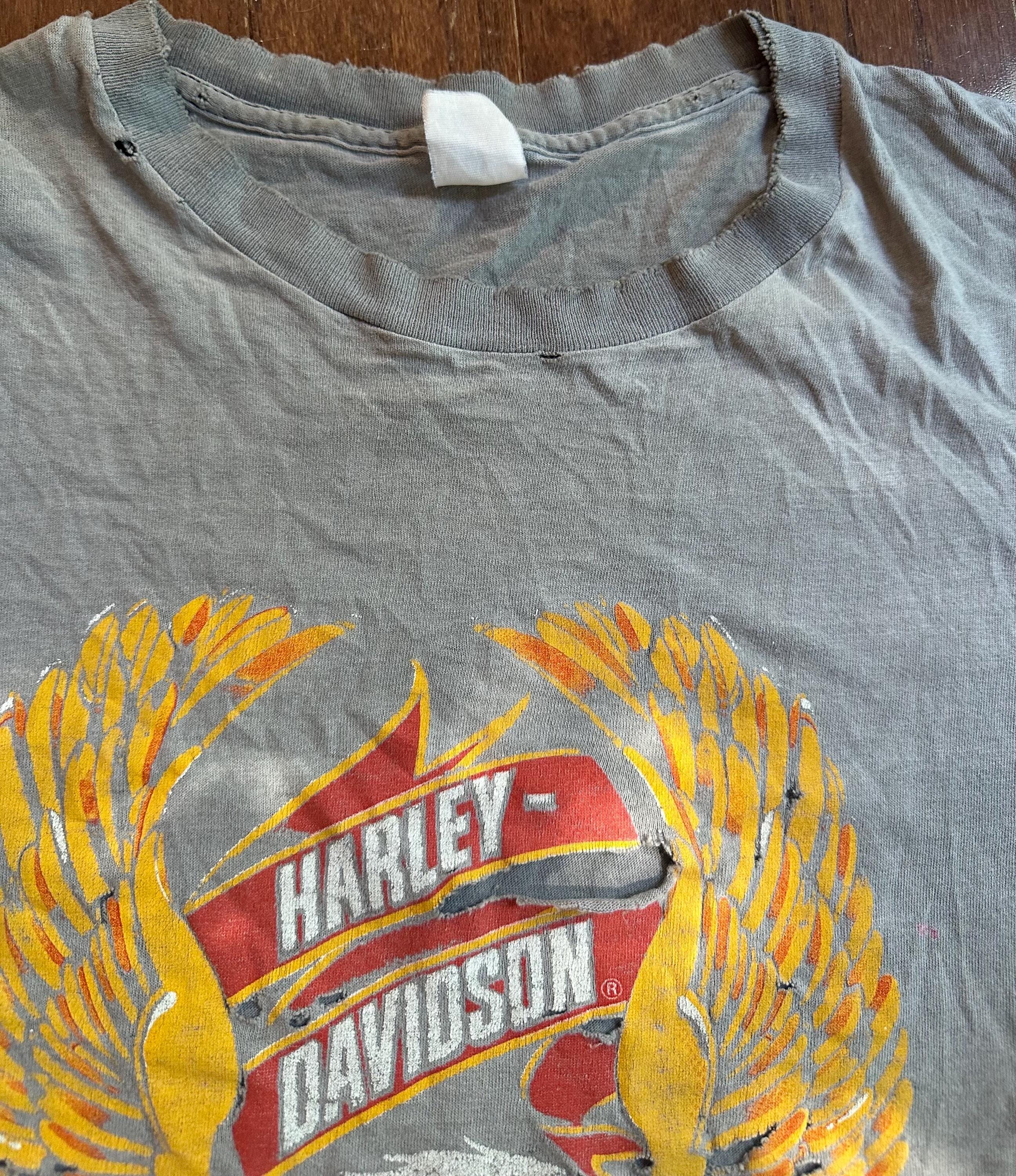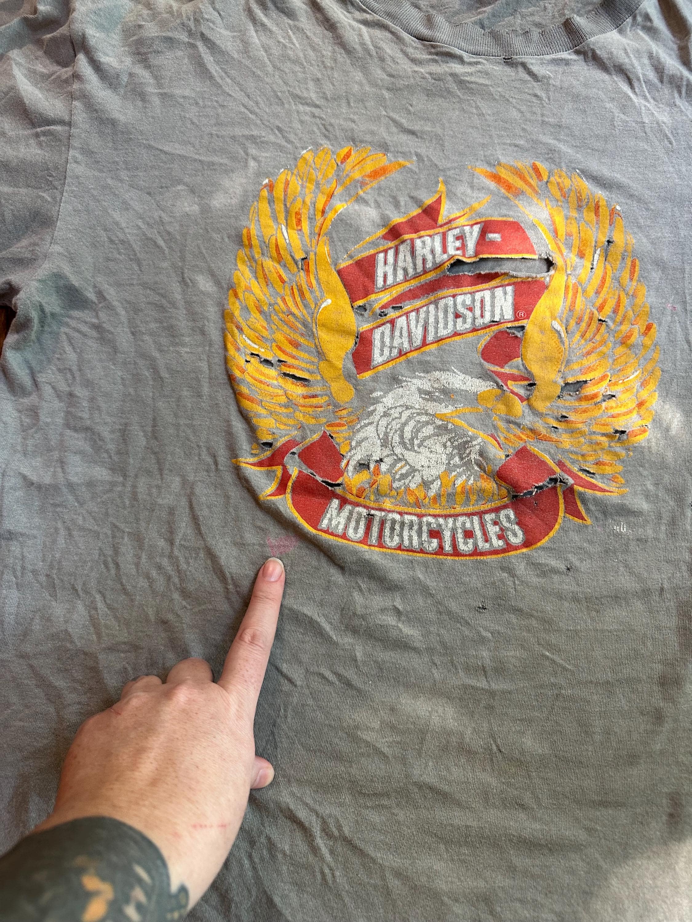 This is the perfect thrashed Harley tee for collectors who love authentic vintage wear.