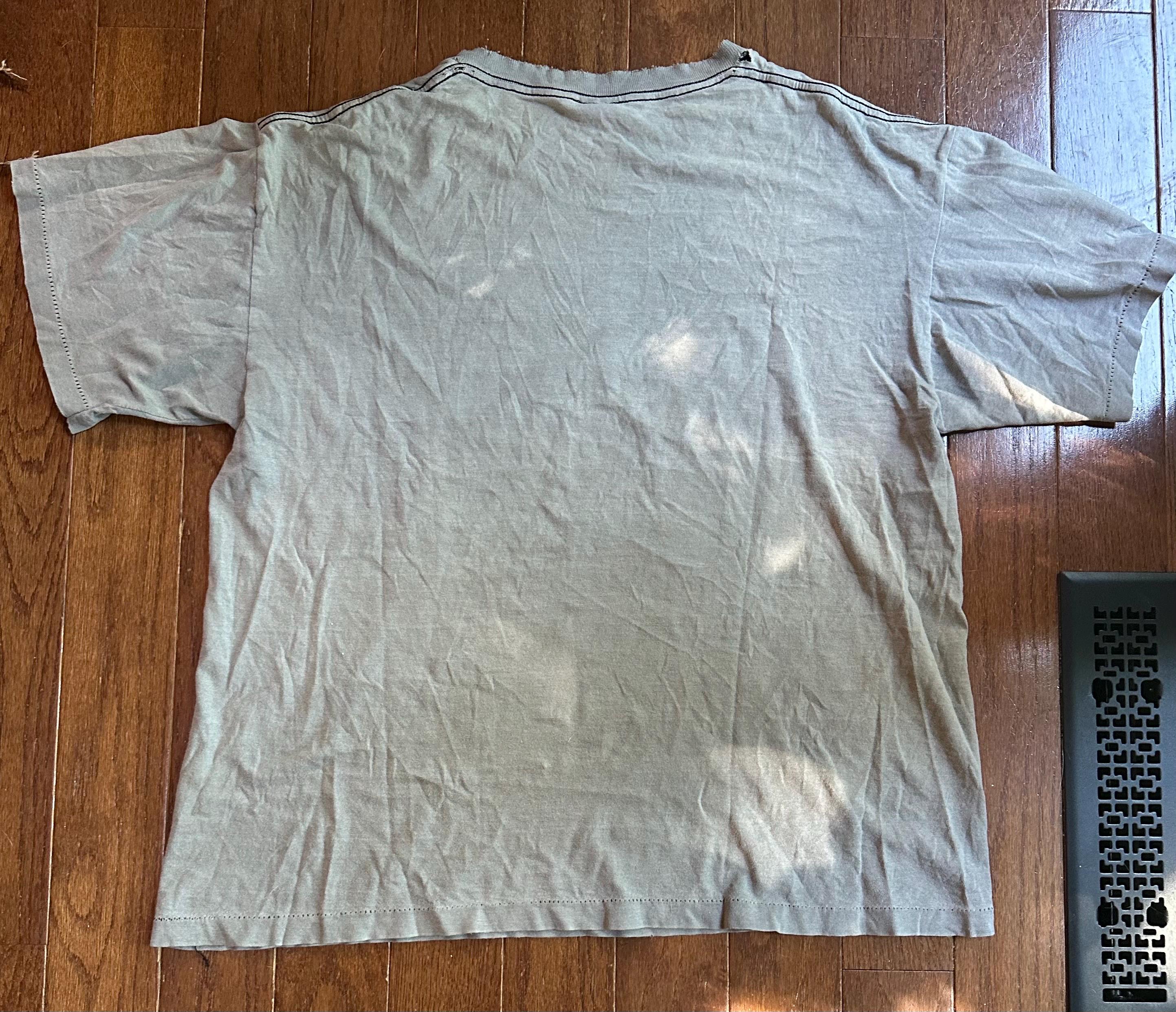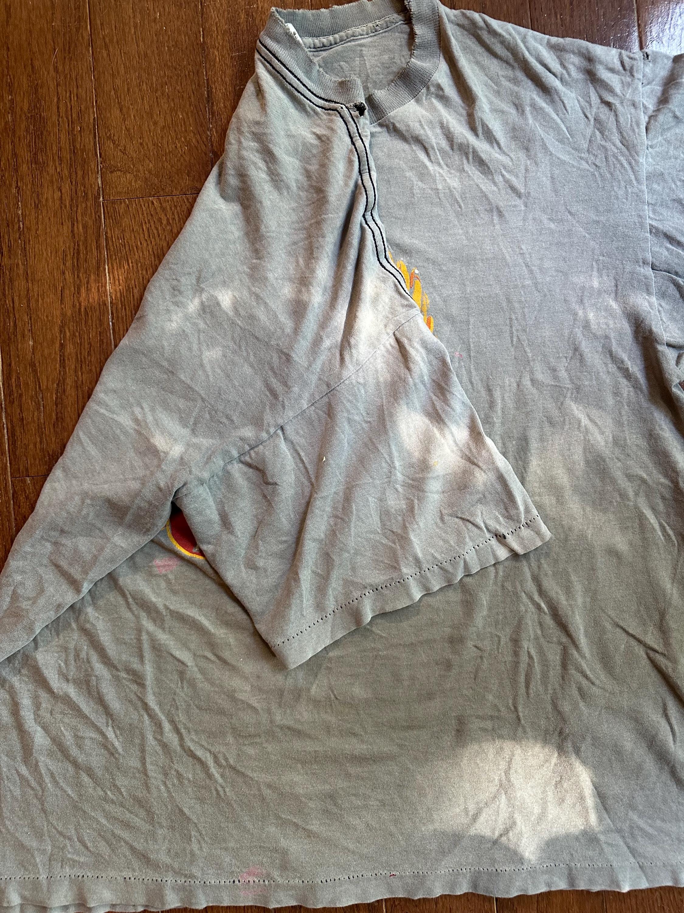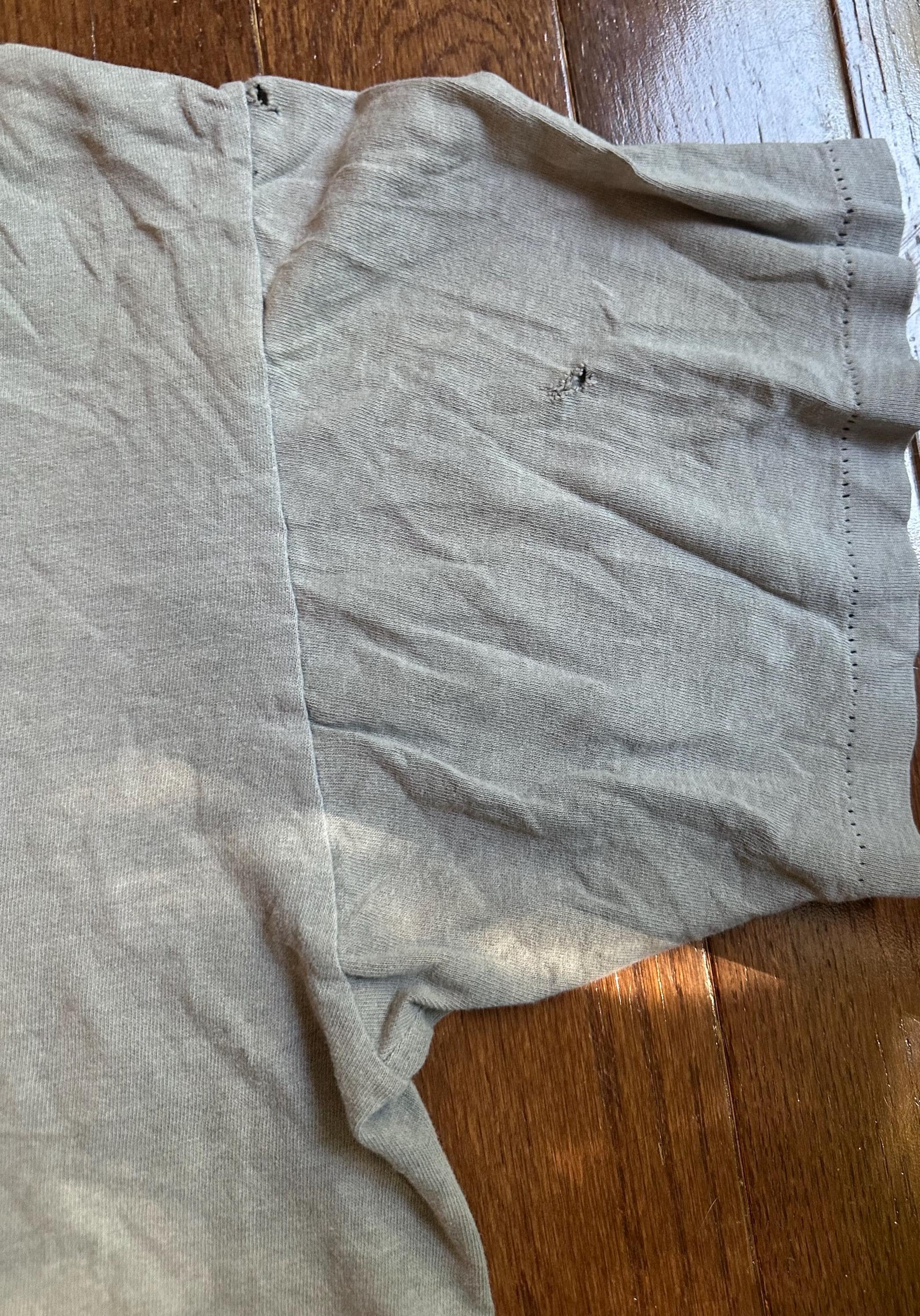 This tee is everything a vintage Harley should be: soft, destroyed, and full of character. Light gray body with the classic Harley-Davidson Motorcycles logo front and center. It’s thrashed to perfection with holes throughout, stains, and a torn neckline that only adds to its road-worn charm.