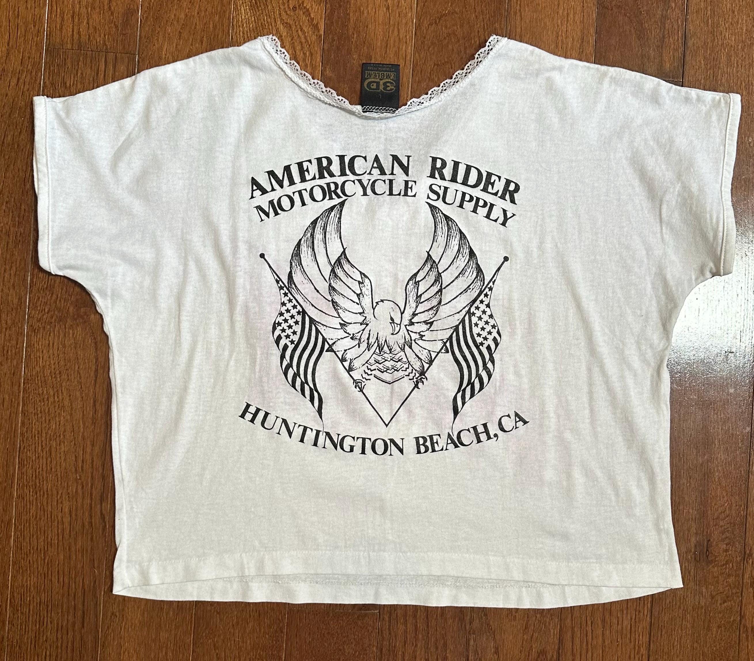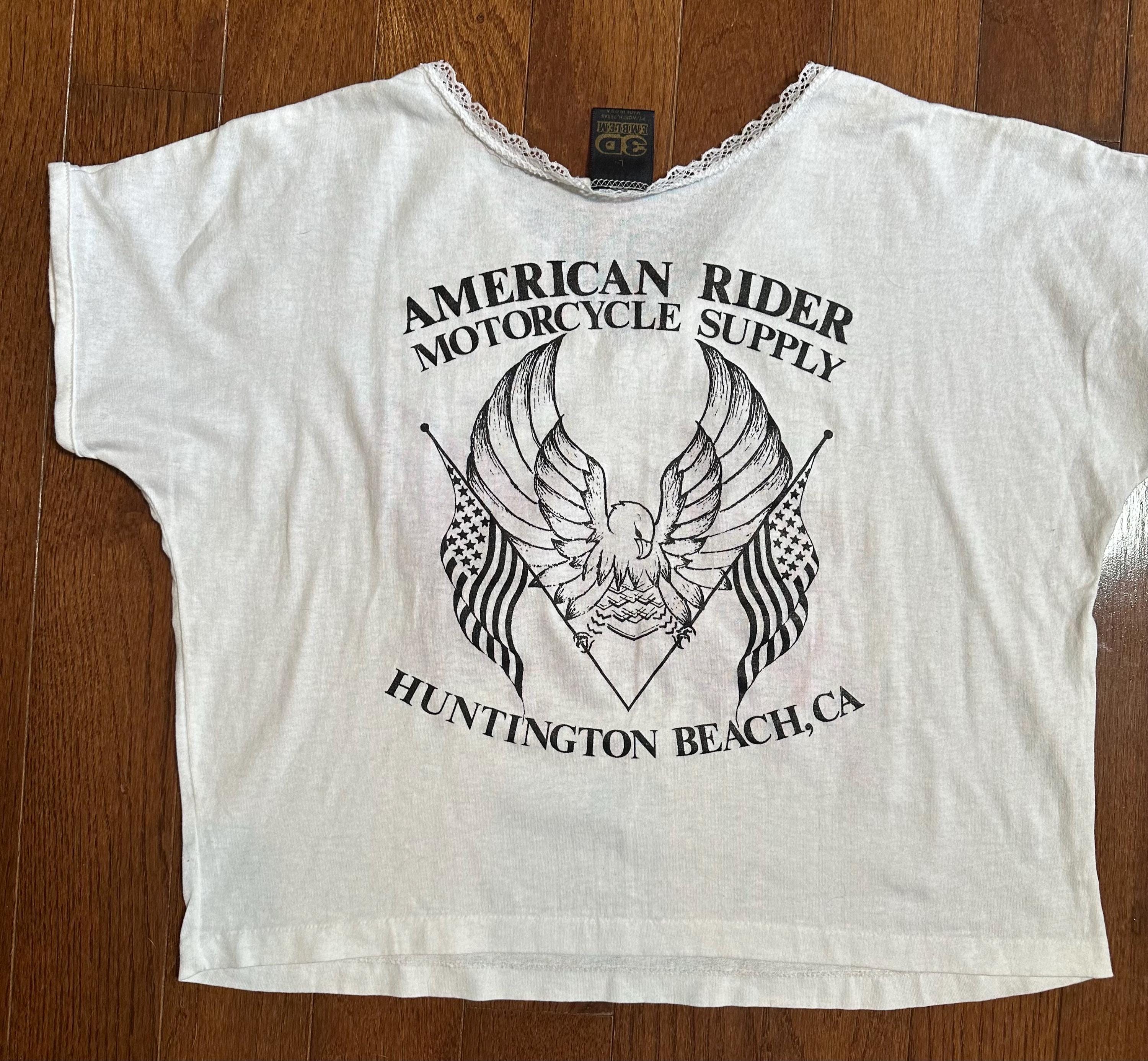 Back graphic: American Rider Motorcycle Supply, Huntington Beach, CA, with a soaring eagle and twin flags, classic Americana contrast to the colorful front.