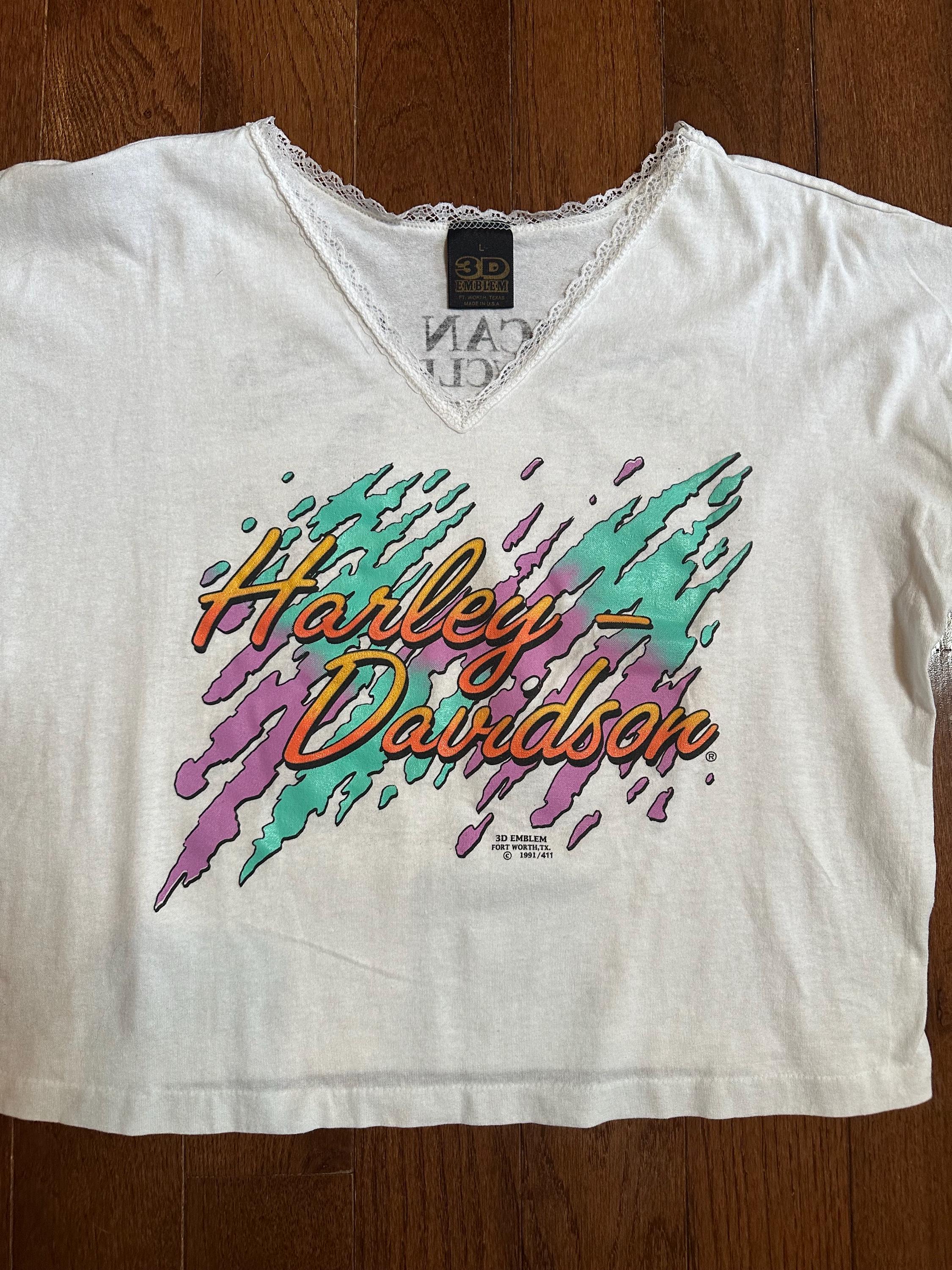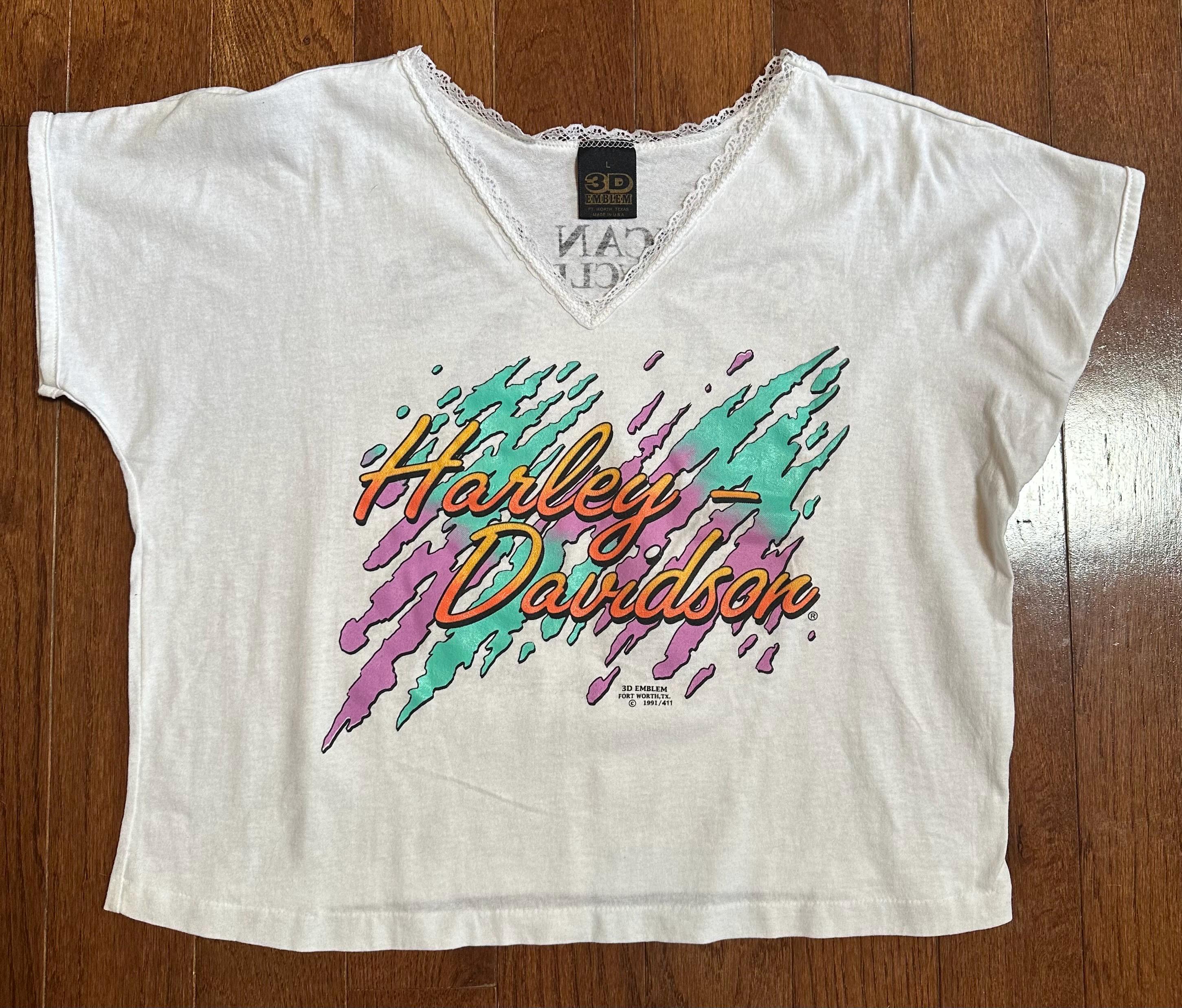 Front graphic: Harley-Davidson in bold script with 3D Emblem splash print — bright, playful, and authentically 90s.