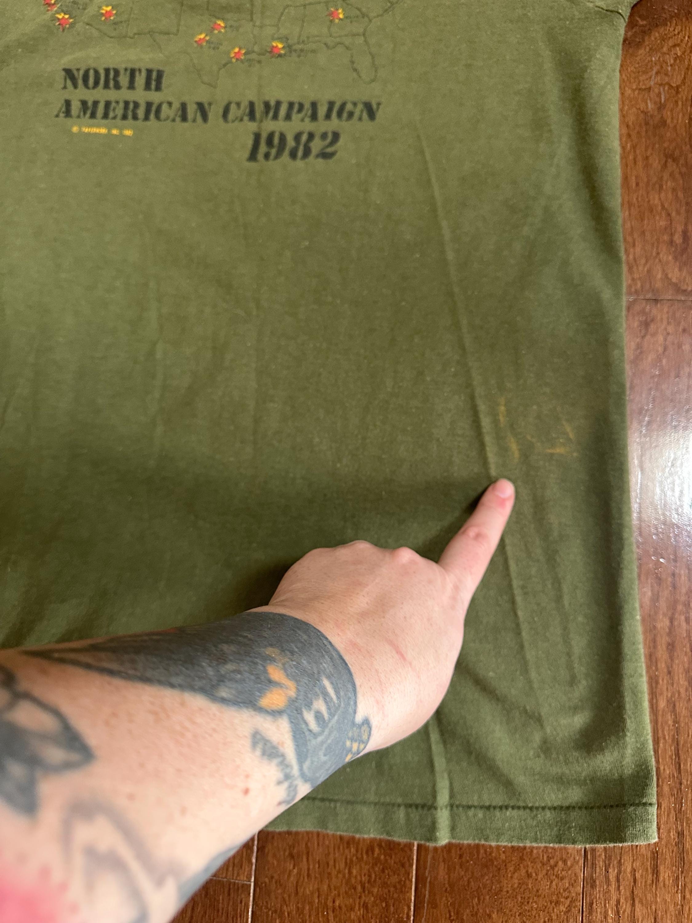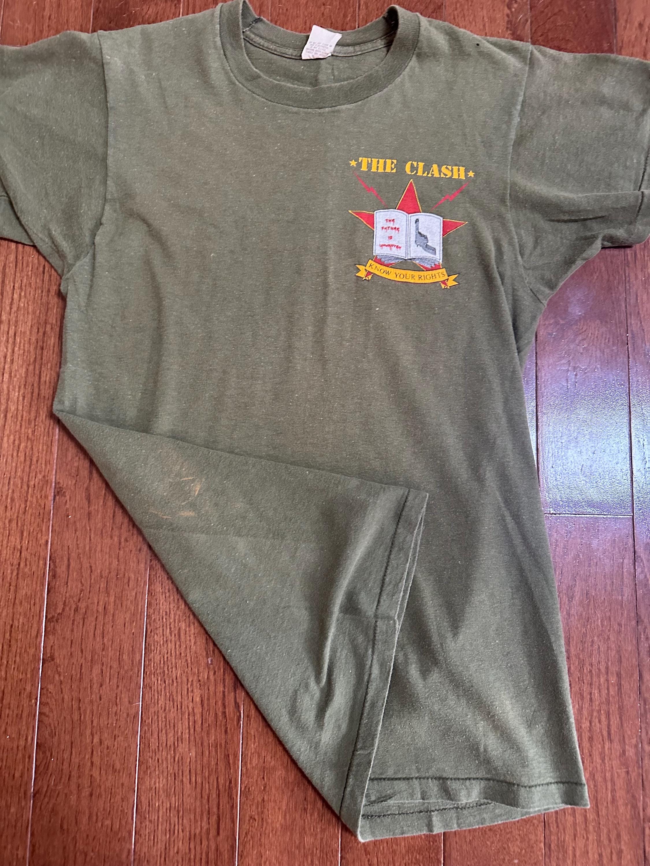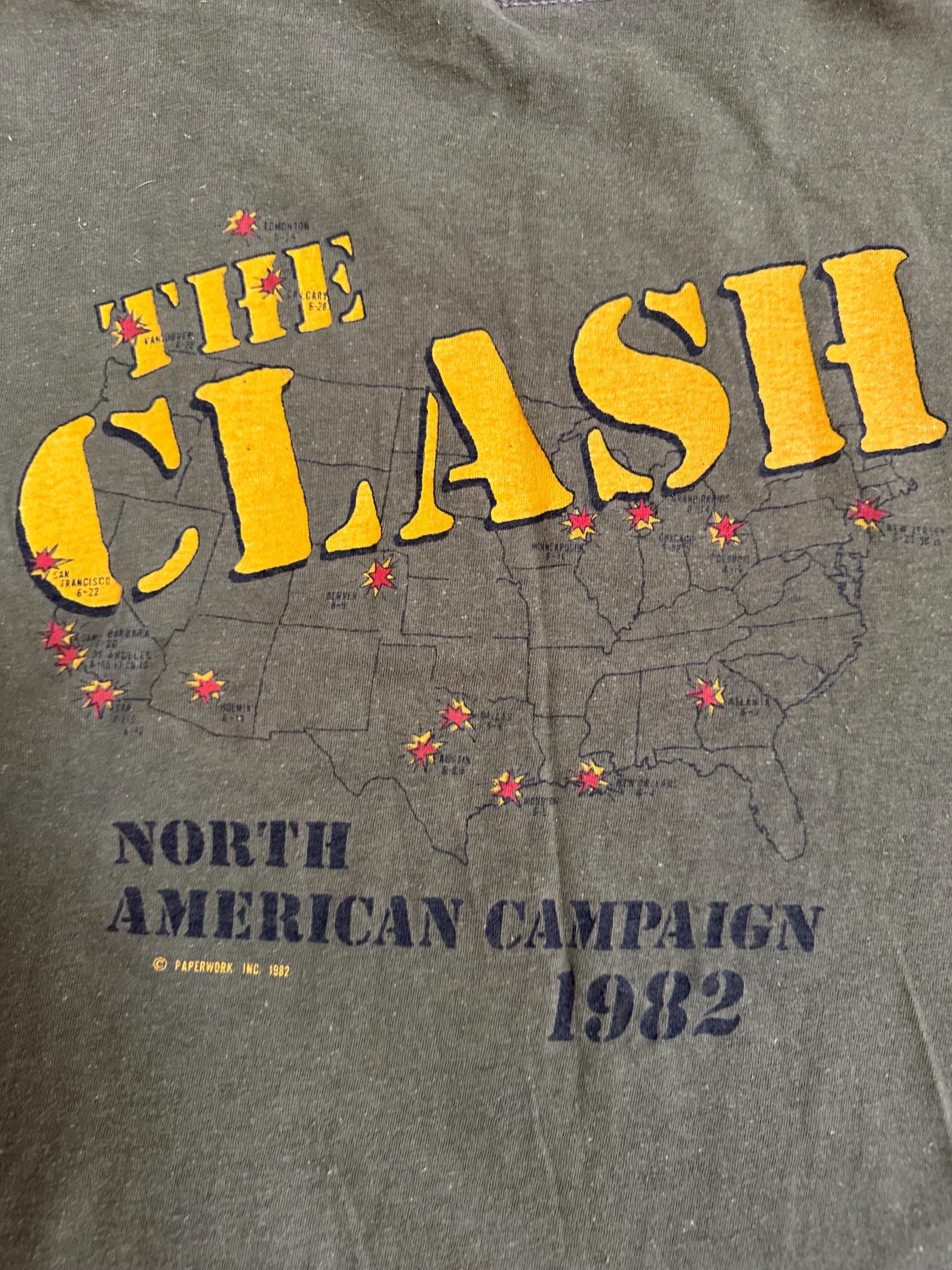 Vintage 1982 The Clash North American Campaign tour t-shirt in a rare army green. This is an early, highly sought-after punk tour tee and a true piece of music history.