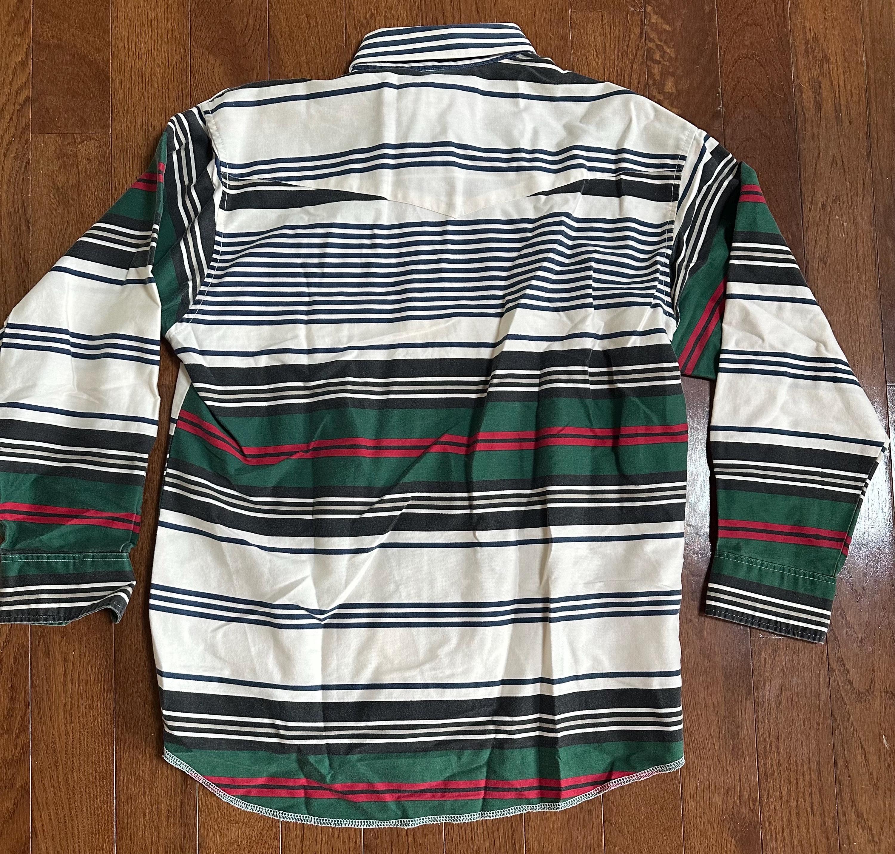 Vintage 1990s Wrangler X-Long western button down with the kind of stripe pattern that feels straight out of a modern cowboy dream. Perfectly balanced greens and reds, bold but timeless, and very true to the era.