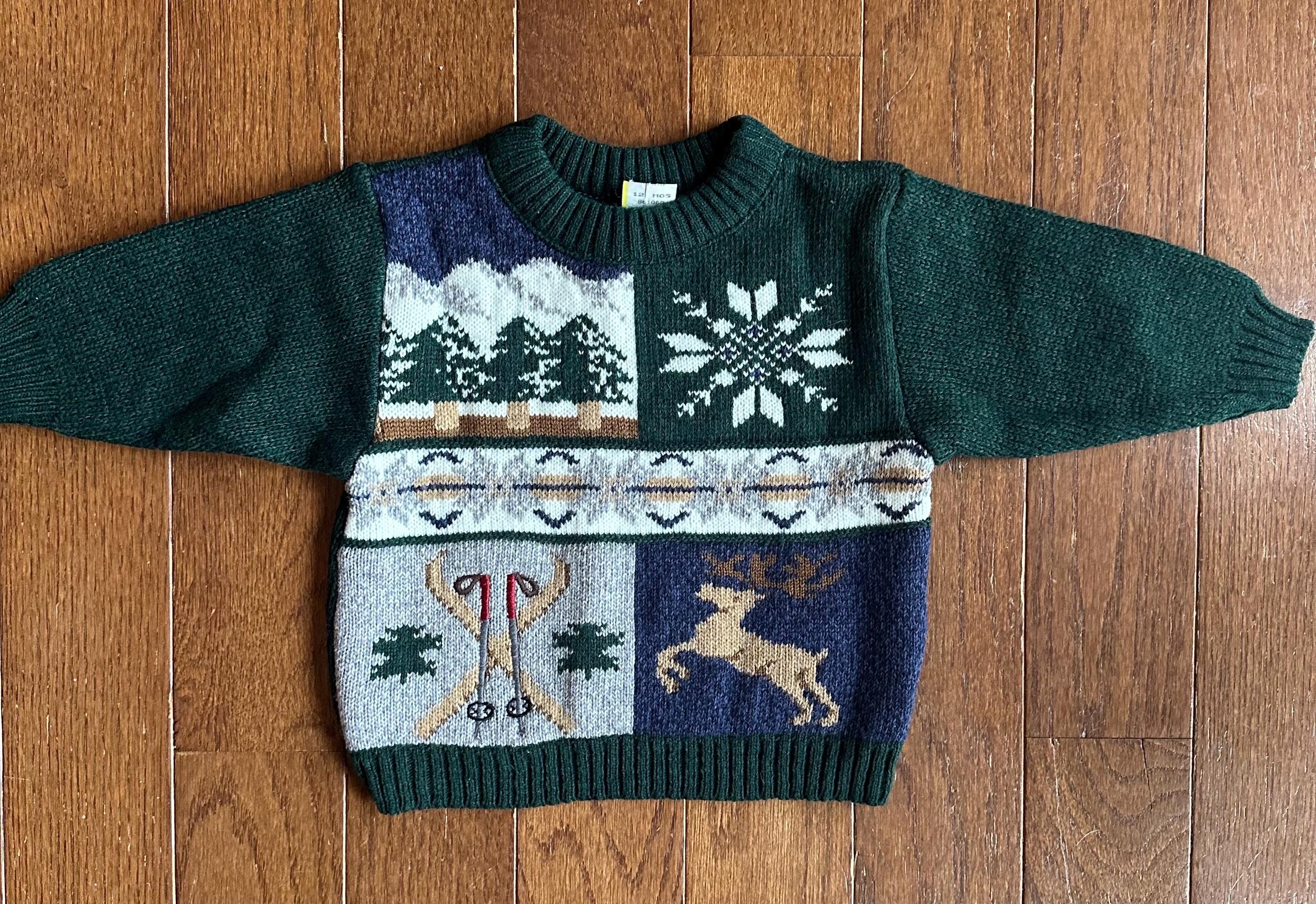 Cozy 1990s kids ski sweater in a rich hunter green with classic embroidered ski details. A timeless little piece that feels nostalgic and perfect for winter wear, photos, or gifting.