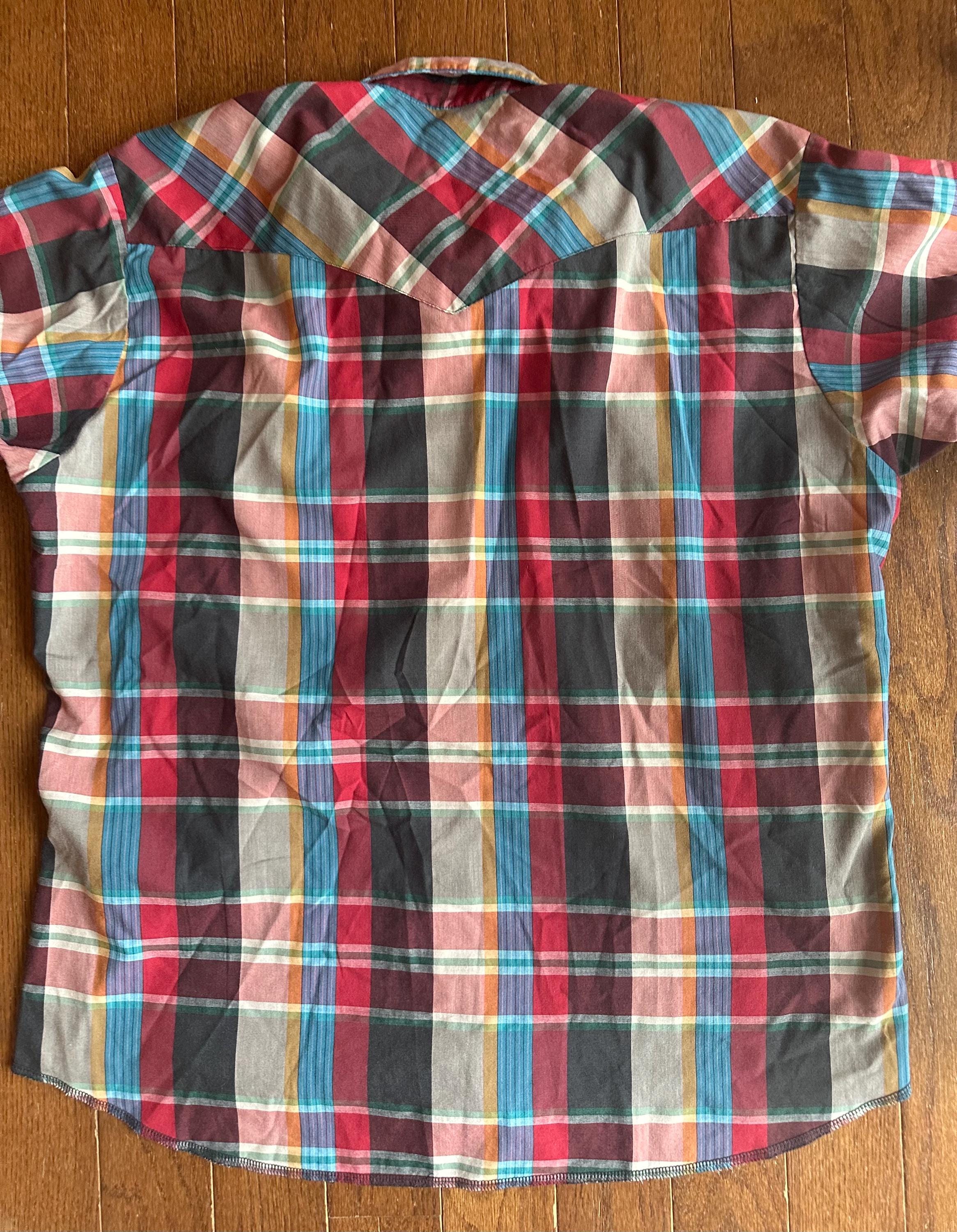 A true western classic from Wrangler, dating to the late 1980s to early 1990s. This short sleeve button down features beautiful, saturated color tones that feel straight out of wide-open country and long summer days.