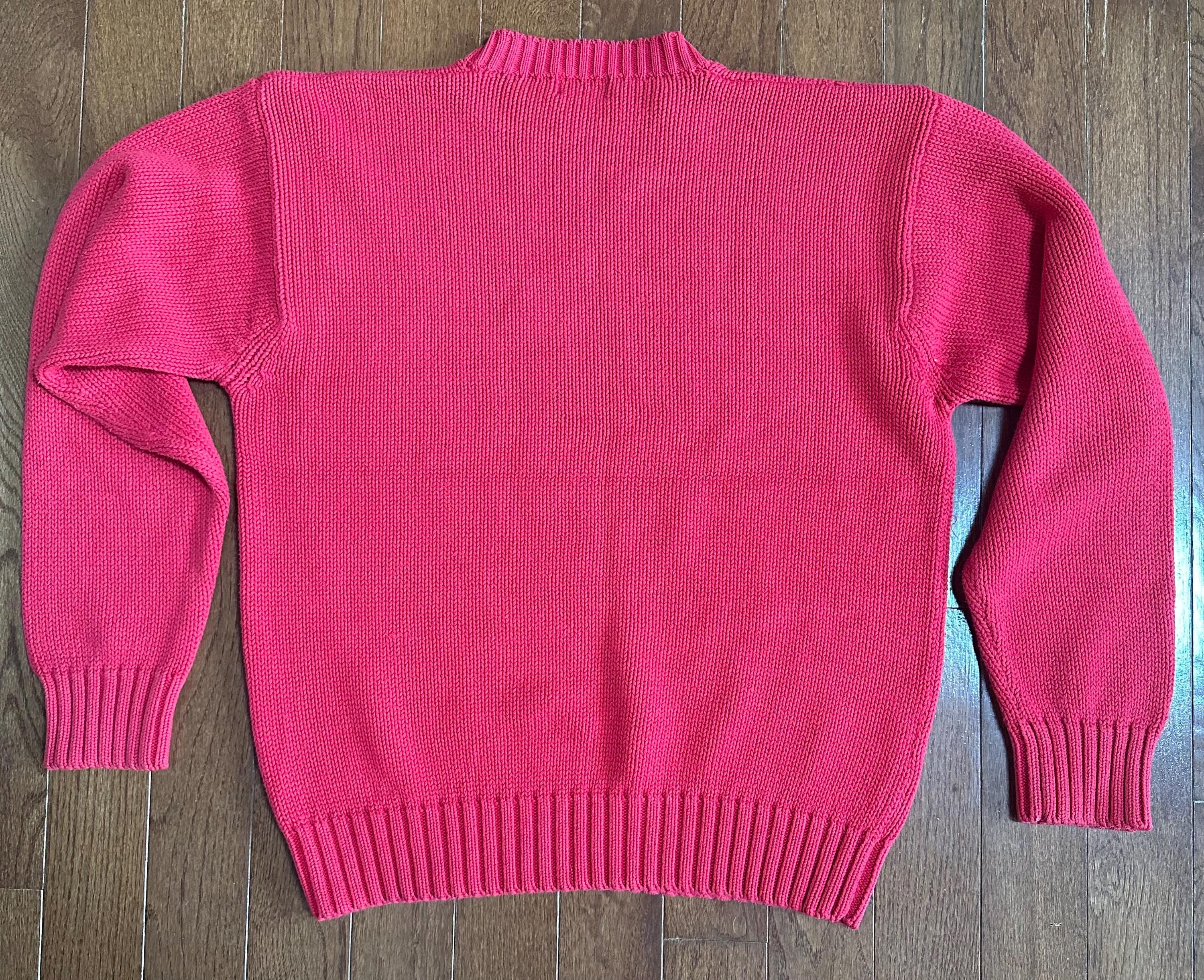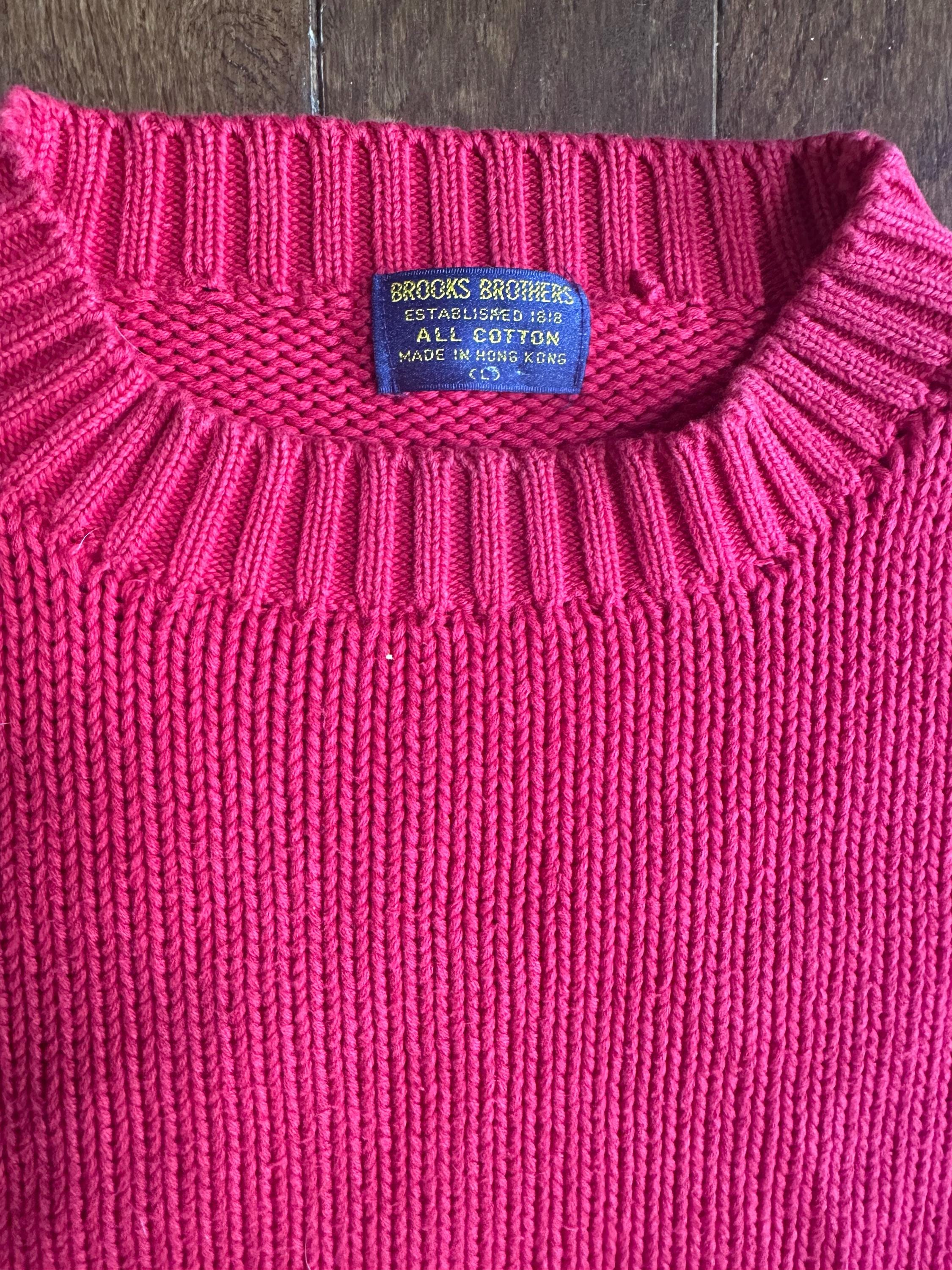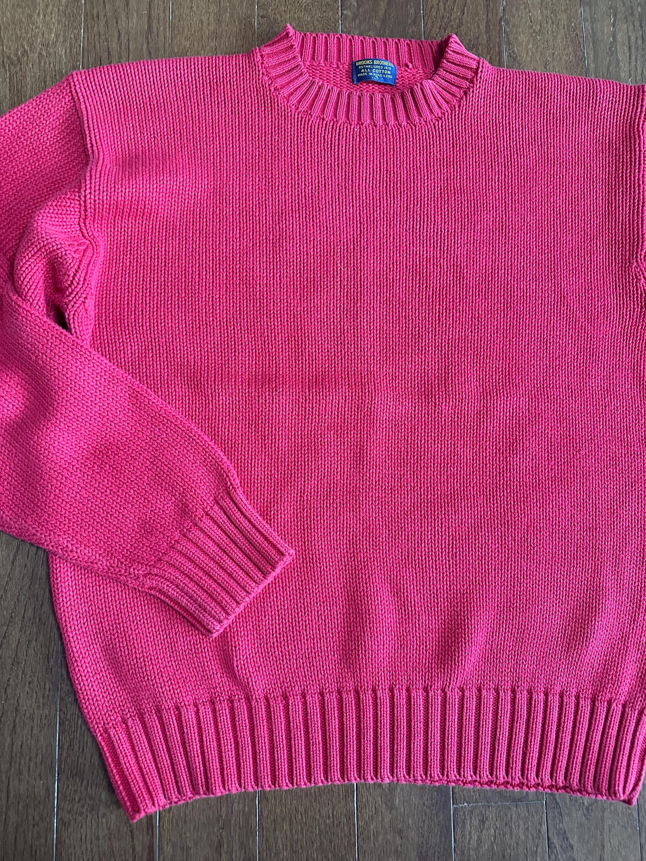 A heavy, beautifully made Brooks Brothers sweater that fits right into the Alpine Layers collection. Crafted from 100 percent cotton with that classic late 80s to early 90s color palette, this is the kind of timeless layer built for cool mornings and mountain air. The weight and texture give it real substance, while the relaxed fit makes it easy to throw on over a tee or button-down. There are a few small snags throughout, consistent with age and wear, but nothing that takes away from the overall look or feel. A true cold-weather staple with lasting character. Small yellow paint stain on sleeve.