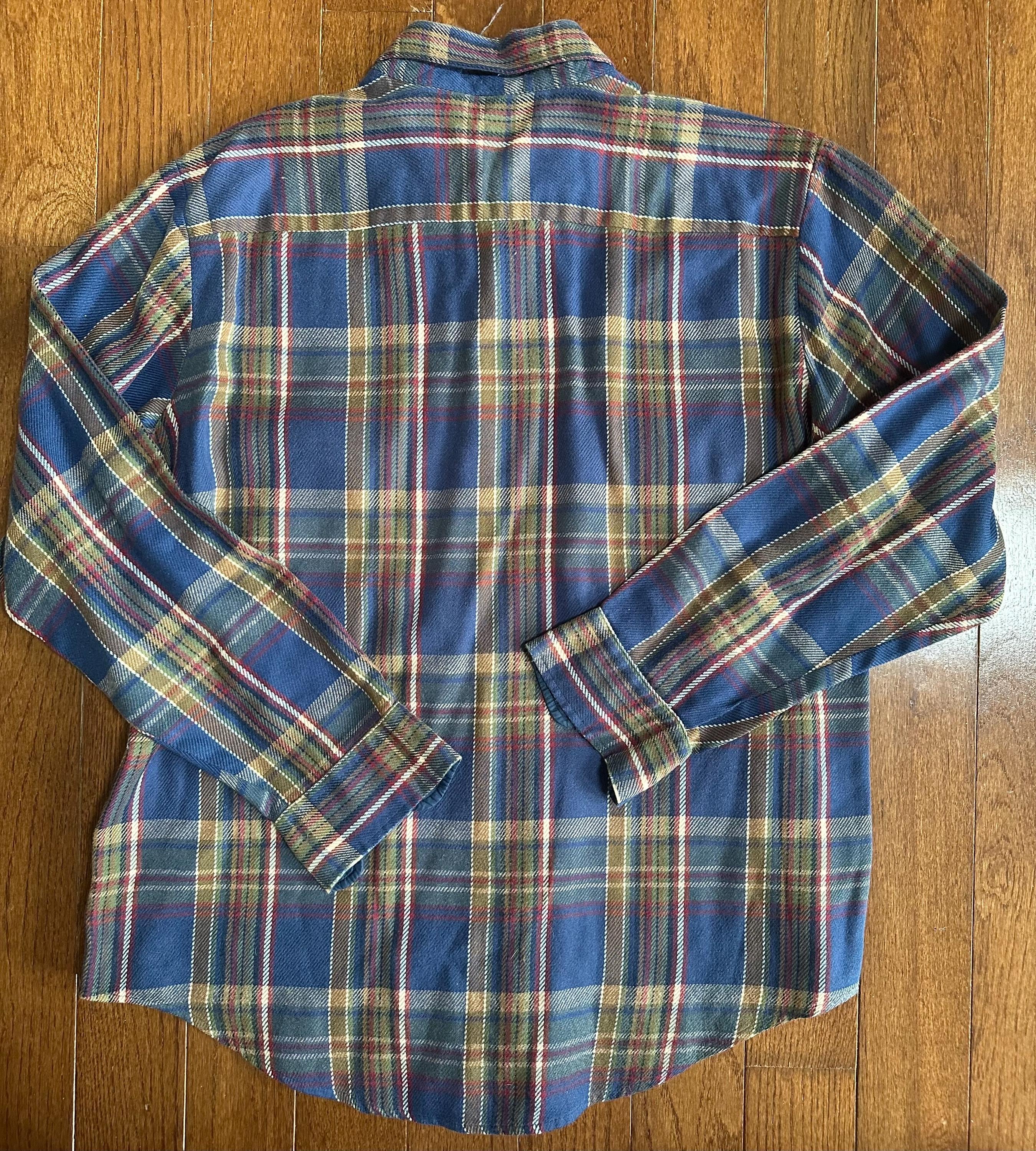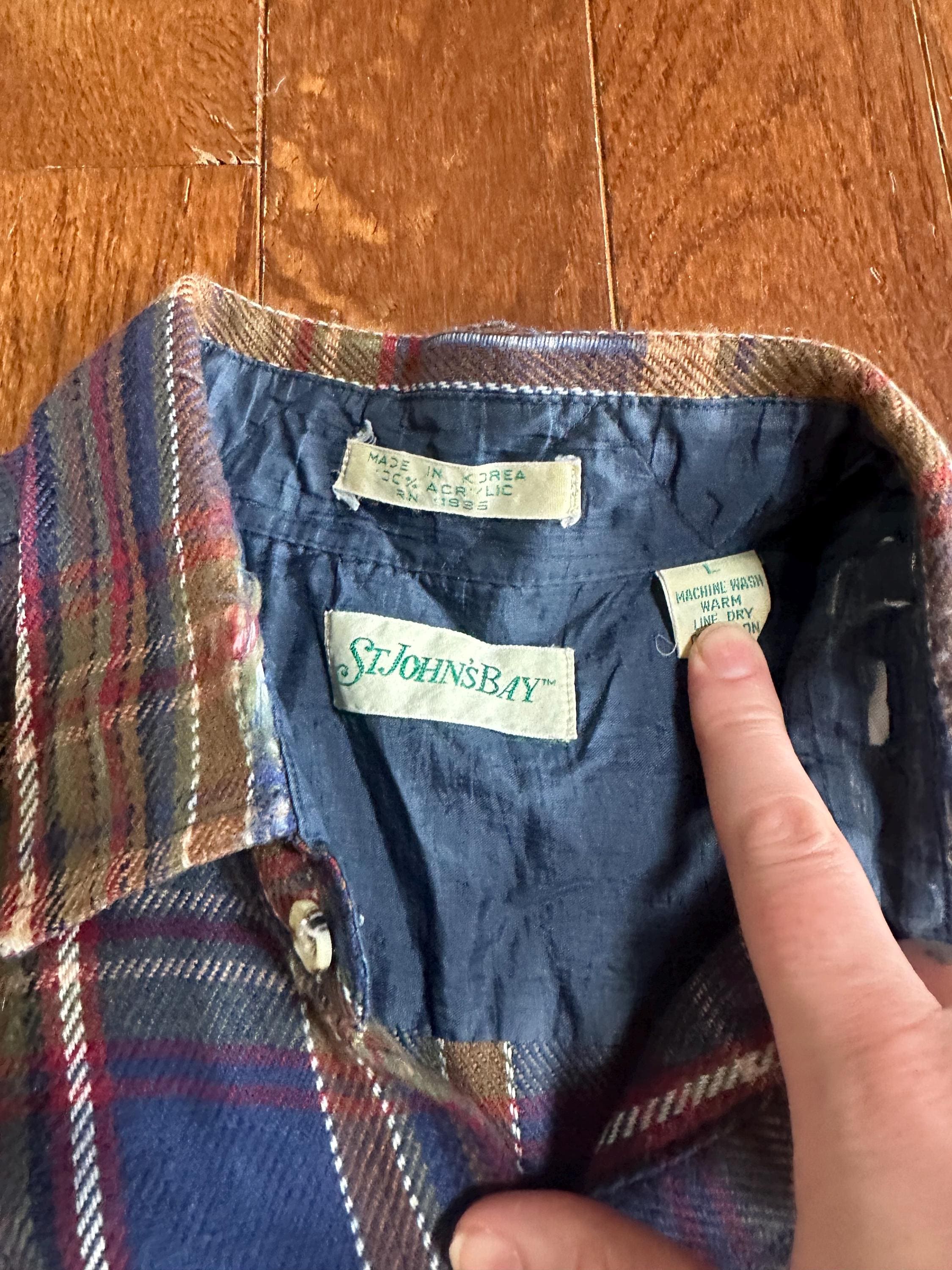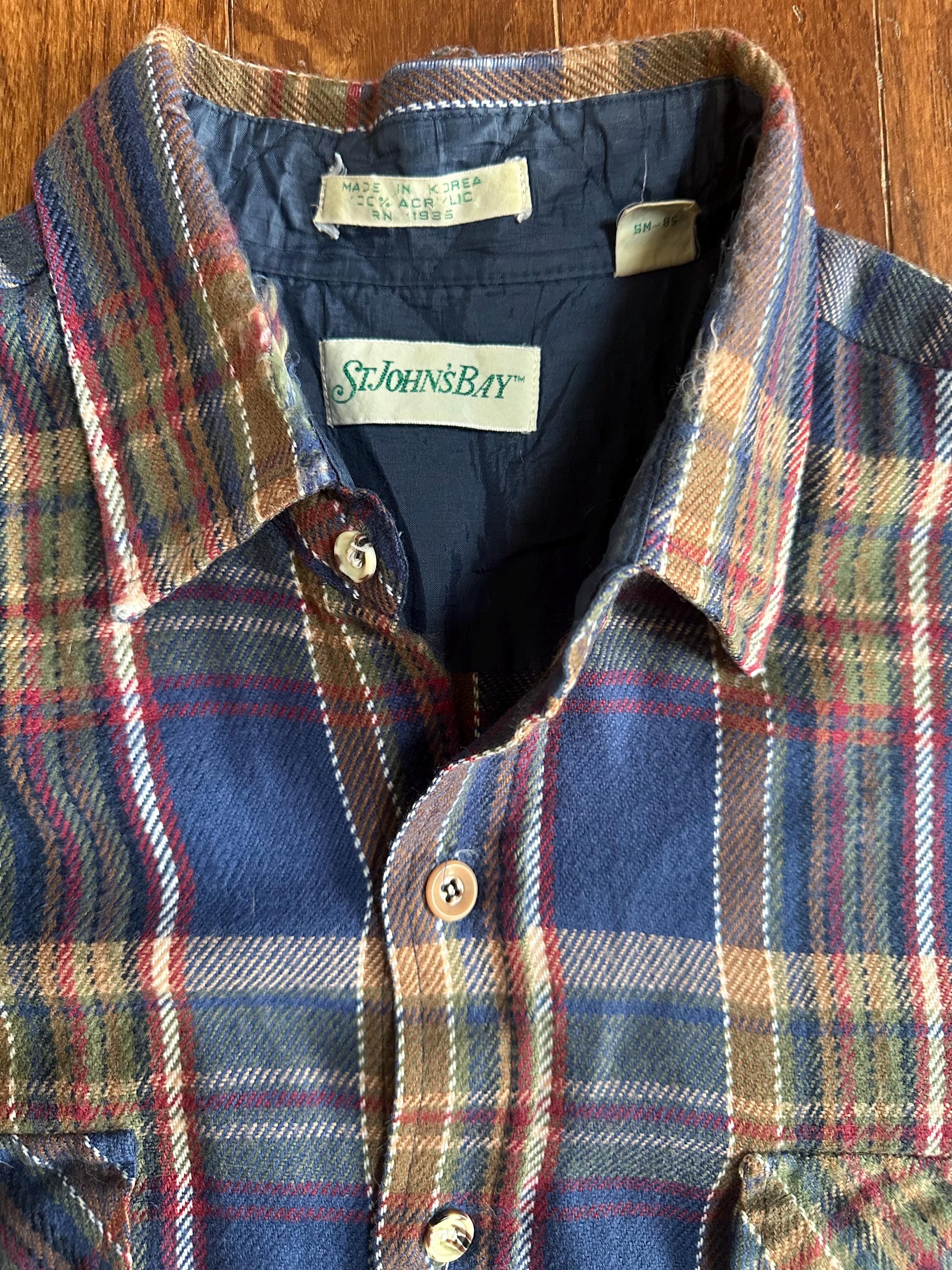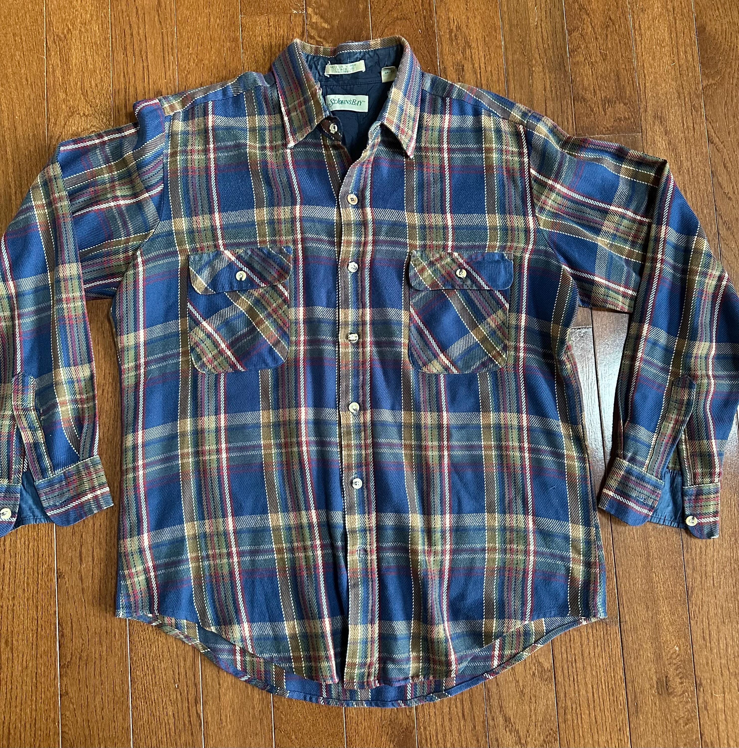 A heavily worn St. John’s Bay flannel that feels like it’s been everywhere, from cold mornings in the mountains to long nights around a campfire. Likely dating to the 1970s, this flannel shows its age in the best way. The buttons have been re-sewn, and there is wear and ripping throughout, each mark adding to the story rather than taking away from it. This is not a pristine piece, it’s a lived-in layer meant for someone who appreciates true vintage character, patina, and history. A perfect Alpine Layers piece with real soul.