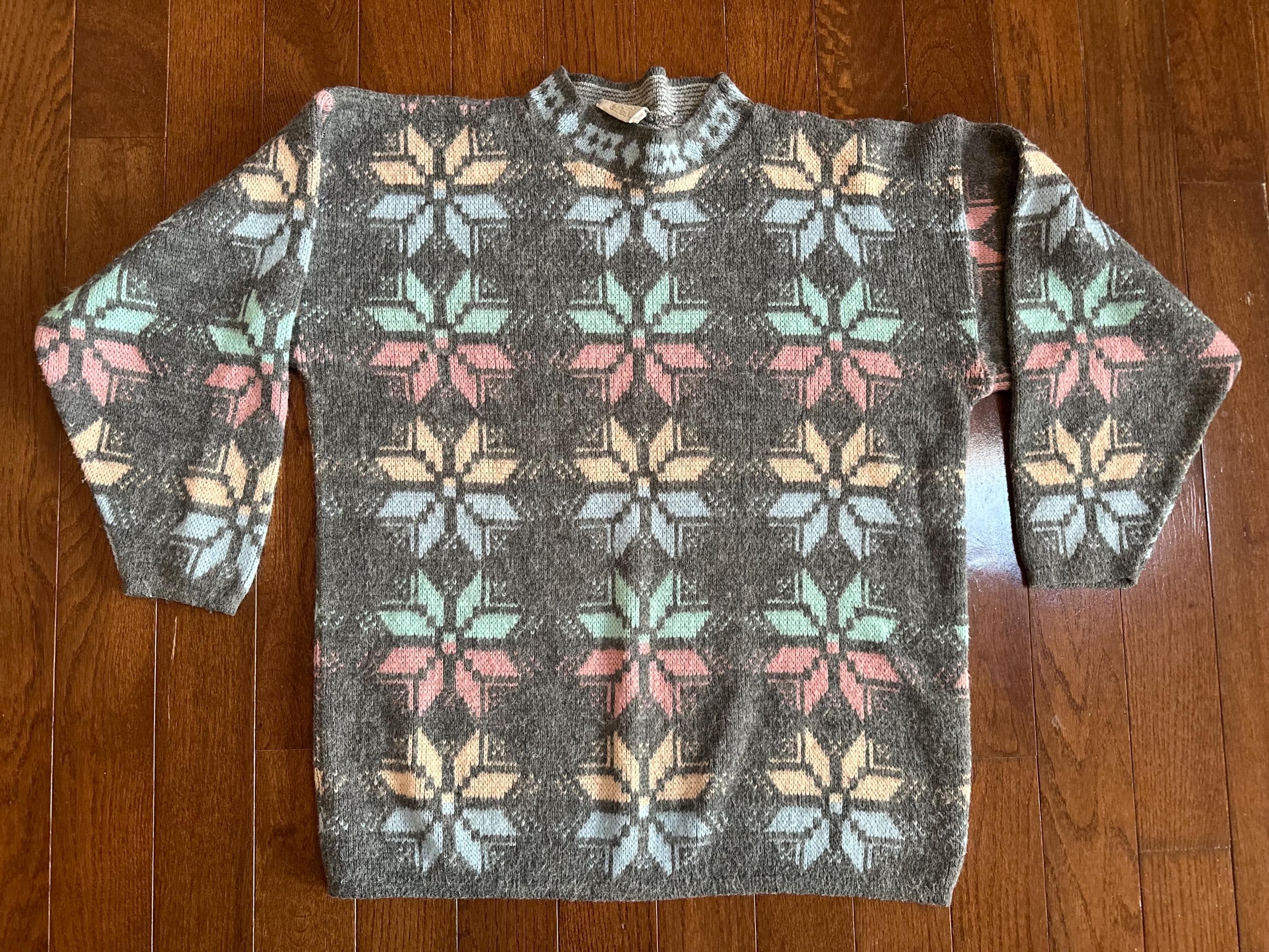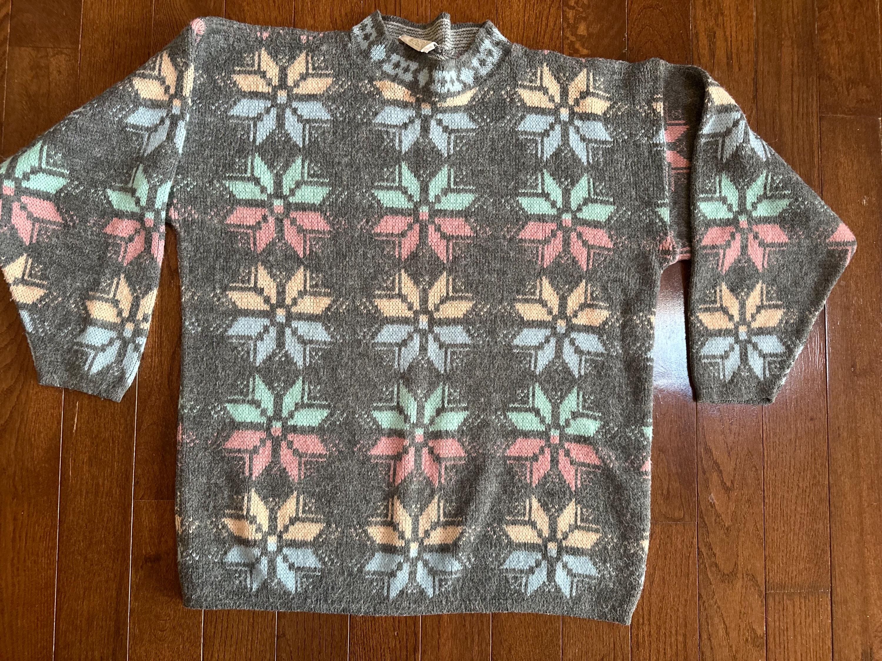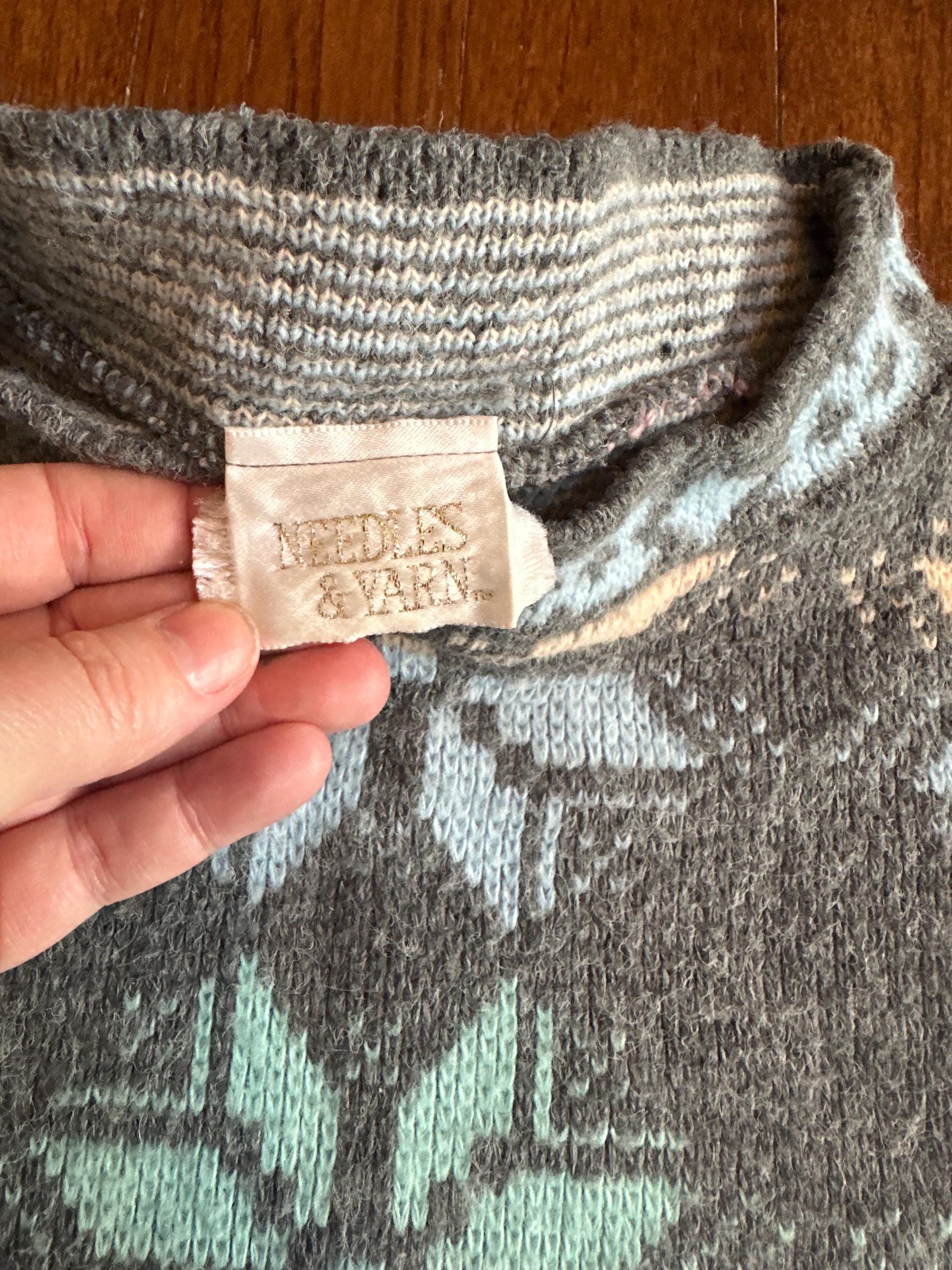 A beautifully soft 1990s sweater by Needles & Yarn in a muted mix of pale pinks, blues, peaches, and gray. This is the kind of sweater you imagine worn after a long day on the slopes, cozy, relaxed, and full of quiet charm. The colors feel gentle and nostalgic, and the worn-in softness gives it that just-right feel you only get with time. An easy Aspen Collection staple that’s made for layering, lounging, and cool mountain evenings.