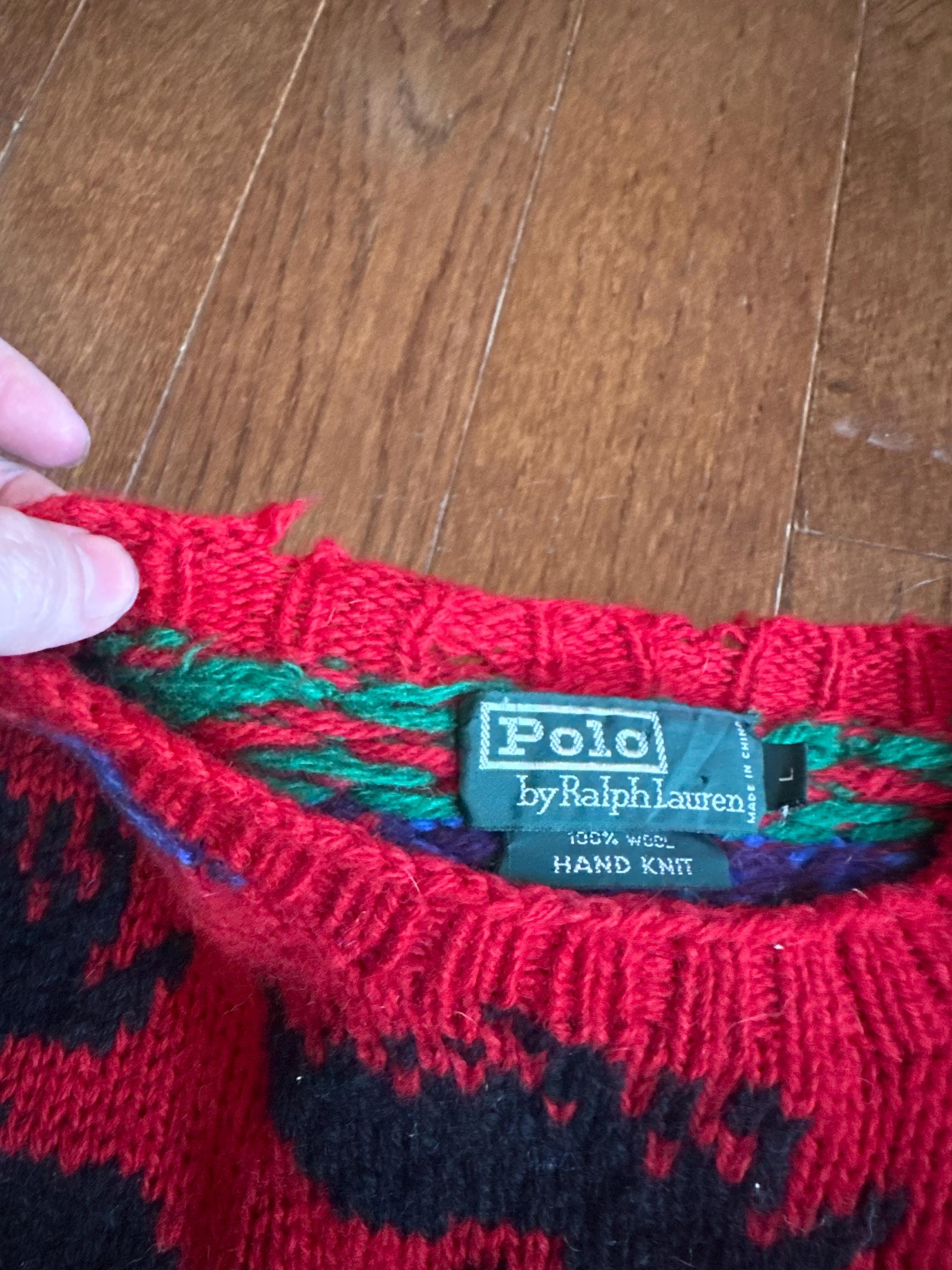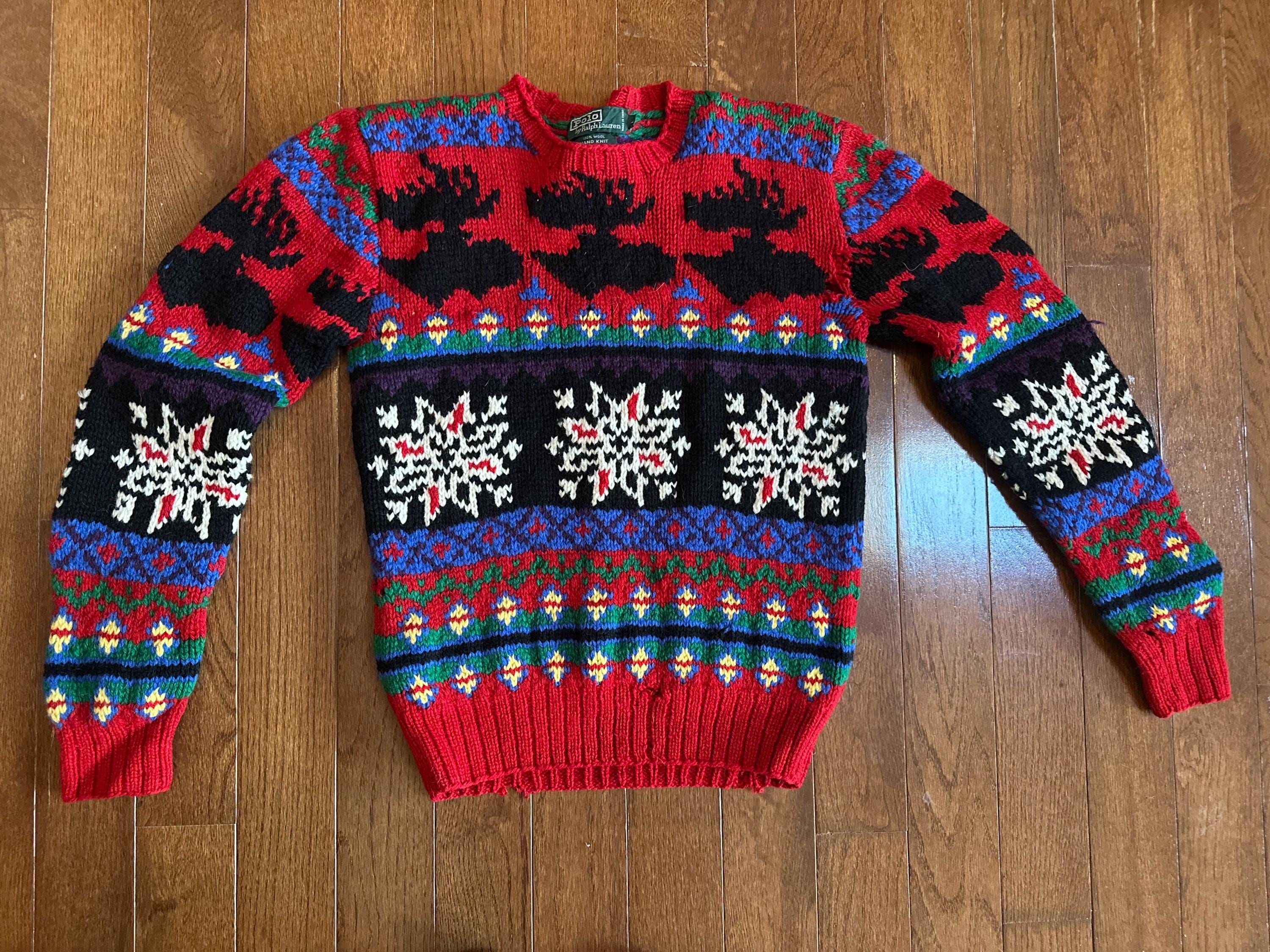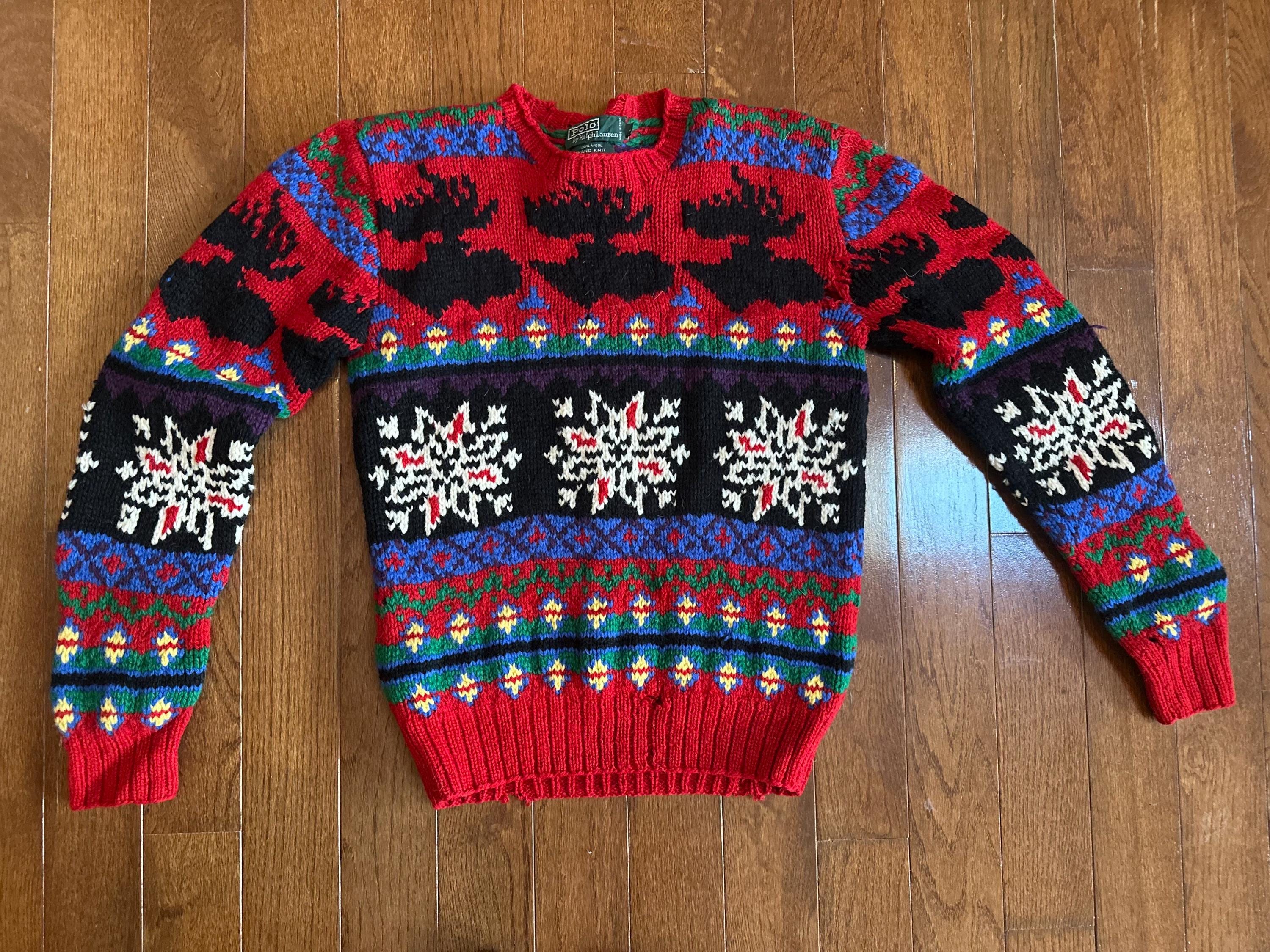 Hand-Knit Polo by Ralph Lauren Wool Ski Sweater with Moose