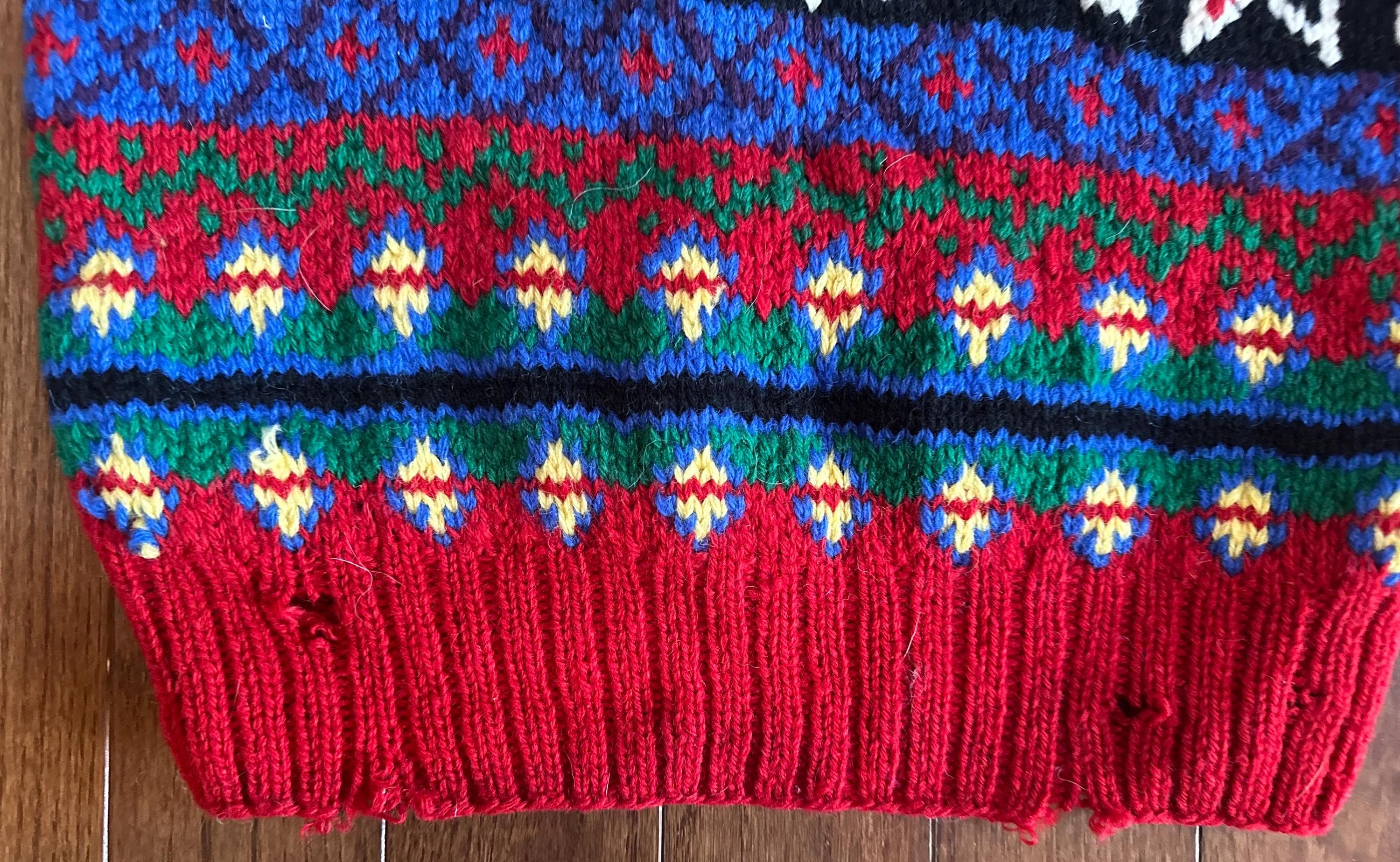 This is not a pristine sweater and it is not meant to be. The large holes throughout speak to real wear, real use, and decades of life in cold weather. It layers beautifully over thermals or shirts and delivers that authentic, lived-in alpine look that cannot be replicated. If you appreciate rugged ski sweaters with history, this is the one.