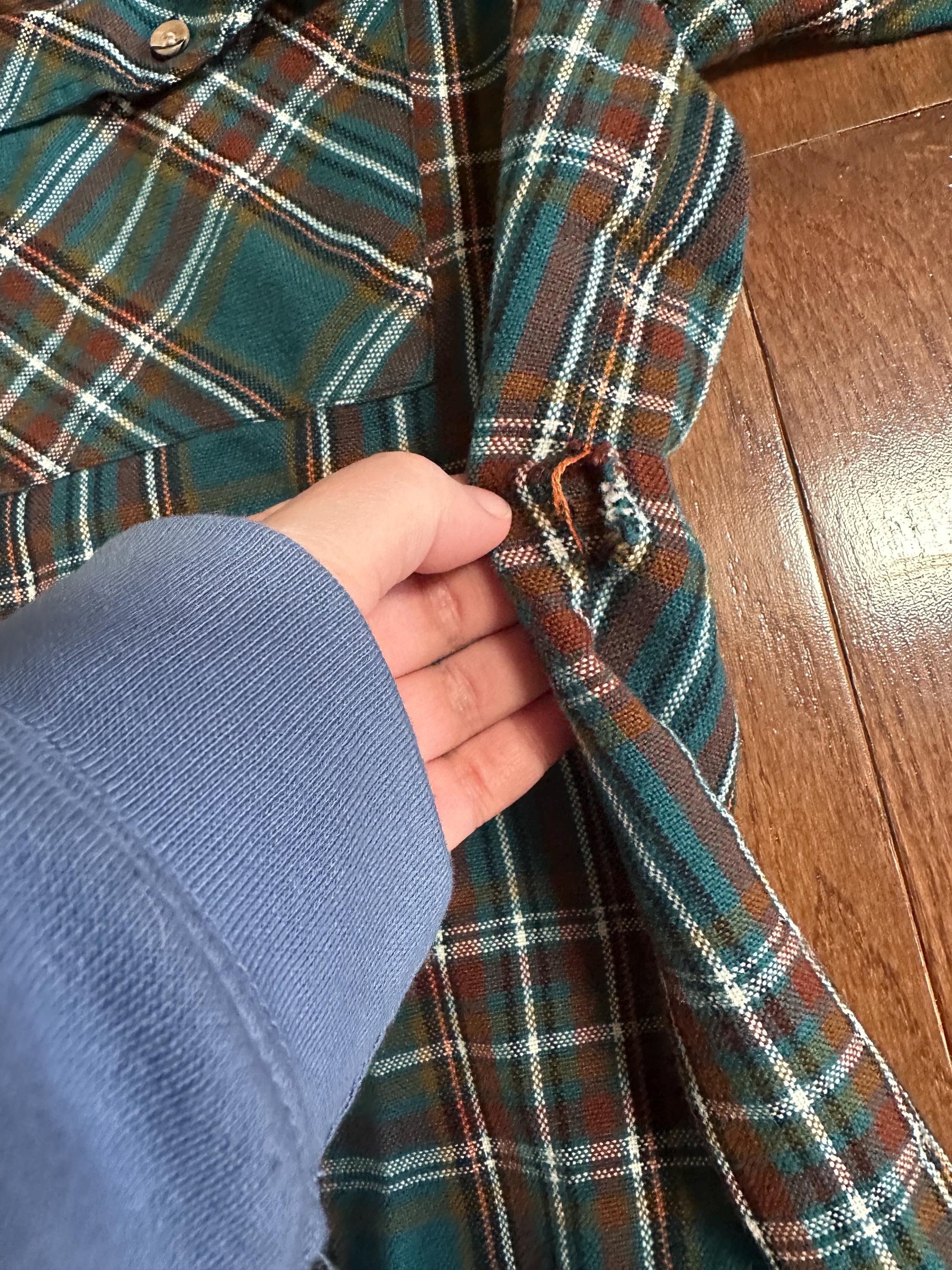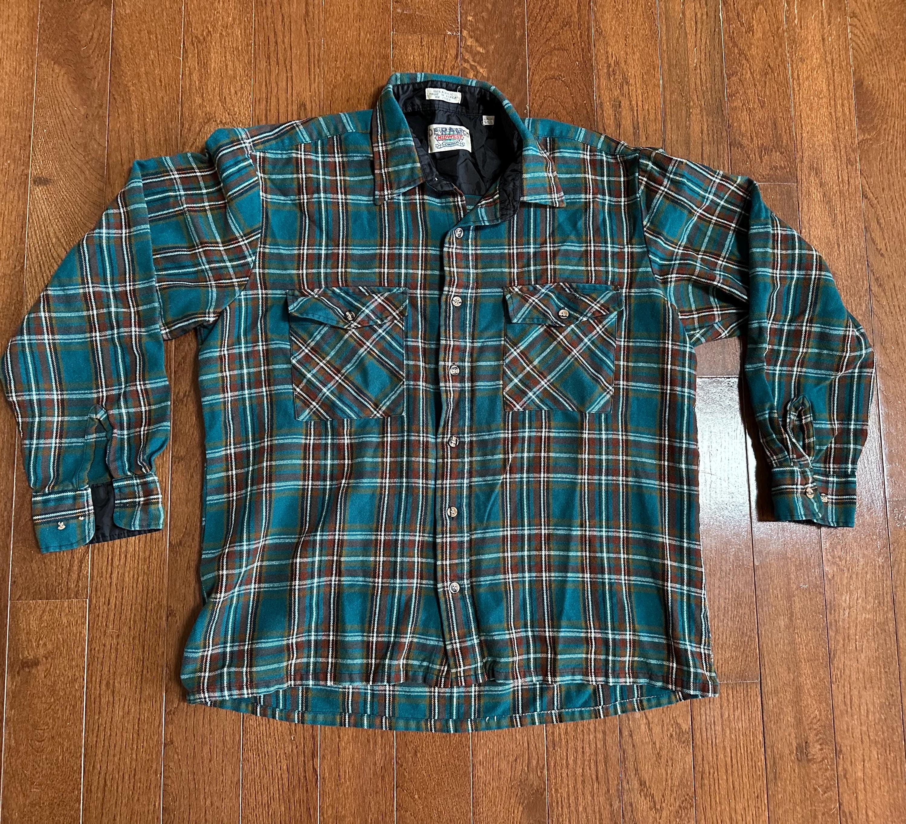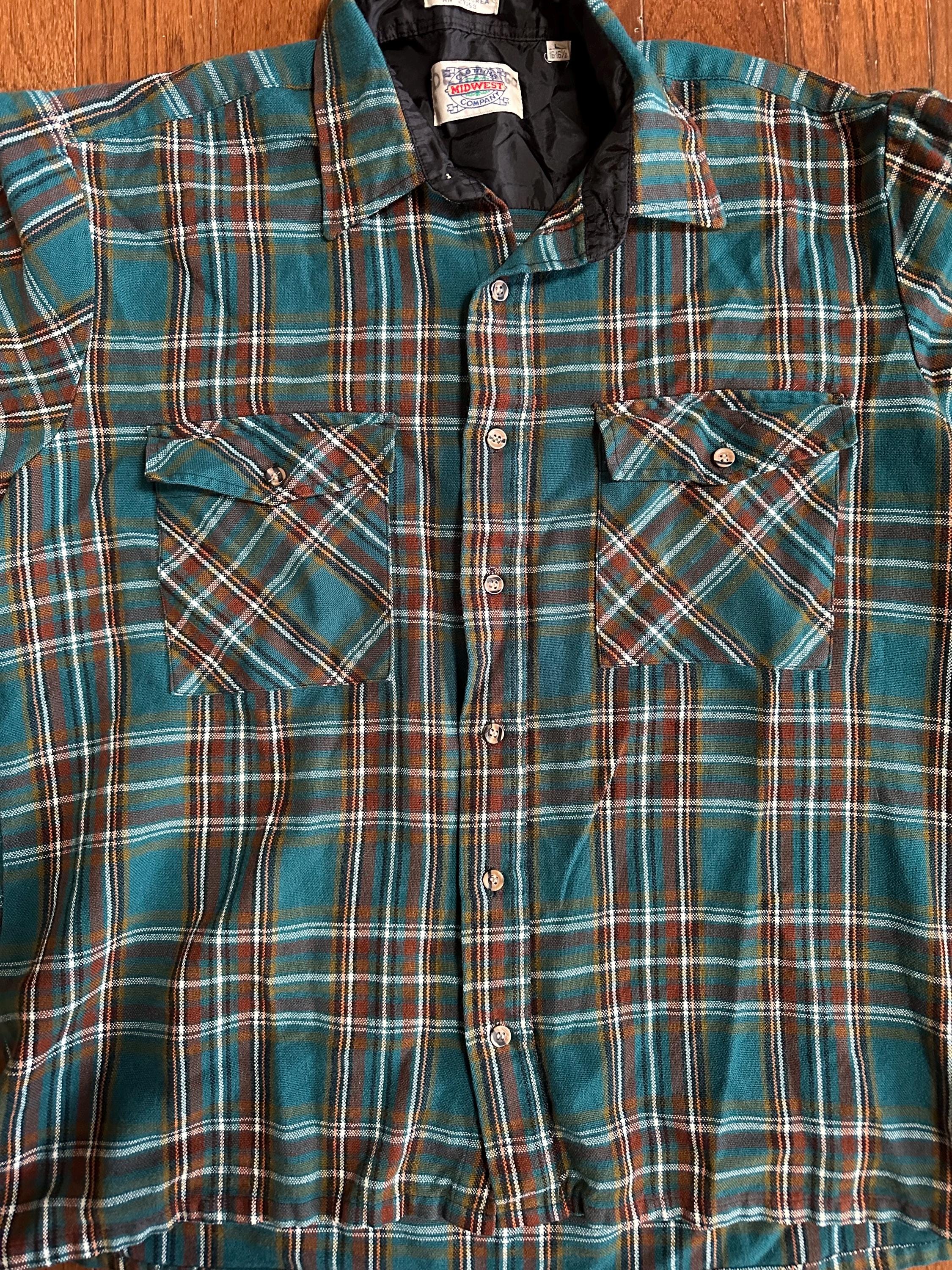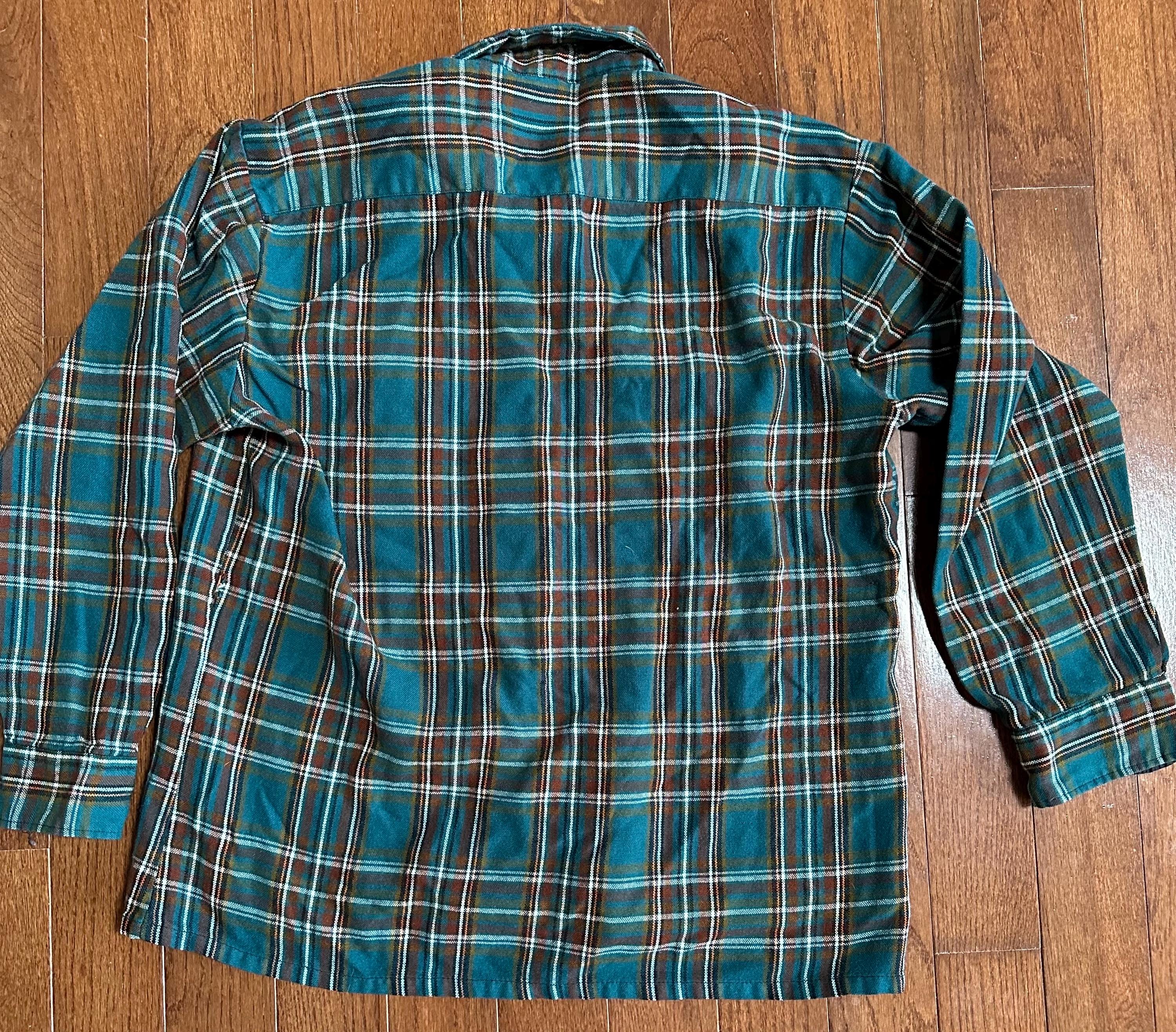 A beautifully worn 1970s flannel from Midwest Company in a classic green with orange and white pinstripes. Soft, broken-in, and full of character, this is the kind of piece you imagine layered up on a cold mountain morning or worn in a cabin after a long day outside. One sleeve button is broken and will need repair, and there is a hole on the side of the shirt, both shown in photos. These details are part of its story and give it that lived-in Aspen feel.