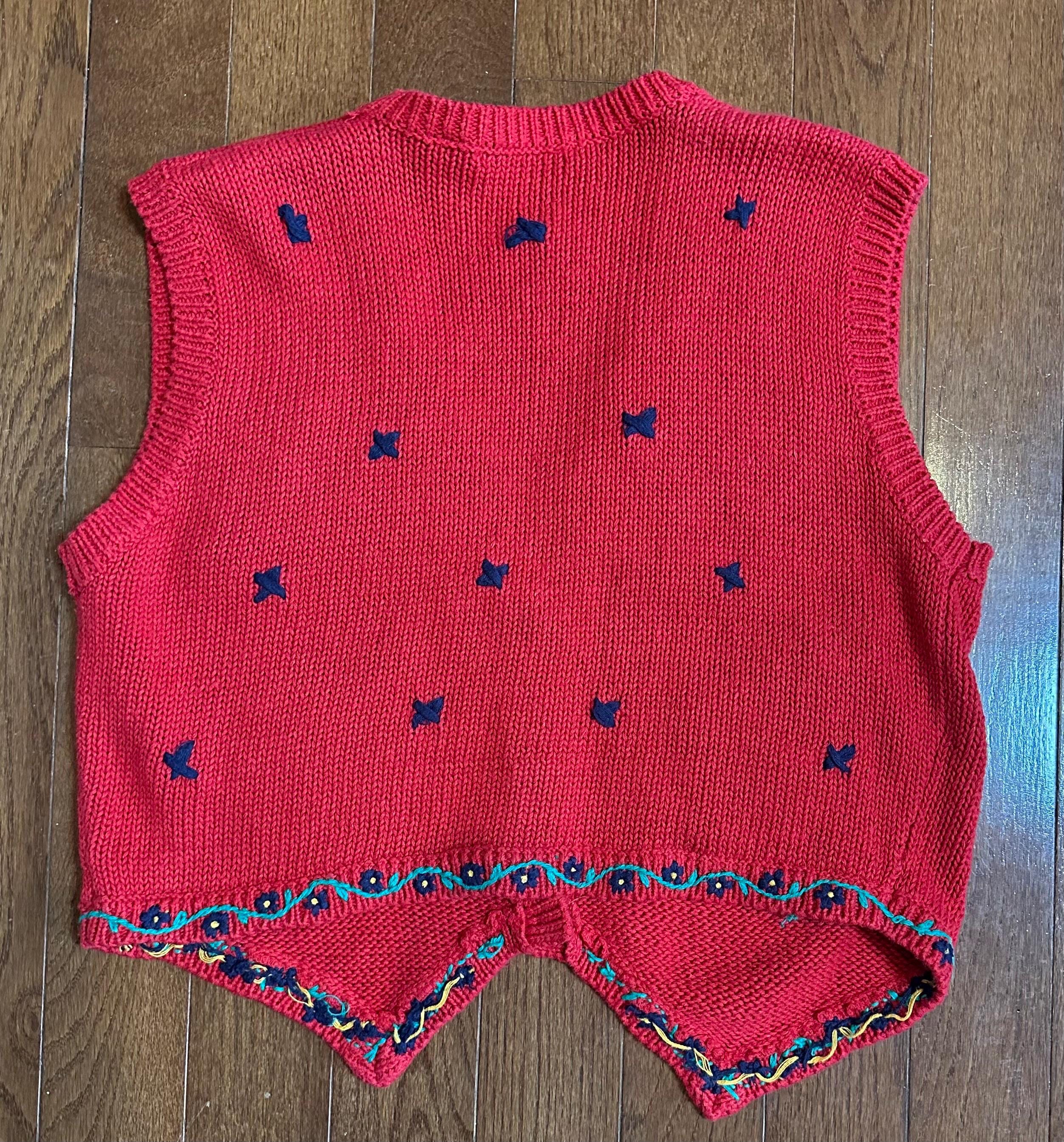 The rich red color is classic and striking, and the pointed front hem gives it a strong silhouette that feels intentional and flattering. Shorter in the back and longer to the front point, it layers beautifully without feeling bulky. This is a piece made for layering and styling, whether that’s over a denim button-up, a patterned shirt, or finished off with a denim jacket for extra texture.