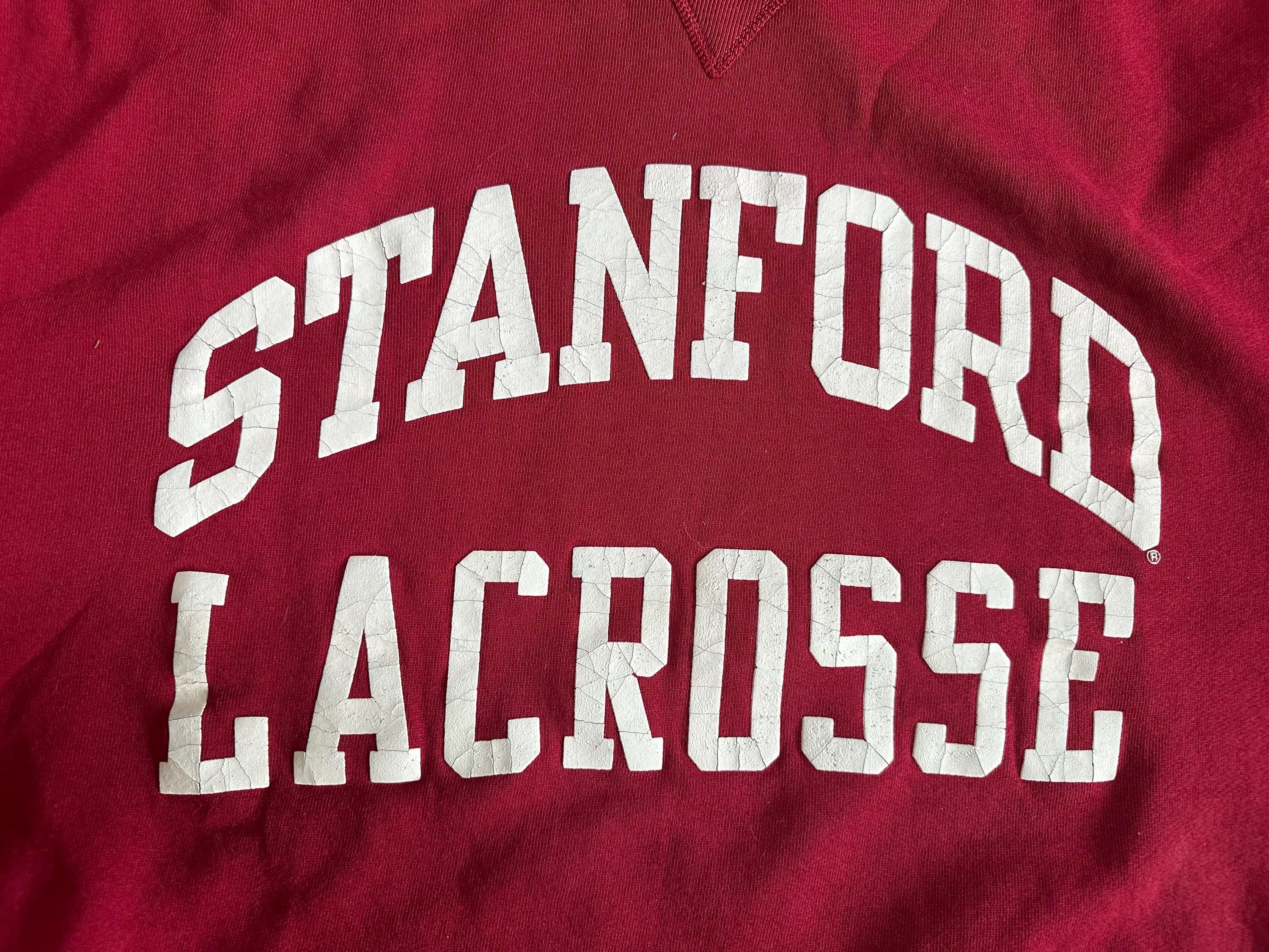 Made from a soft 50/50 cotton poly blend, it has that broken in vintage feel while still holding its shape. The Stanford lacrosse graphic has natural cracking, adding to the authentic, lived in character that makes vintage sweatshirts so good.