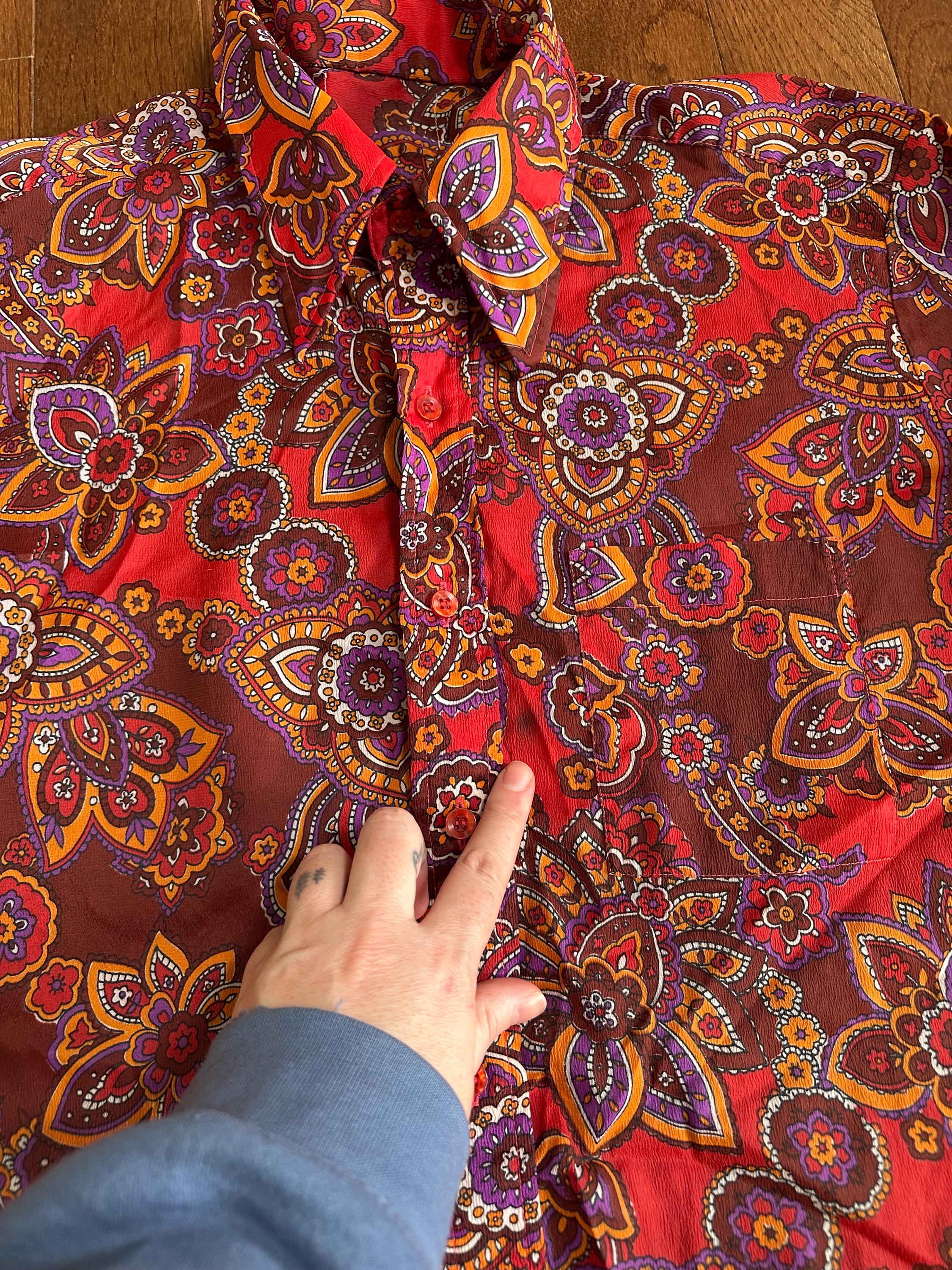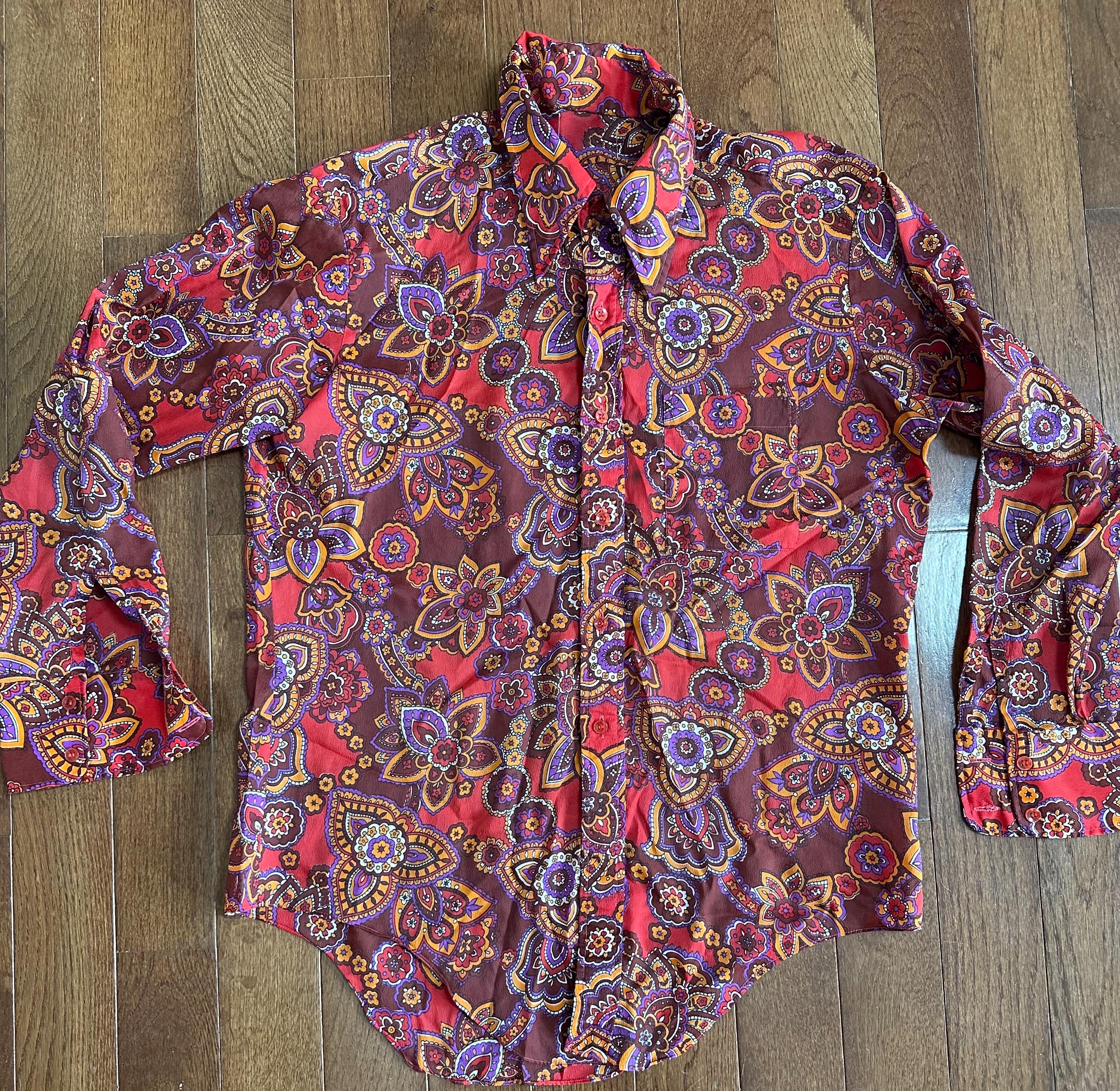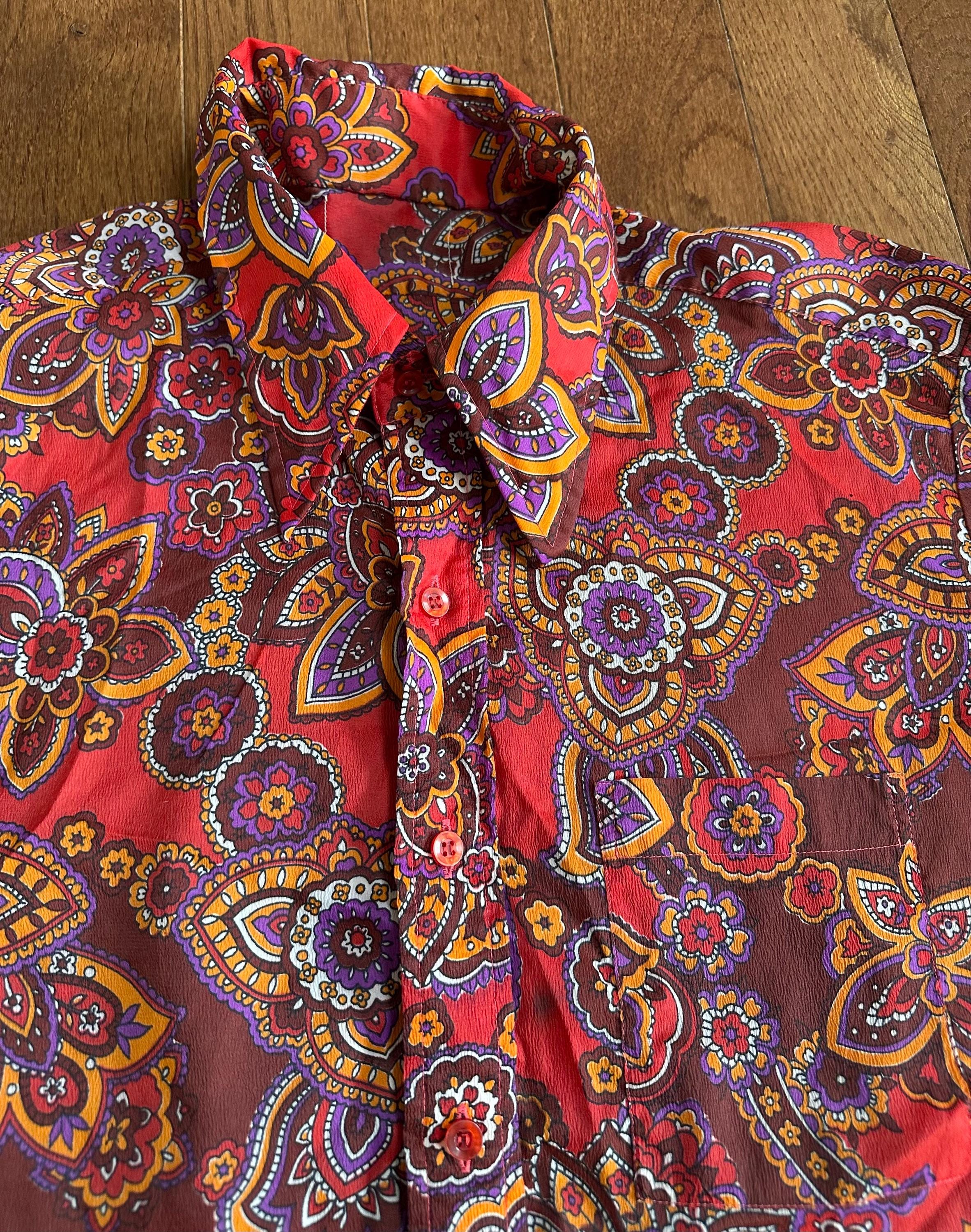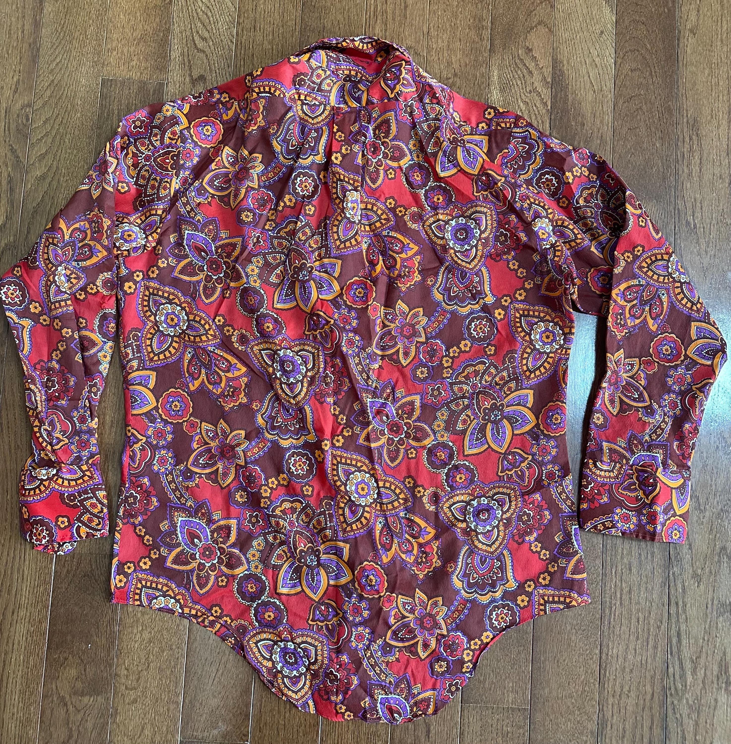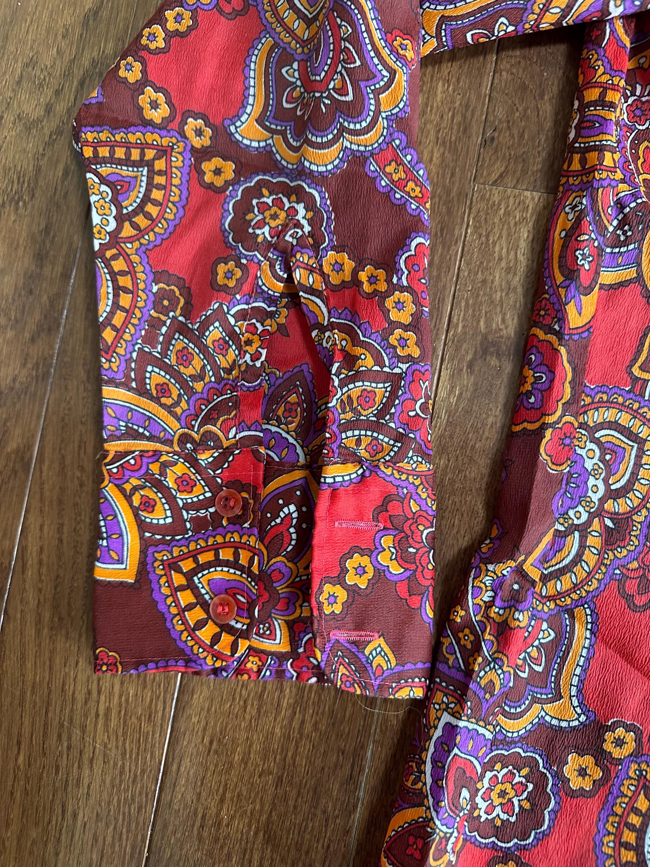 Bold and unmistakably 1960s, this vintage paisley top features a warm orange based print with that classic groovy, psychedelic feel. The wide lapel collar adds strong era character and gives the piece that signature late 60s silhouette.