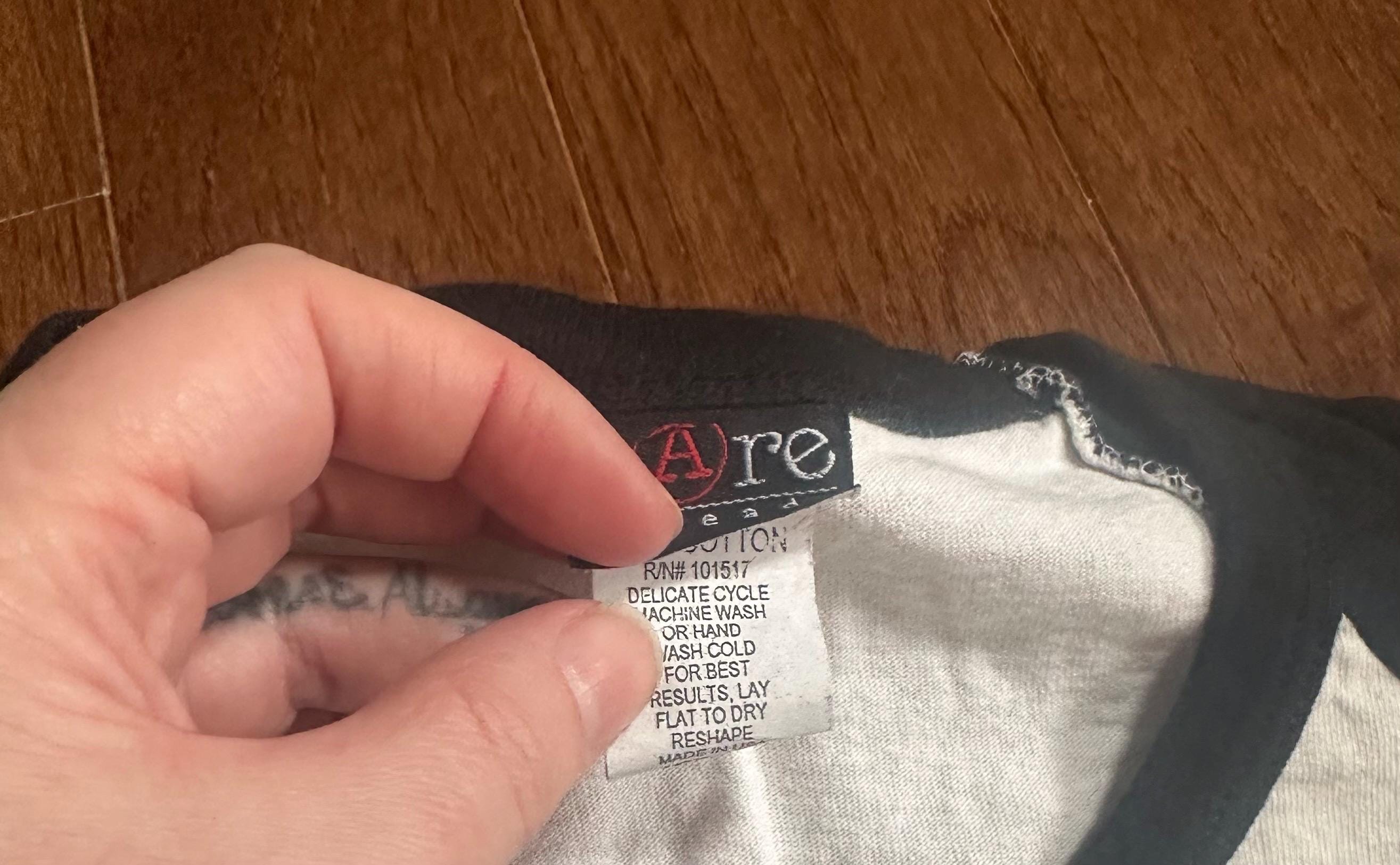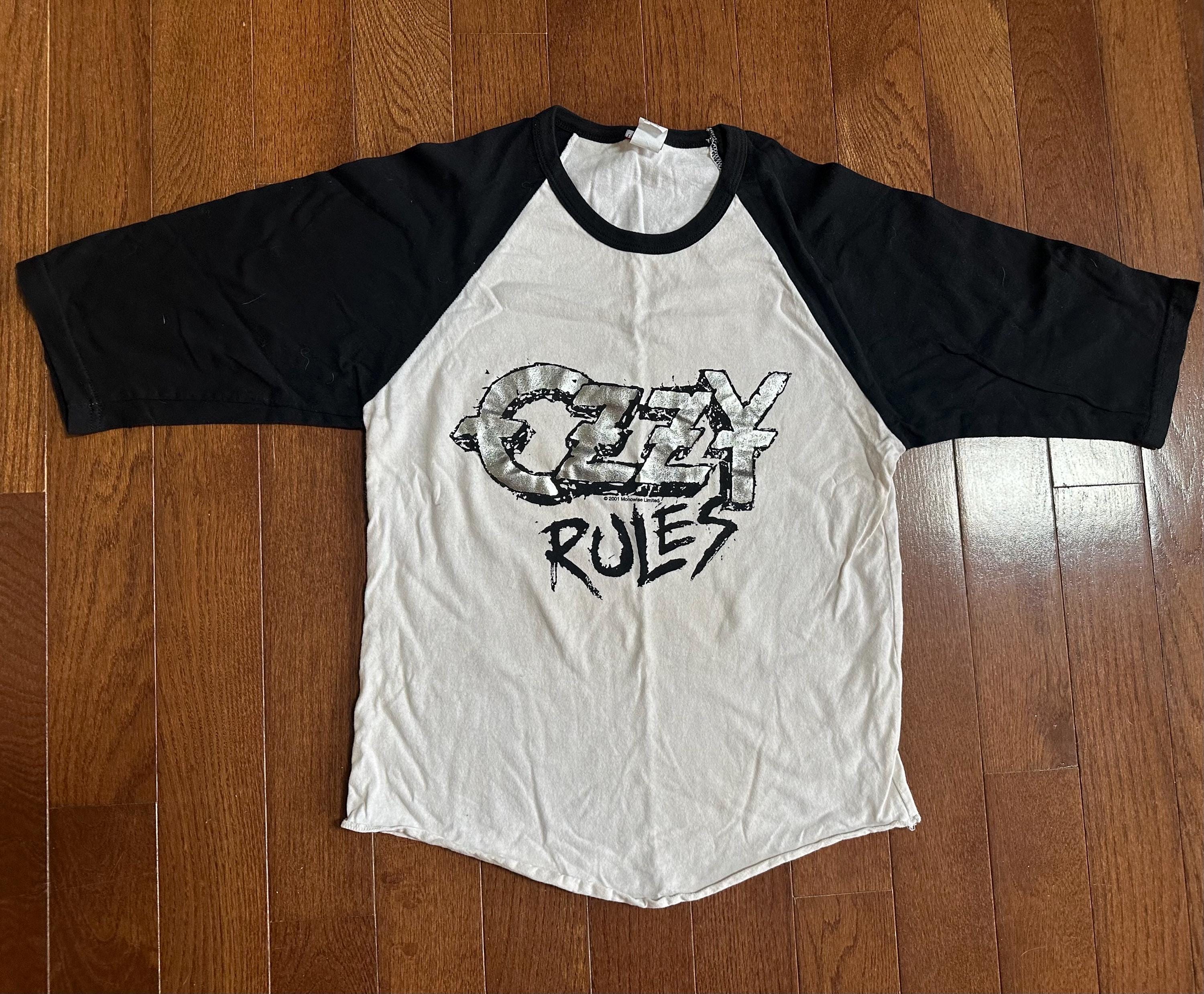 An original 2001 Ozzy Osbourne raglan-style shirt featuring a bold metallic silver “Ozzy Rules” graphic across the front. The distressed style lettering and shine of the print give it that gritty early 2000s rock merch energy, while the black raglan sleeves add a classic band tee silhouette that never goes out of style.