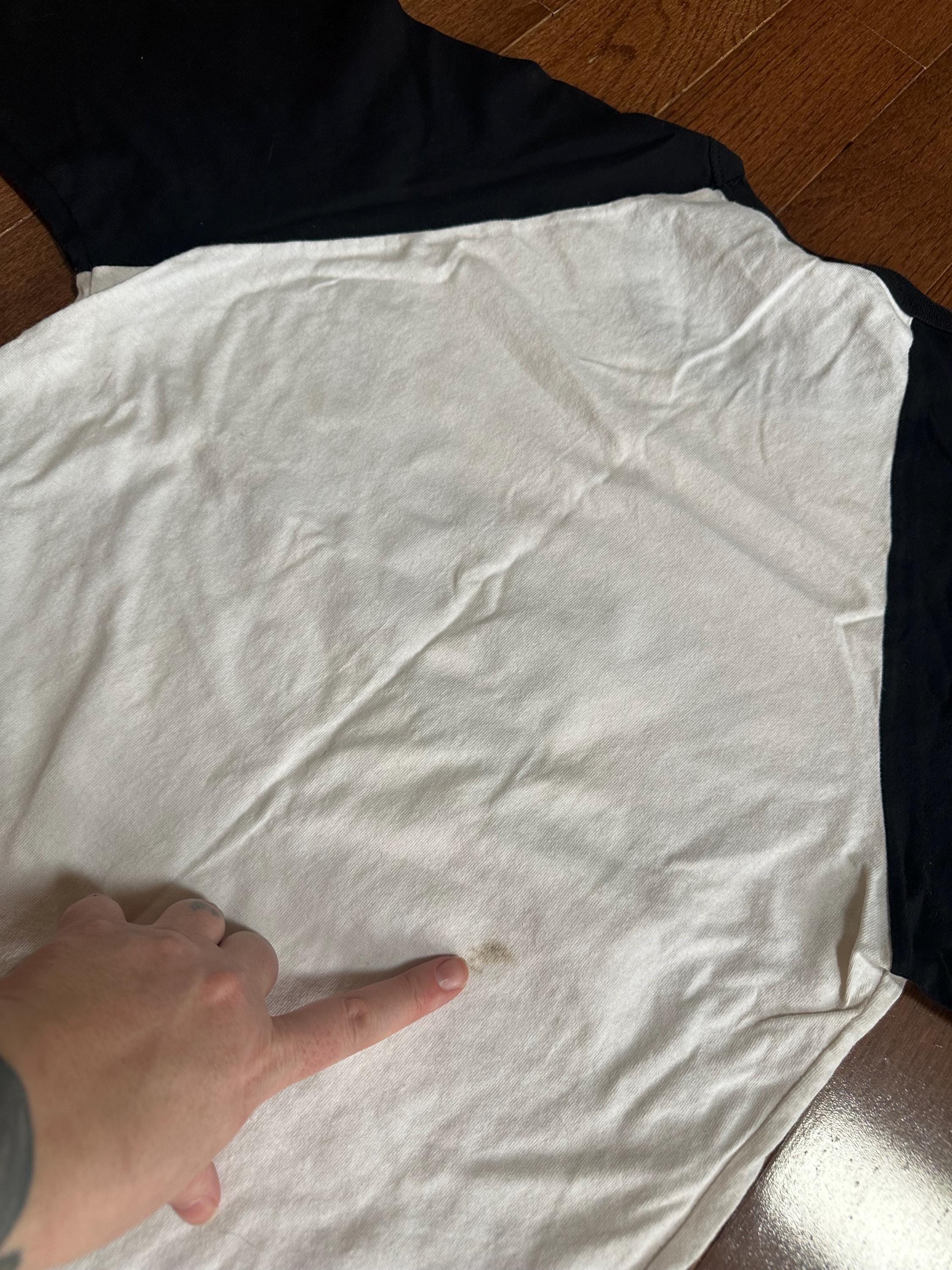 This shirt shows authentic wear, including a visible stain on the back and a few smaller stains throughout. The fabric is soft and broken in, consistent with age and use.