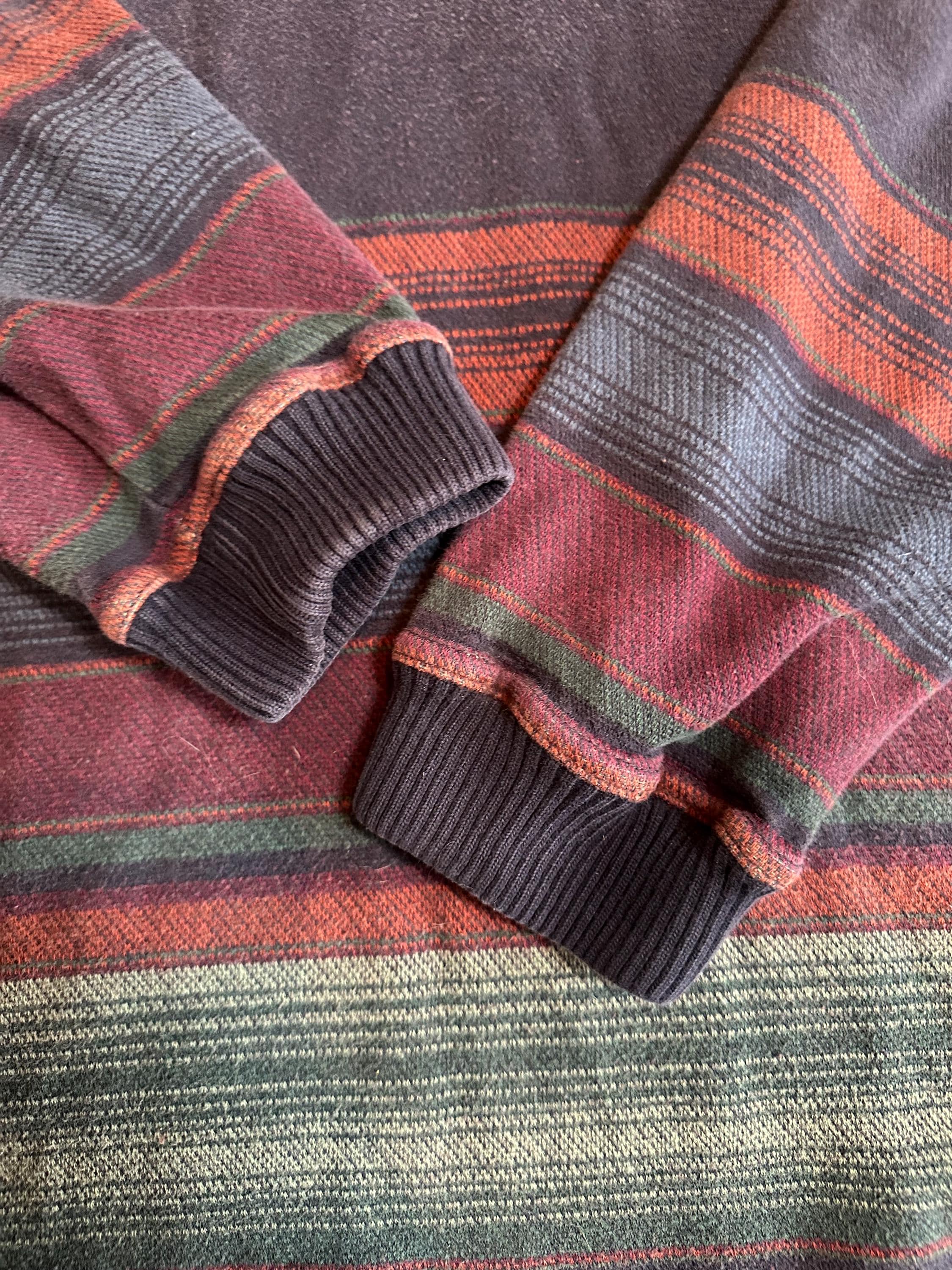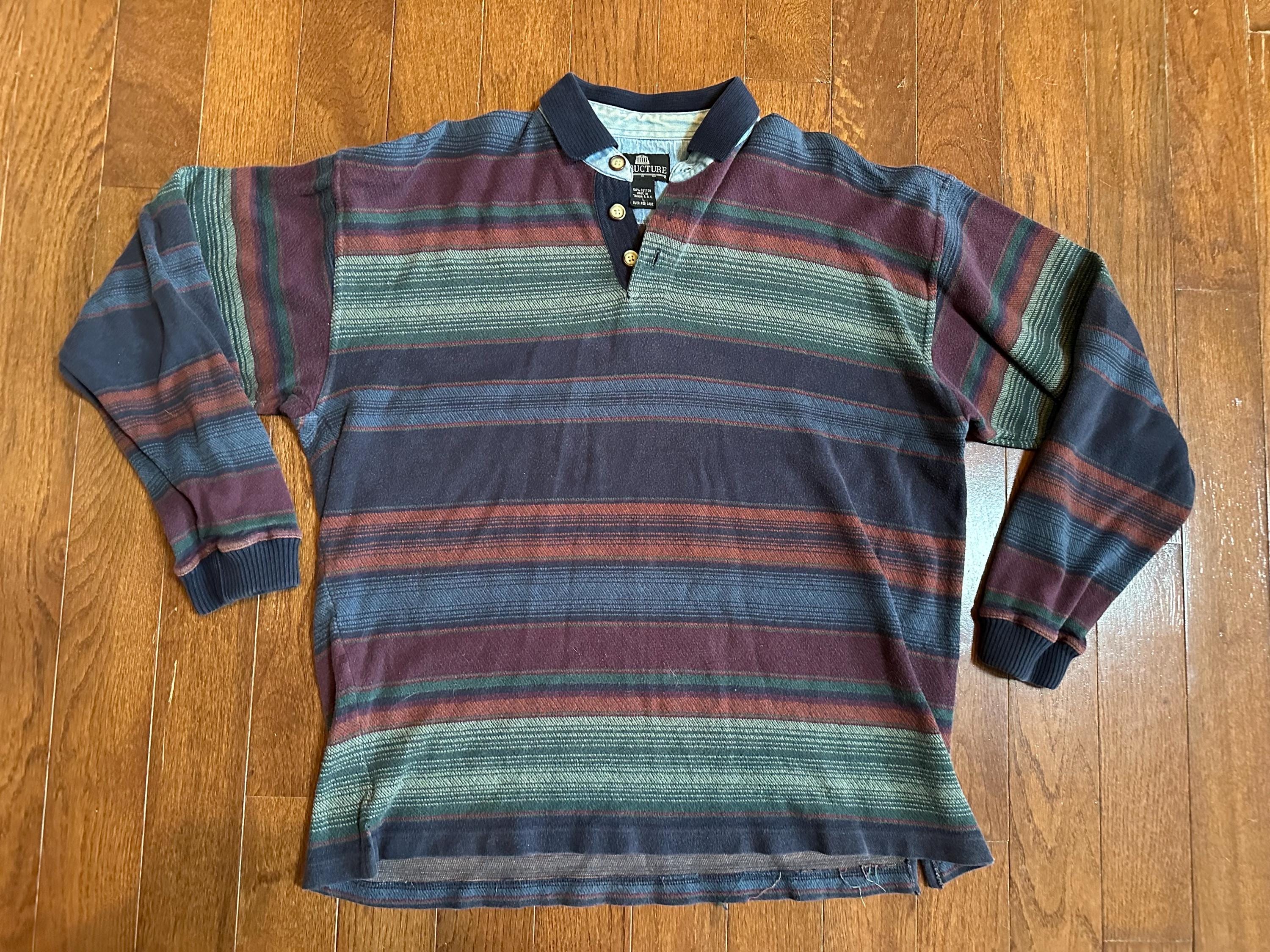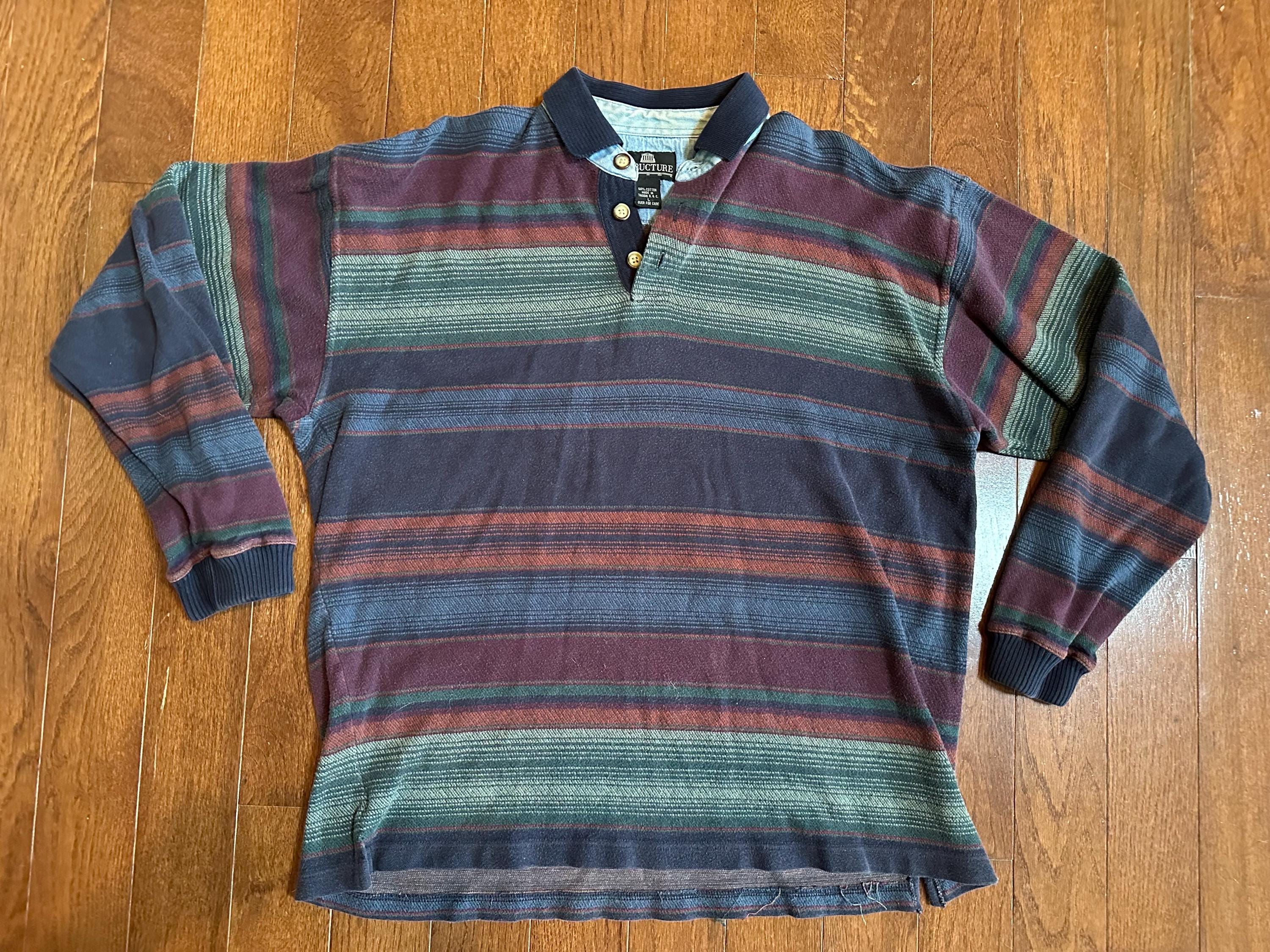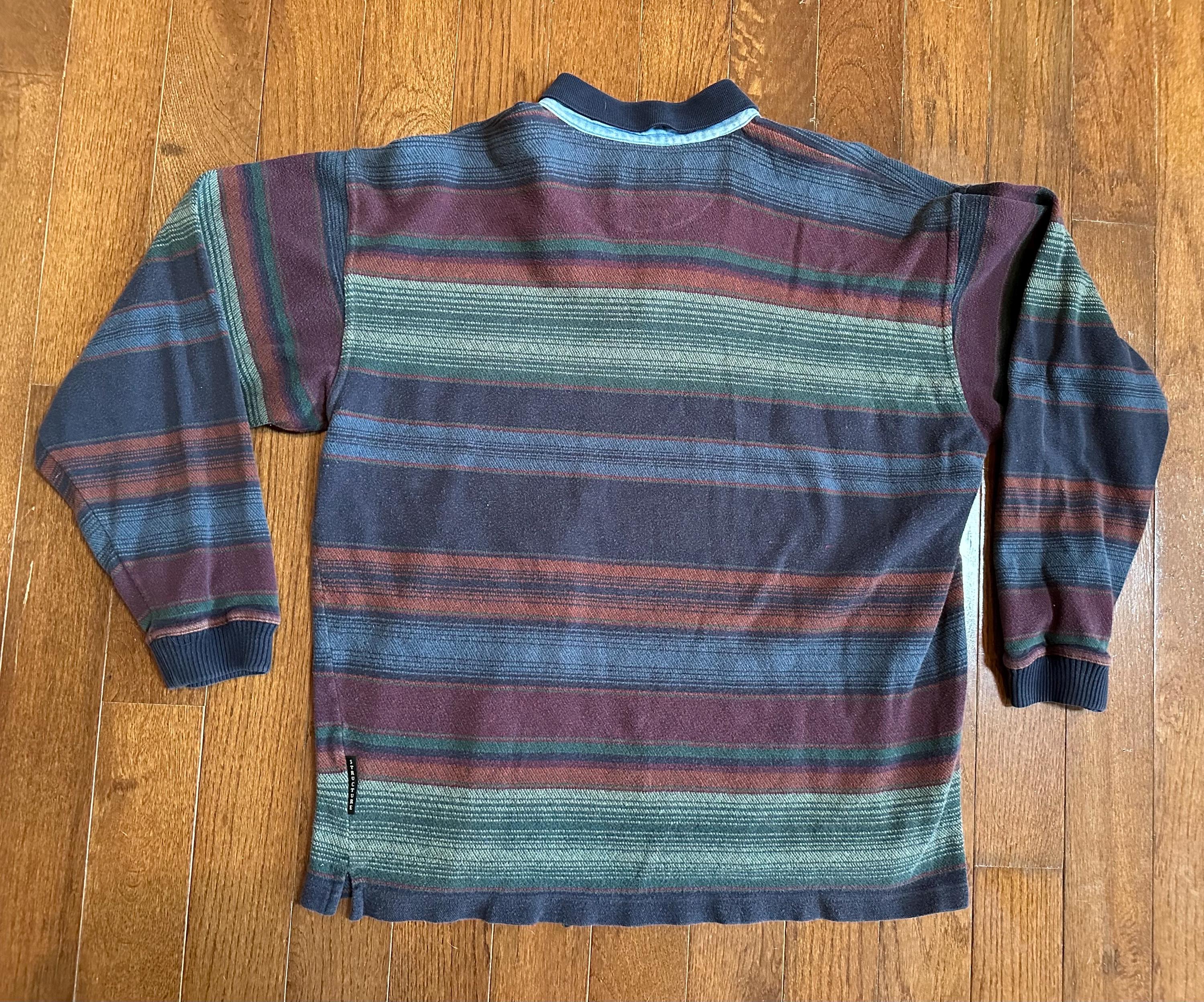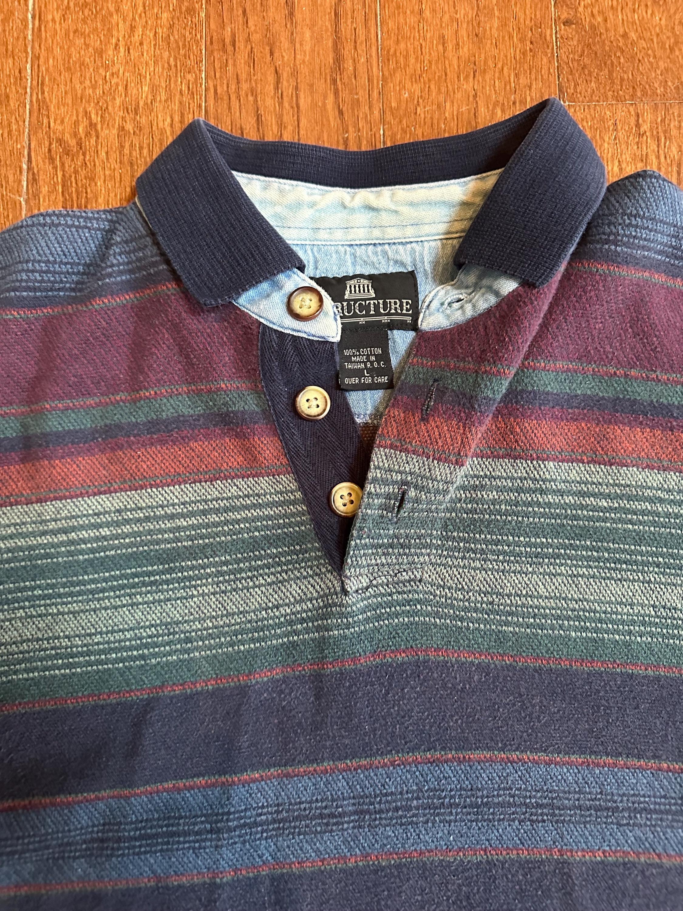 Pure late-90s casual style with that effortless coastal prep feel. This vintage Structure long sleeve rugby-style shirt features rich earth-tone stripes in navy, burgundy, green, and muted blue, giving it a perfectly understated palette that feels straight out of a Dawson’s Creek–era wardrobe.