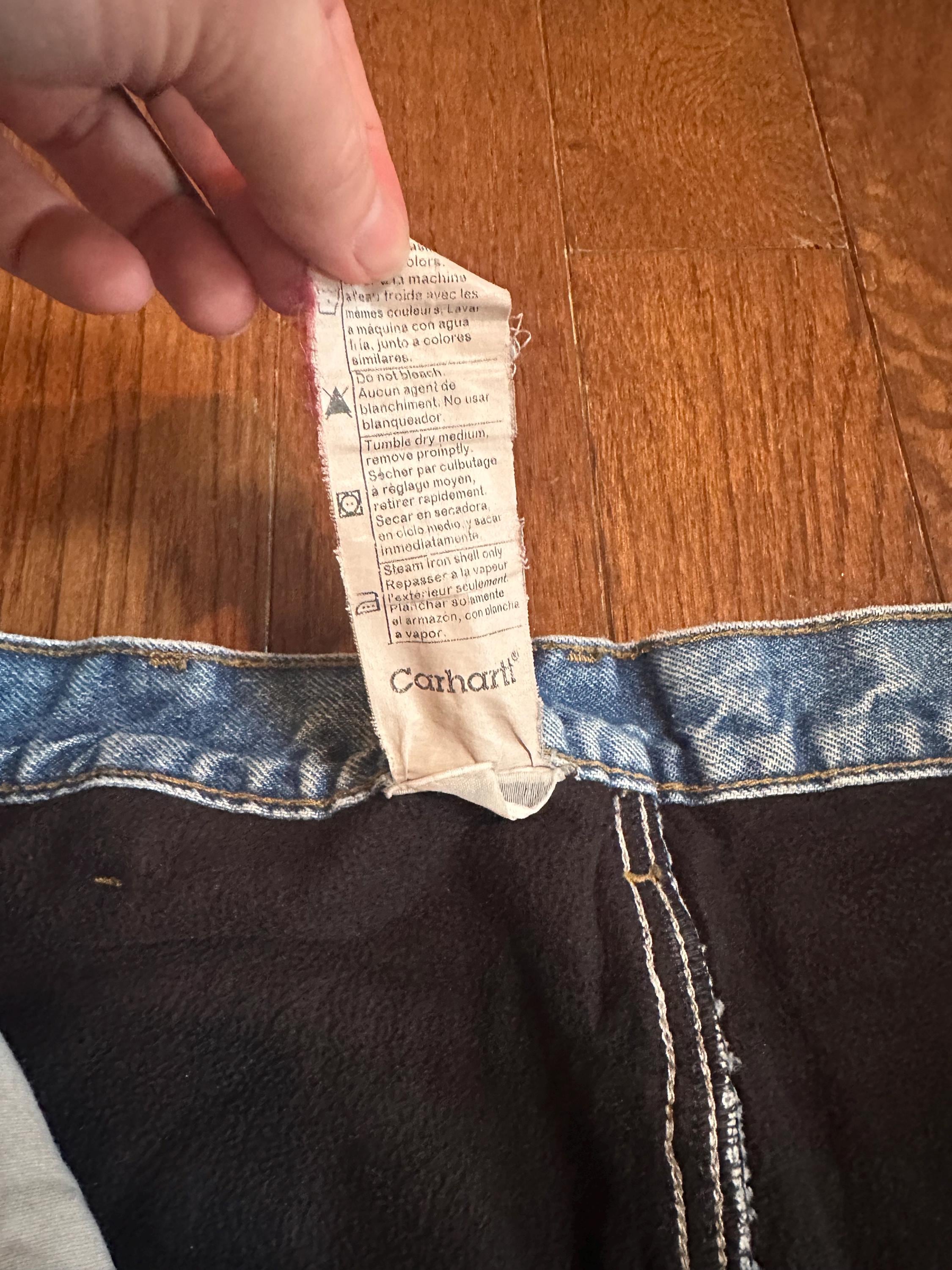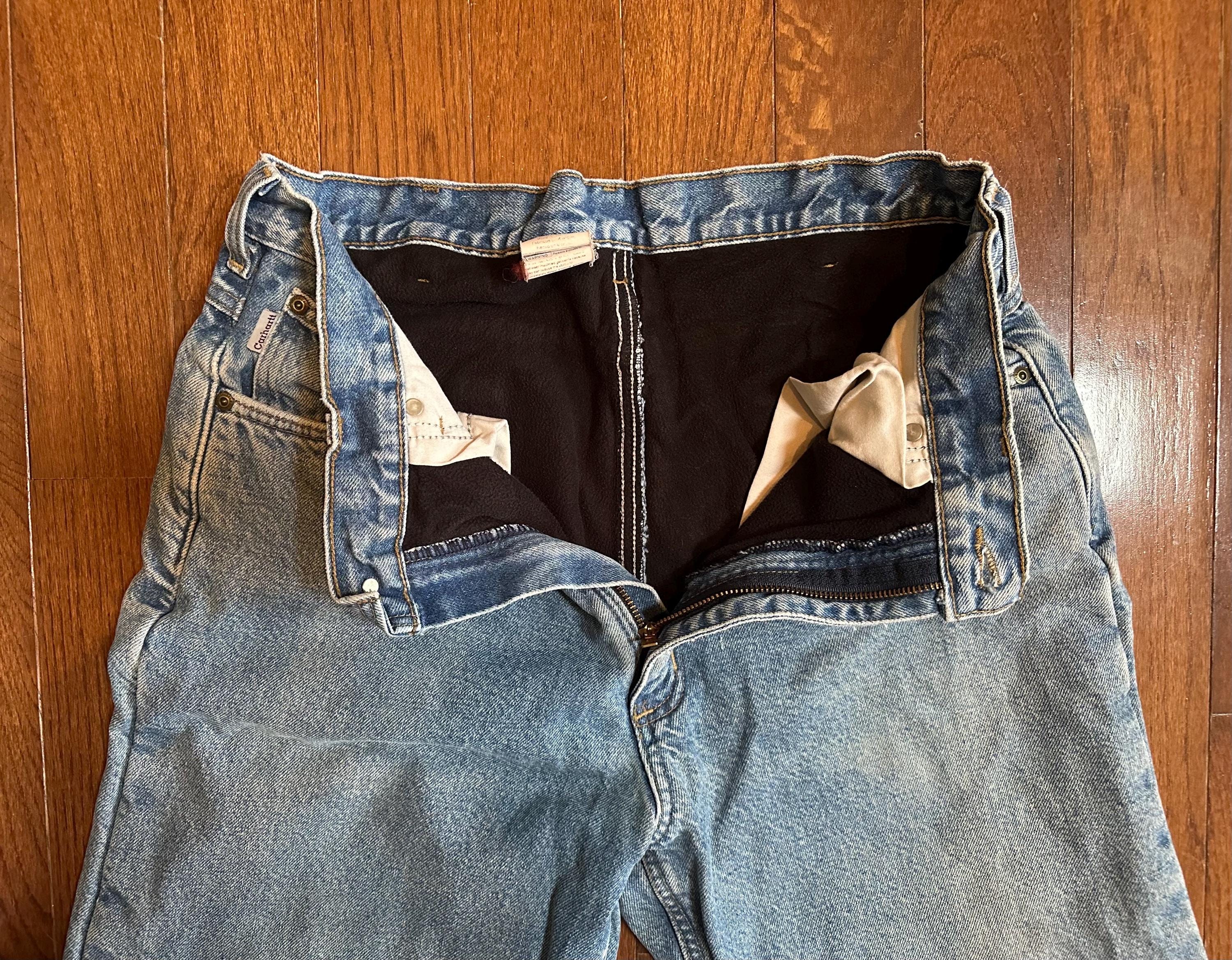 Authentic 1990s Carhartt fleece-lined jeans built for cold weather and hard use. Heavy black denim on the outside with warm fleece lining inside, designed for long days outdoors and rugged durability.