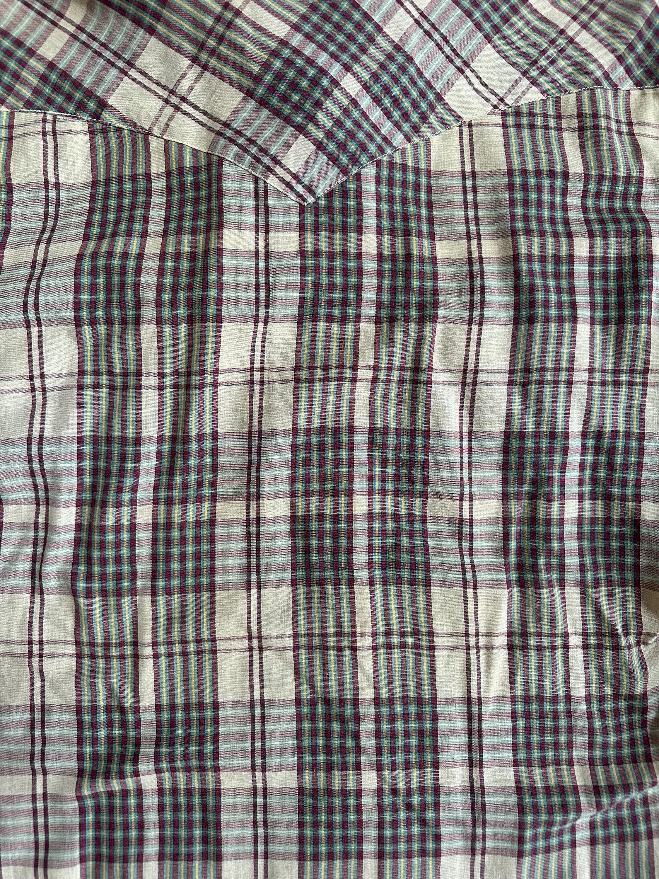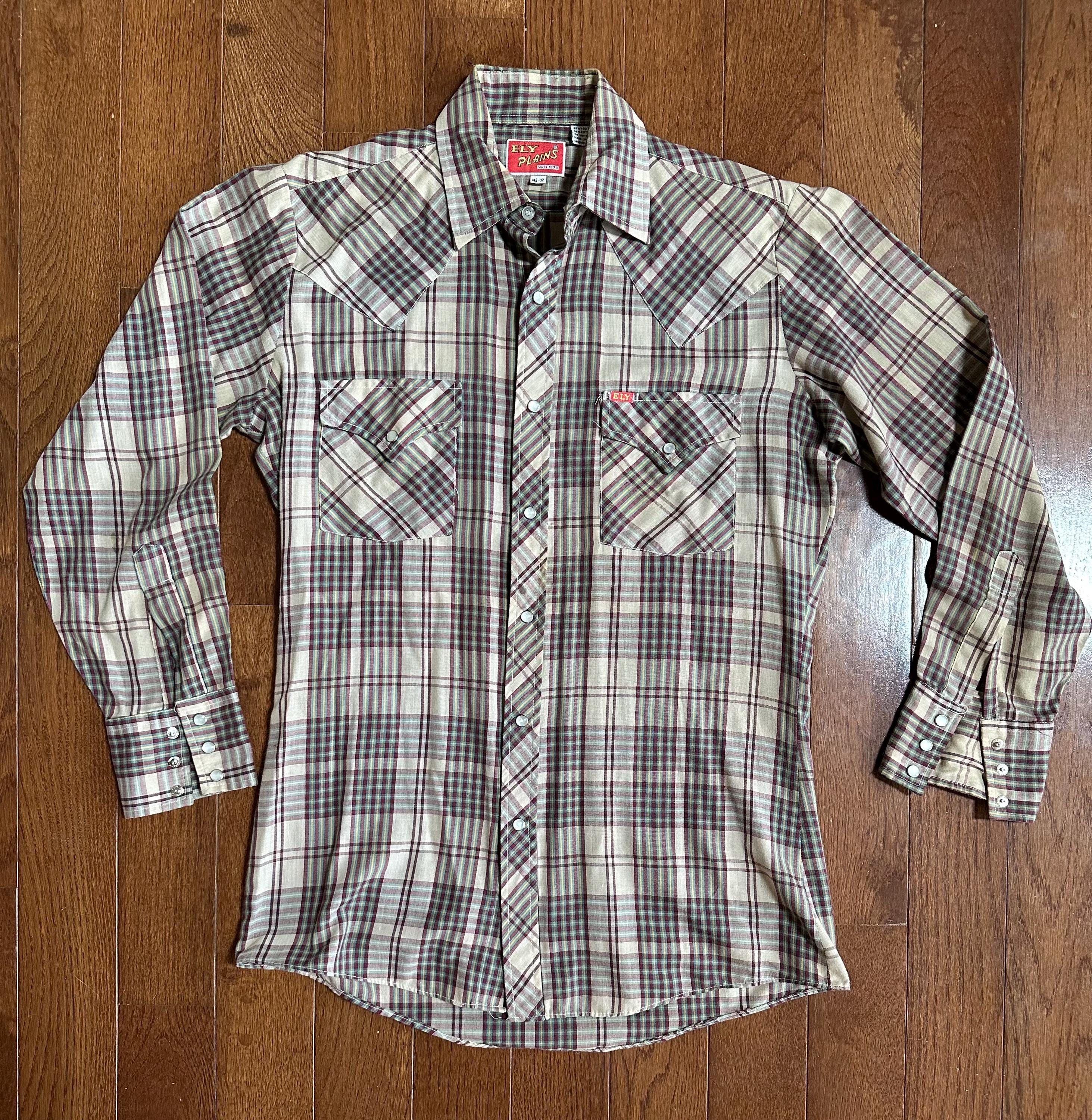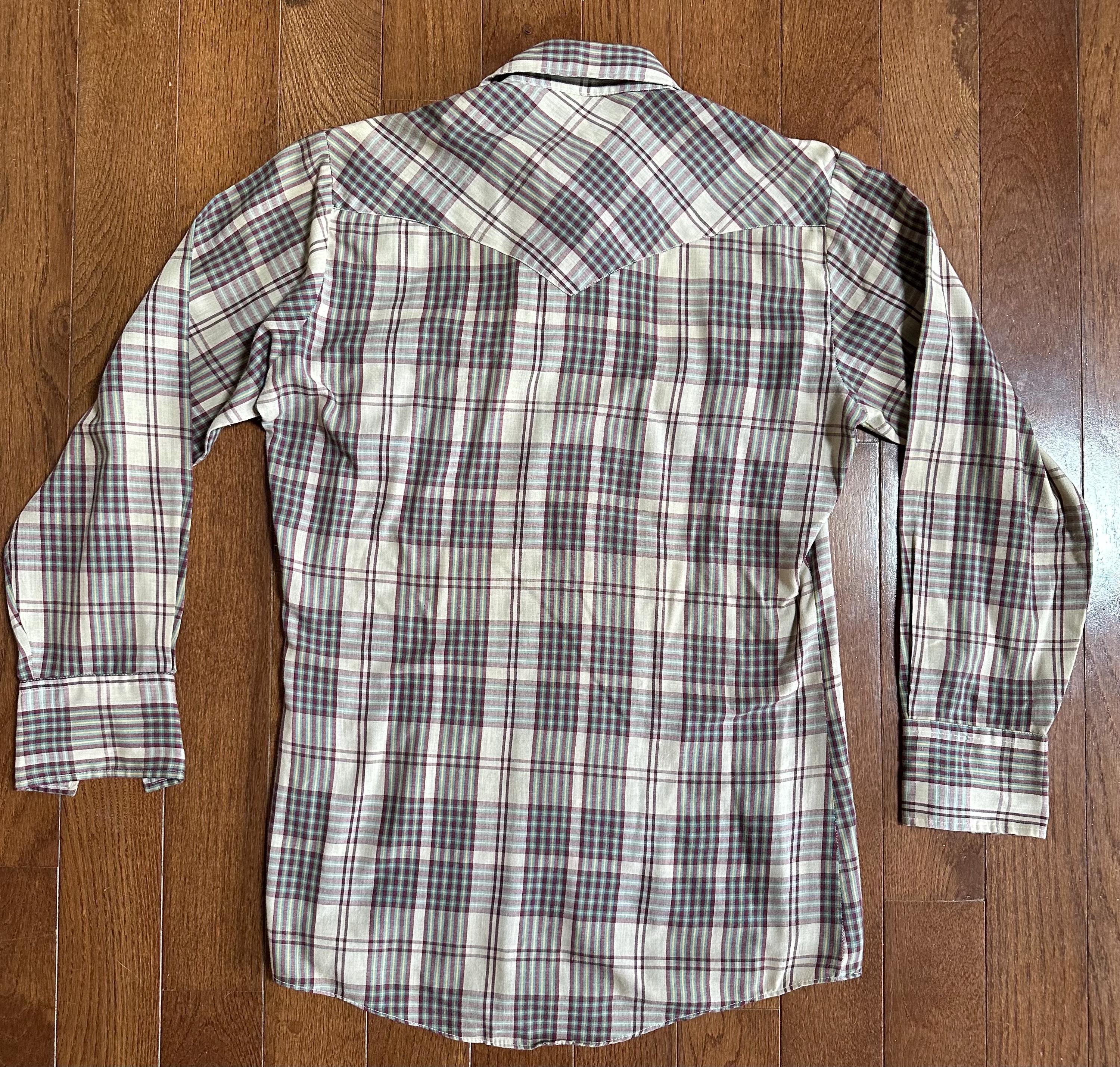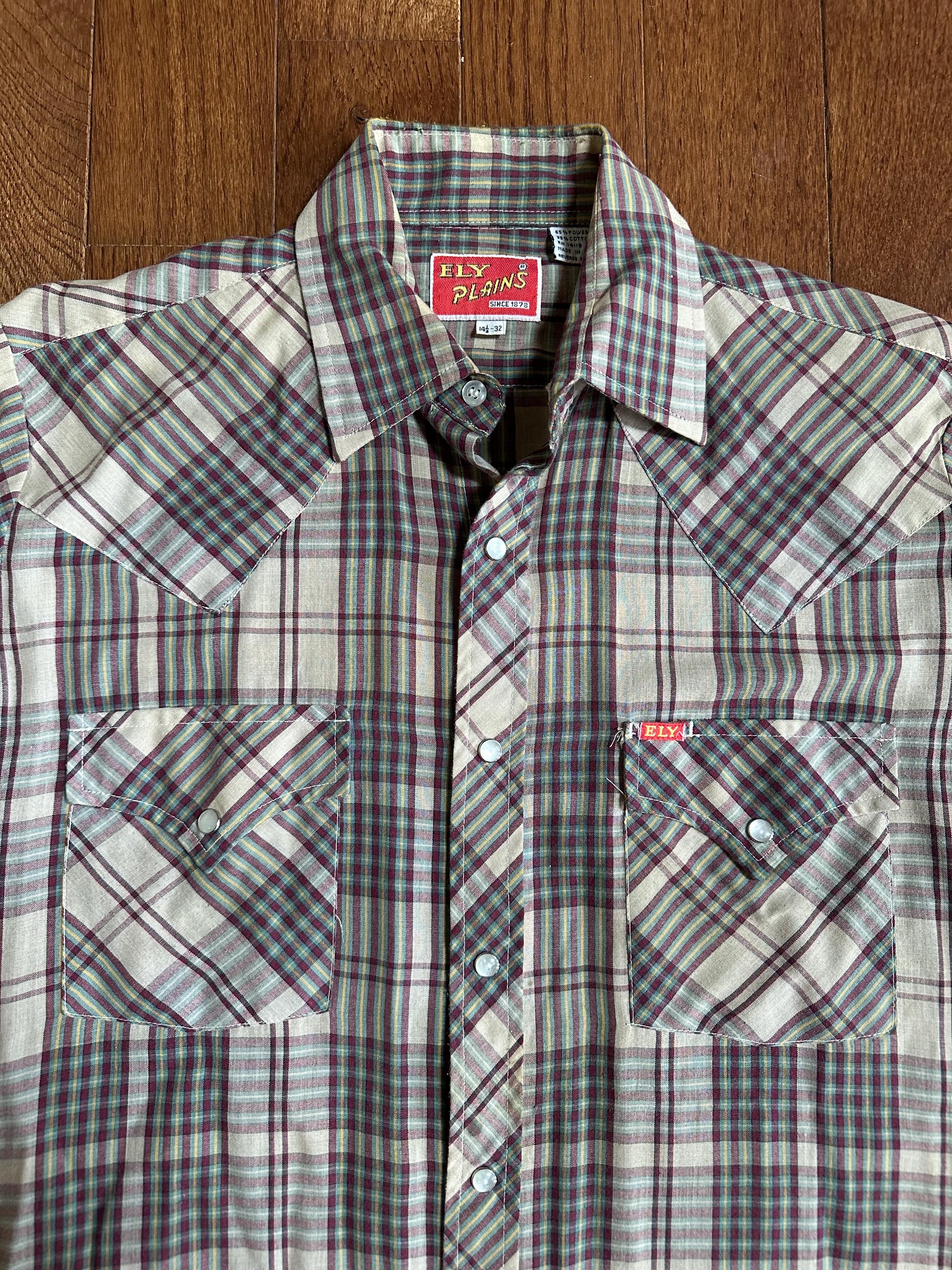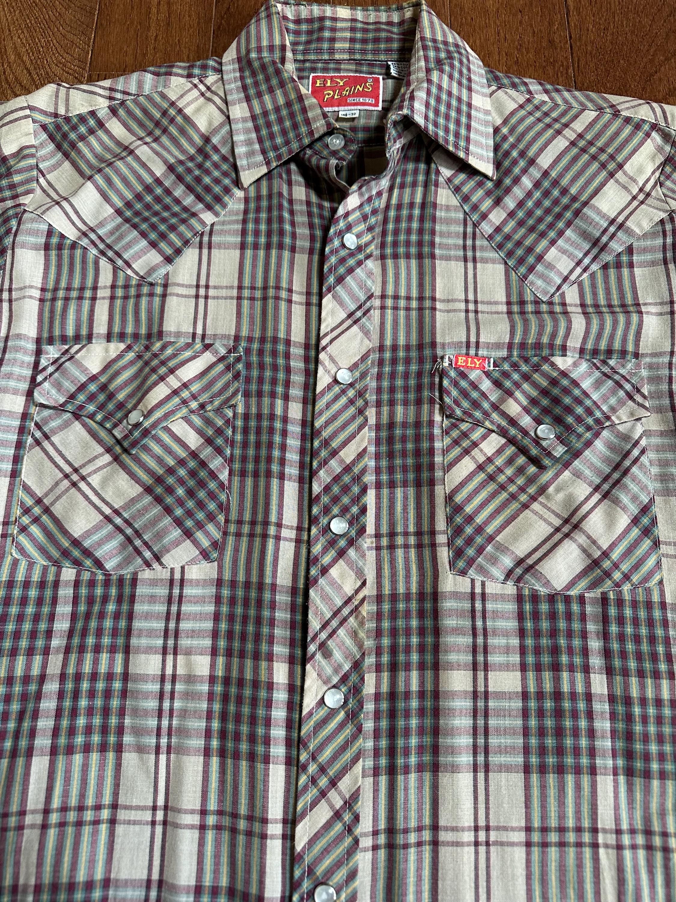 This vintage Ely Plains pearl snap shirt feels like it spent years in the sun, dust, long drives, and early mornings. The plaid is classic western ranch style in muted earth tones, the kind of palette that only gets better with time. Ely Plains has been producing western wear since 1878, and this piece carries that legacy in a quiet, utilitarian way.