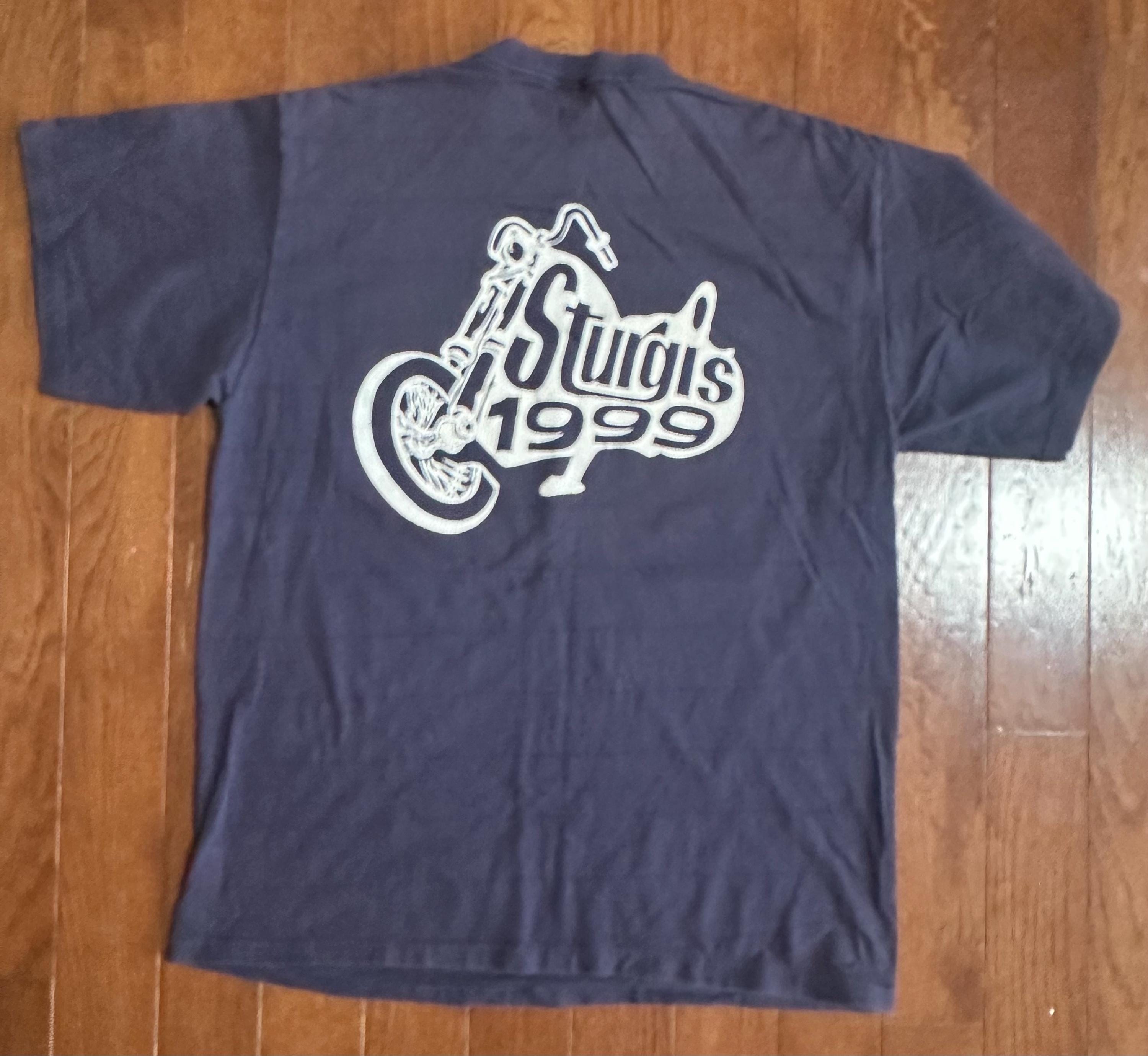This vintage 1999 Sturgis Motorcycle Rally tee carries the unmistakable grit of real biker wear. Printed on heavyweight cotton, it has that substantial feel older shirts were known for, built to handle long rides, dust, heat, and years of repeated wear.