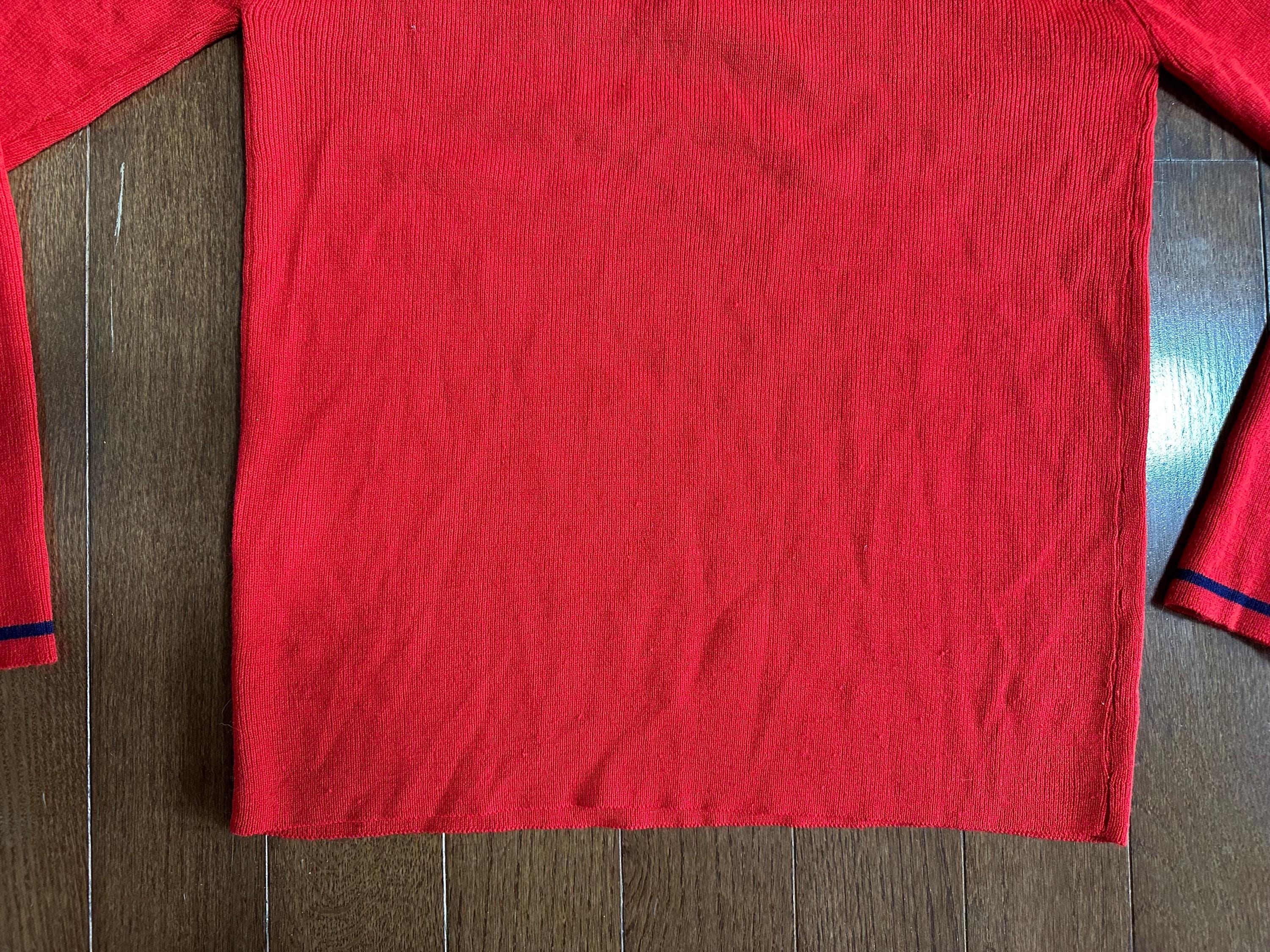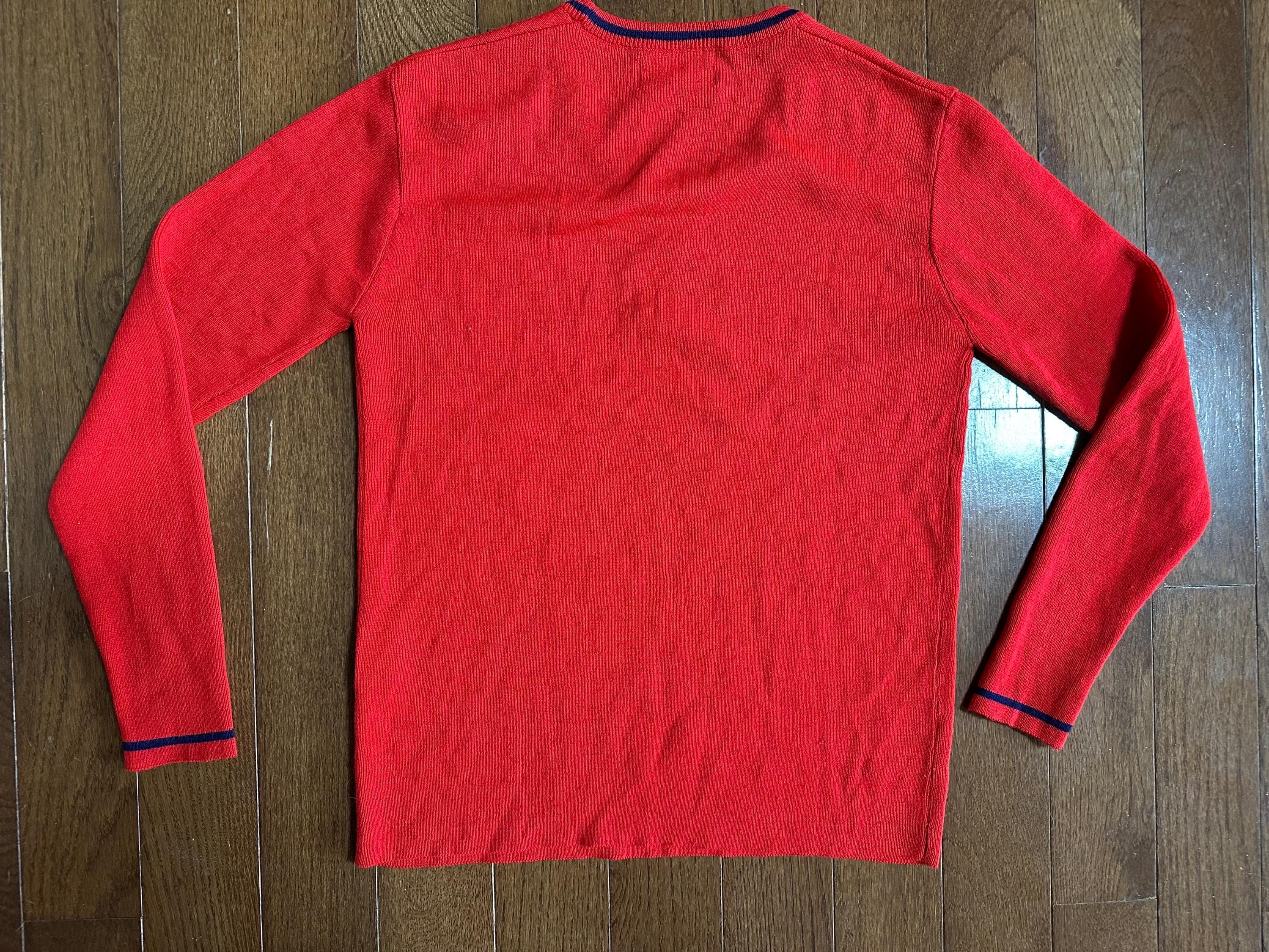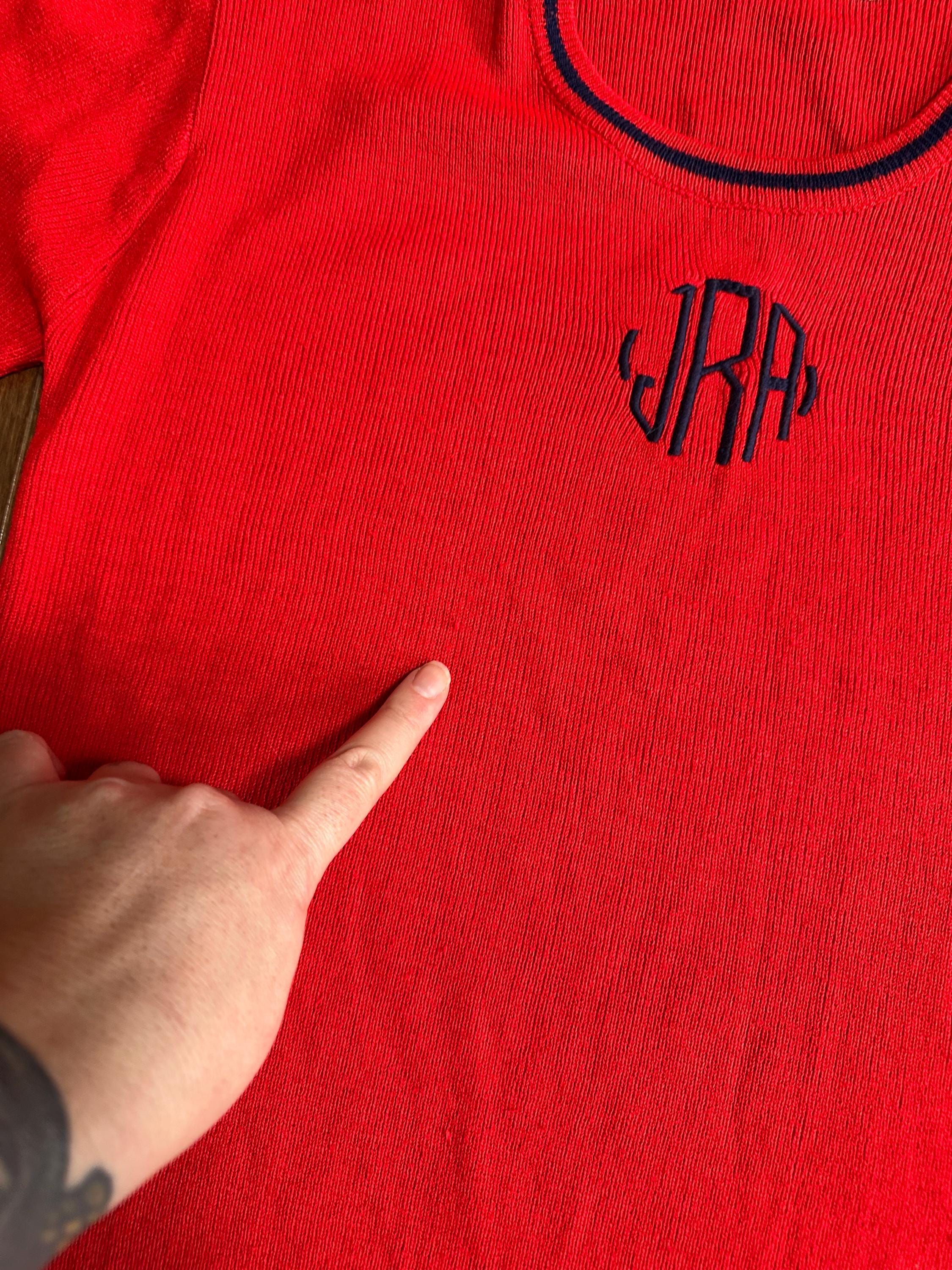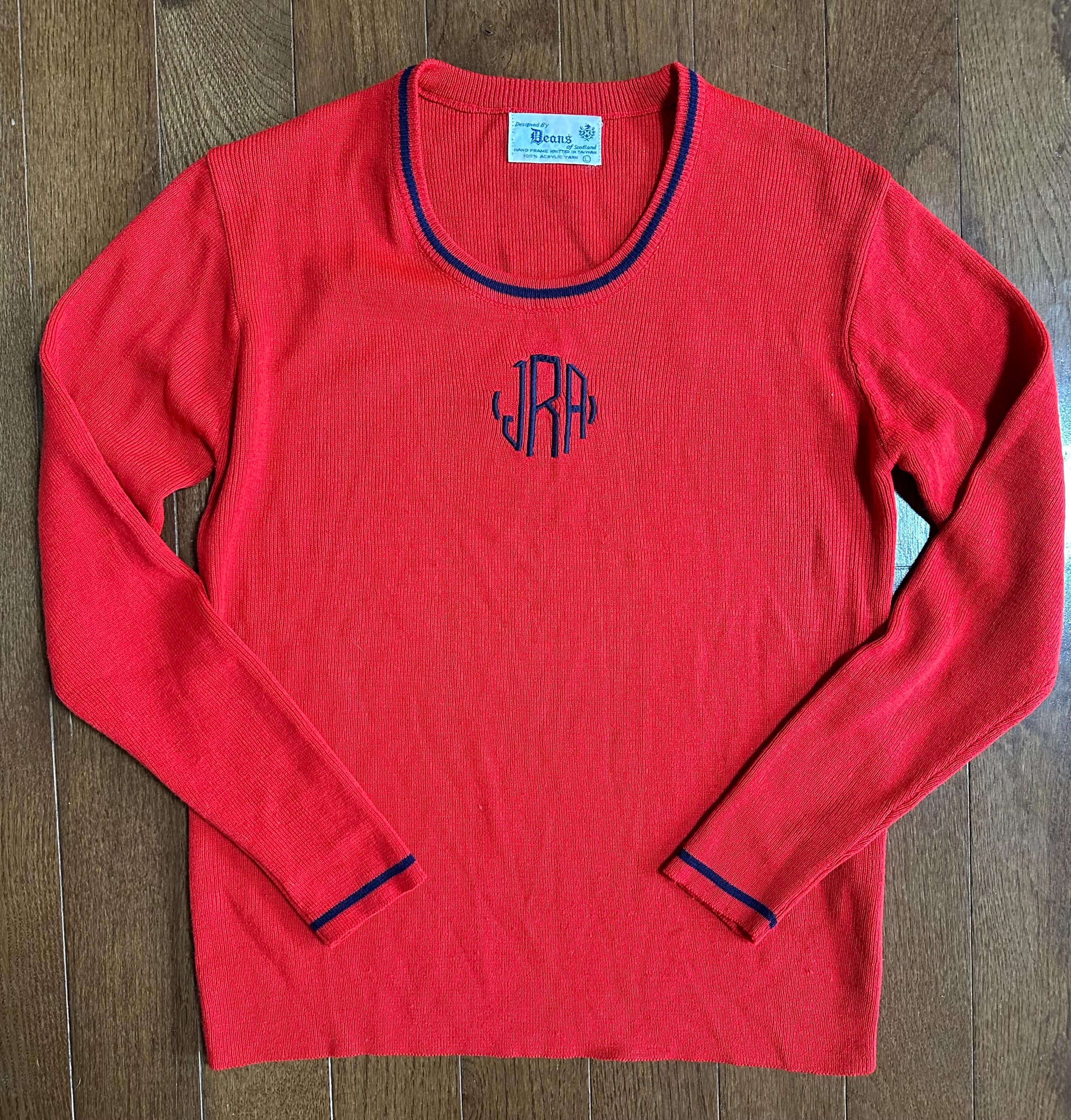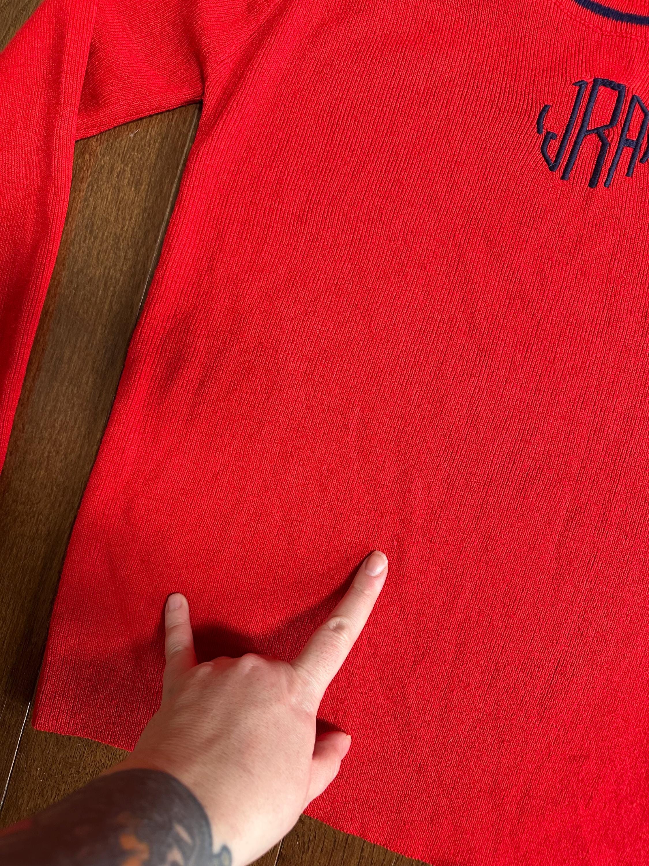 The bright red base is accented by delicate embroidered detailing, including hand-stitched initials “JRA” on the front, giving the sweater a personal, one-of-a-kind history. Monogrammed pieces like this were often gifted or custom-ordered, adding to their nostalgic charm.