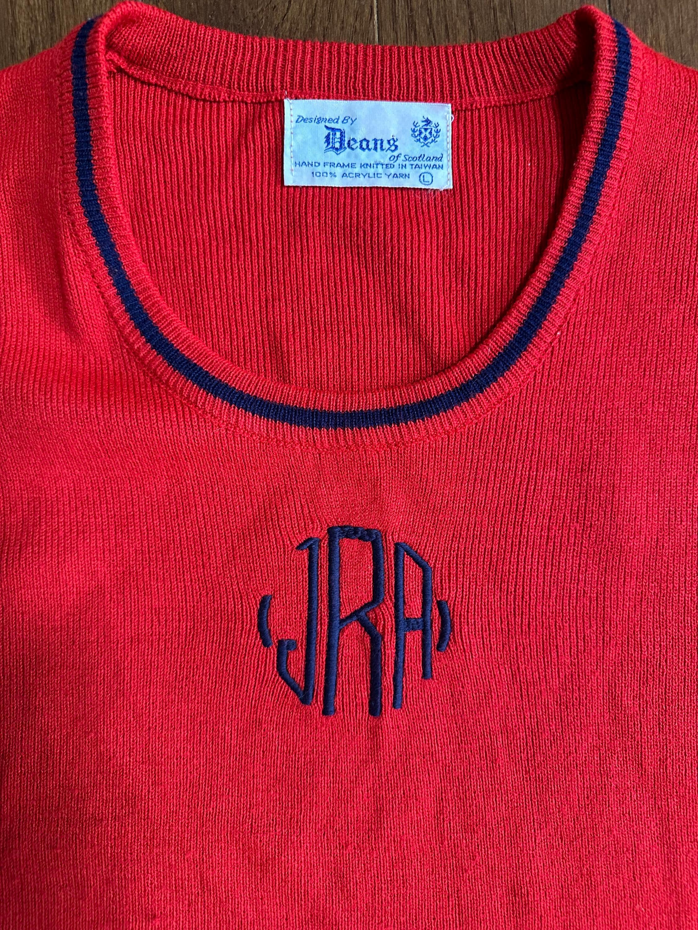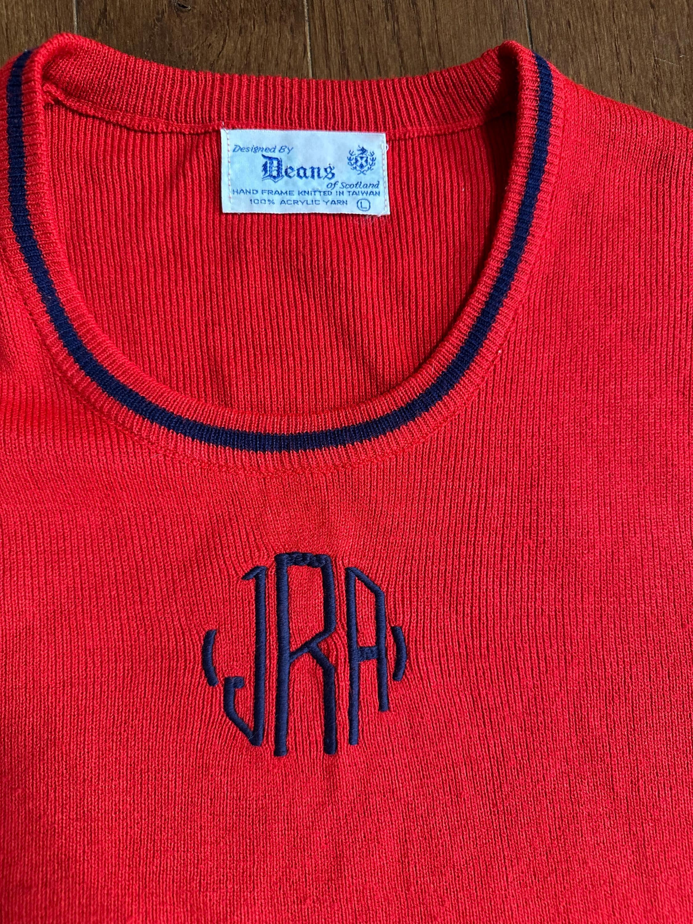 Vintage 1950s Style Hand-Frame Knit Sweater — Deans of Scotland — Red Embroidered Monogram — Novelty Heritage Knit