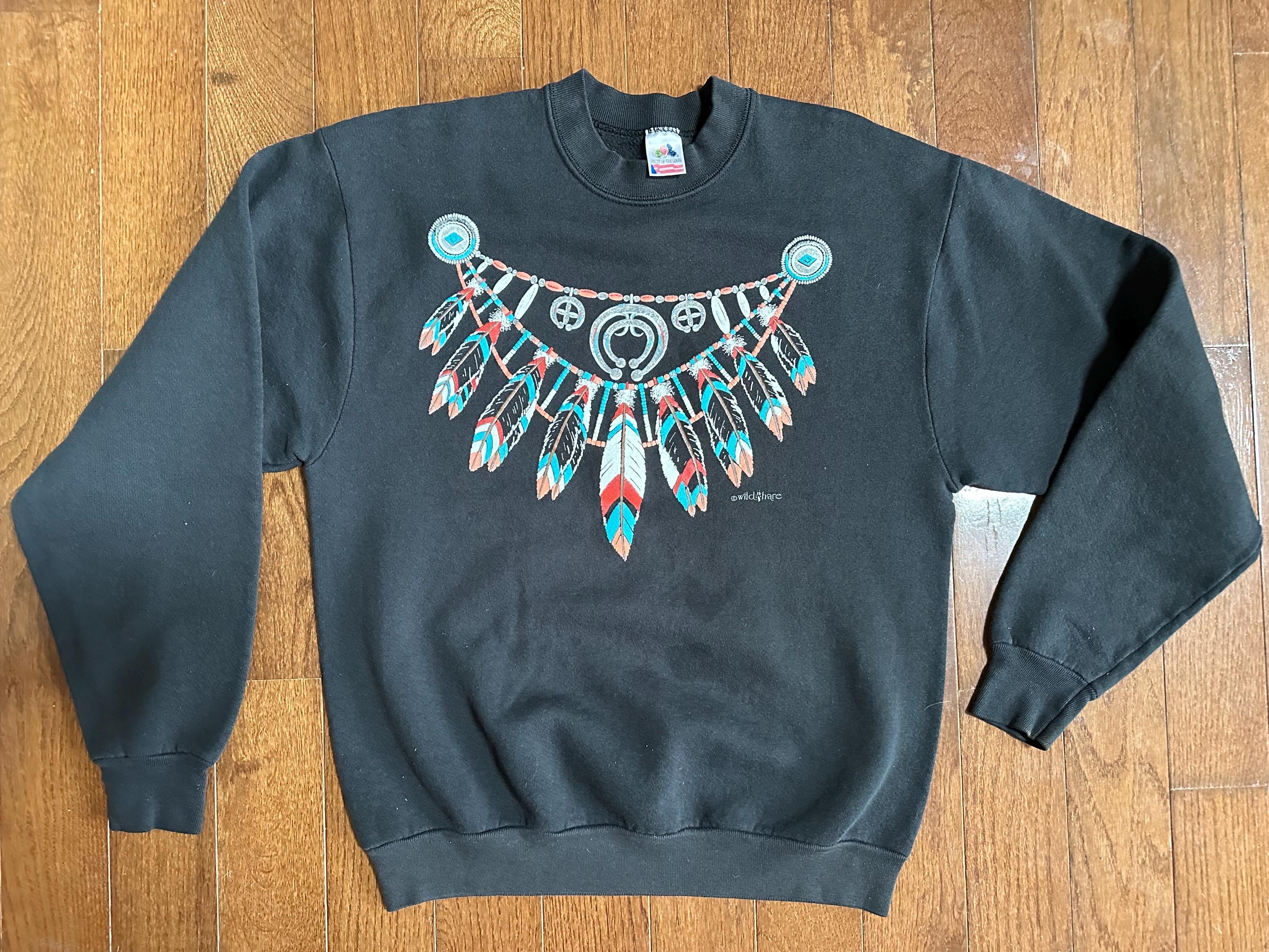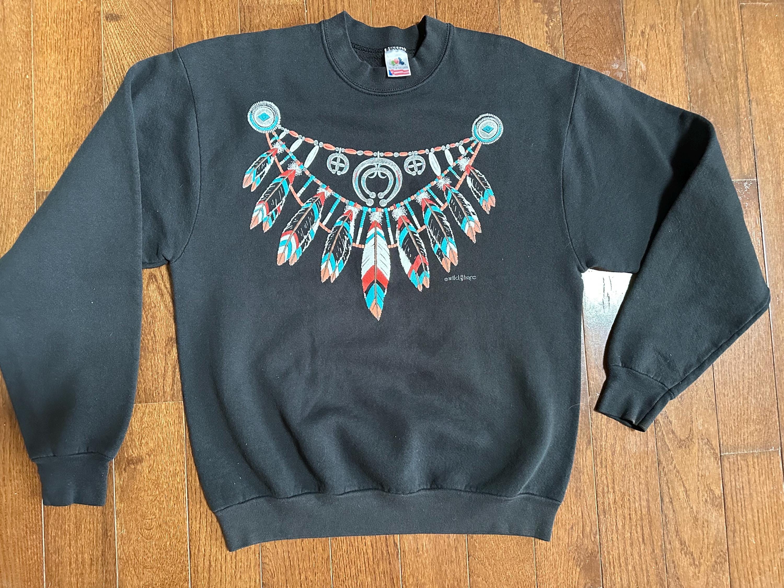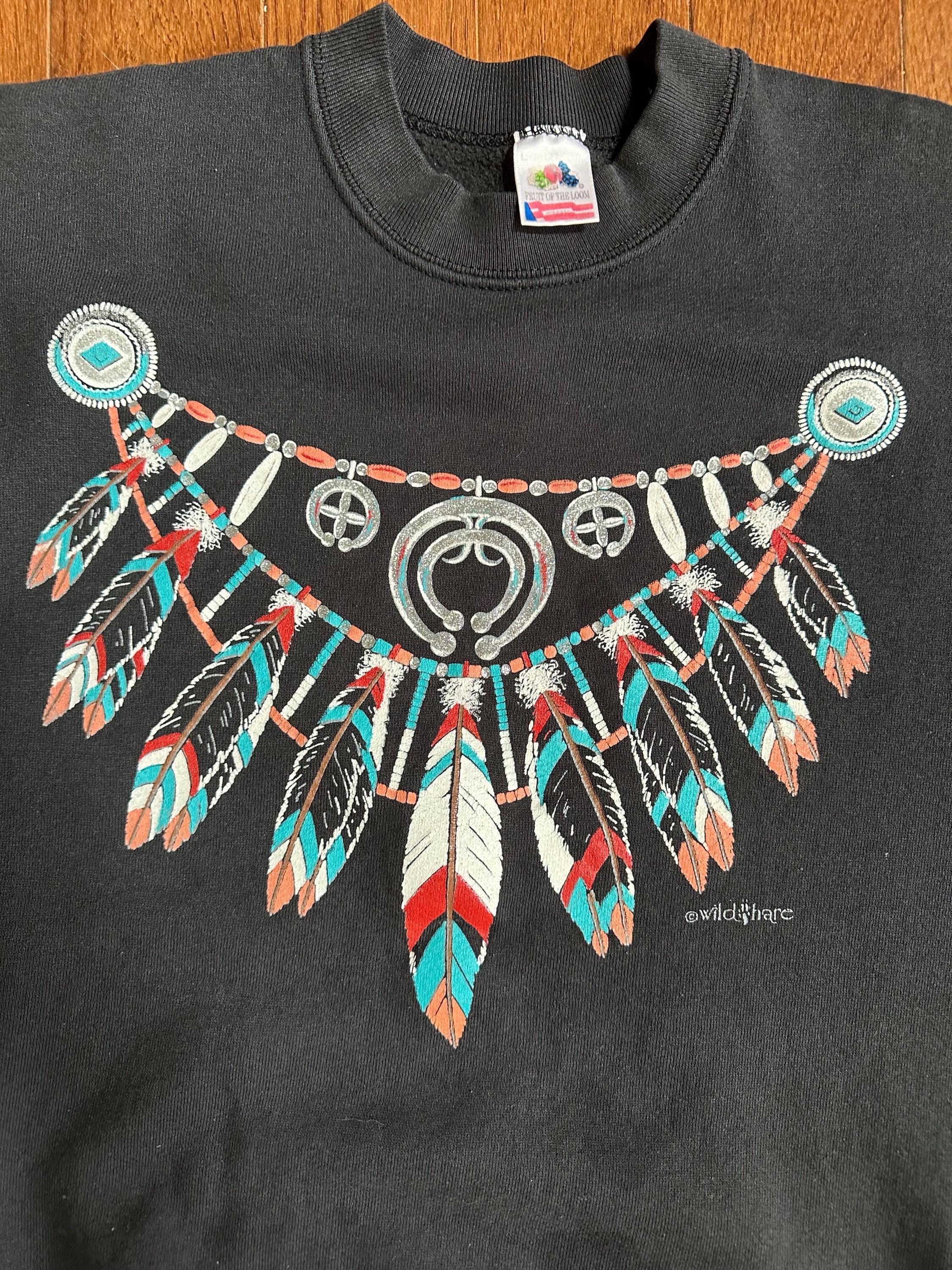 A classic 1990s graphic crewneck featuring a bold Native American–inspired design by Wildhare across the chest. The detailed feather and jewelry motif pops beautifully against the black base, giving it that unmistakable vintage Southwest aesthetic that defined the era.