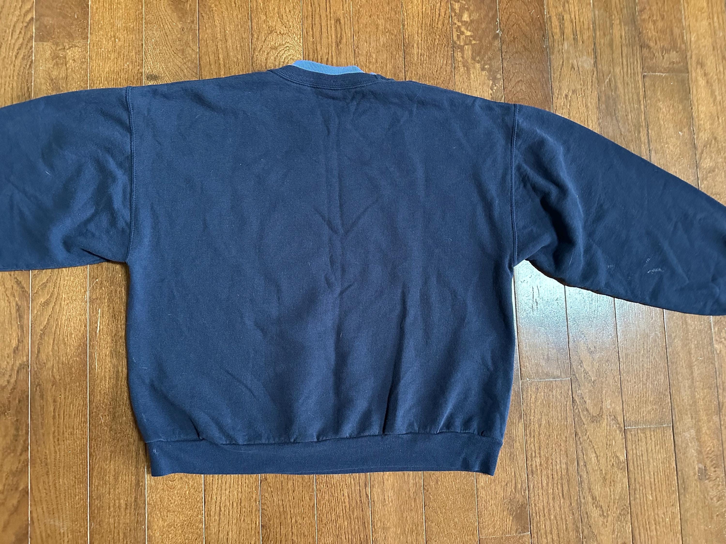 This sweatshirt has a unique double-collar neckline detail and a relaxed fit that layers beautifully over tees or thermals. The fabric is soft, lightweight, and perfectly worn in.