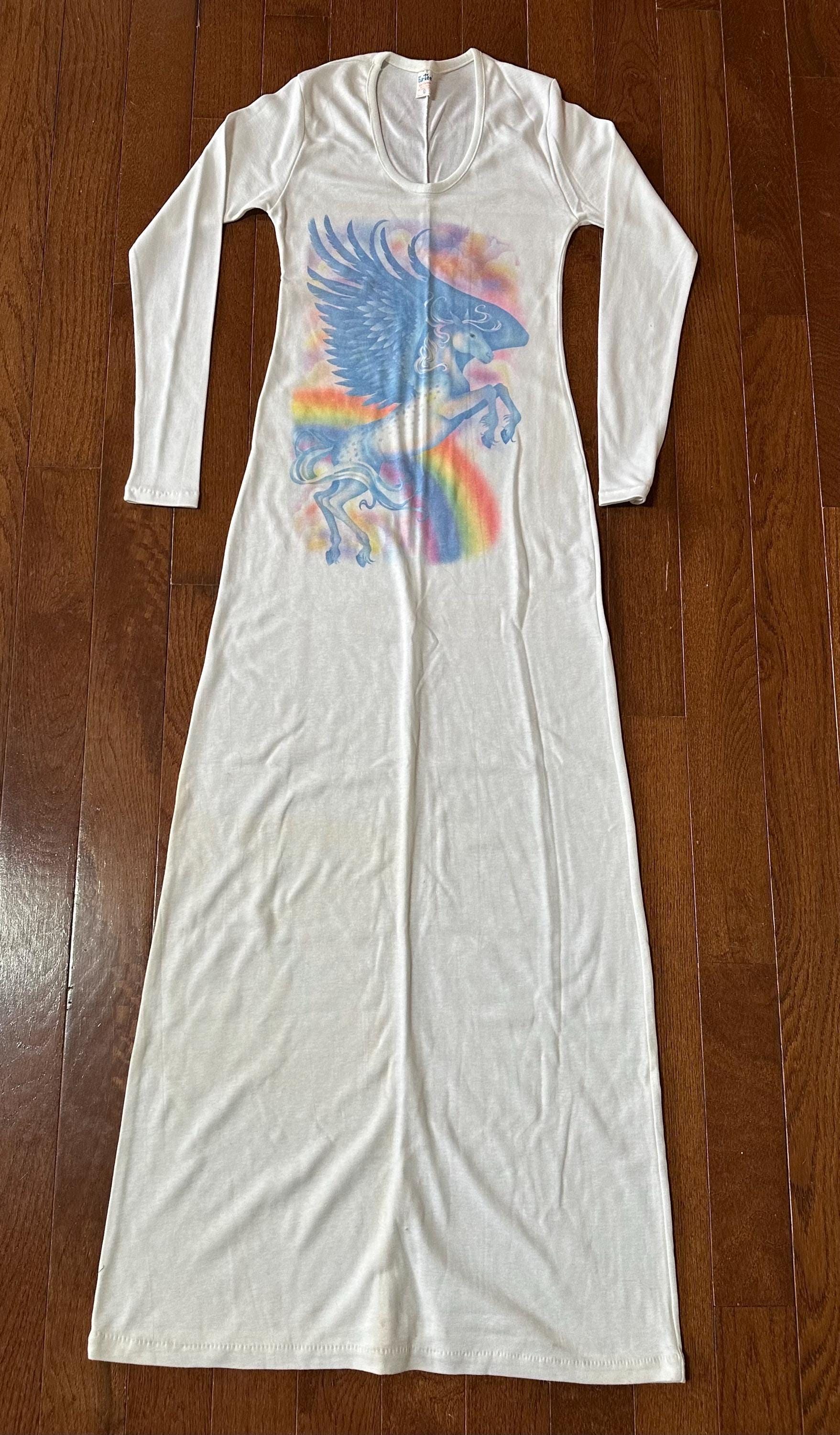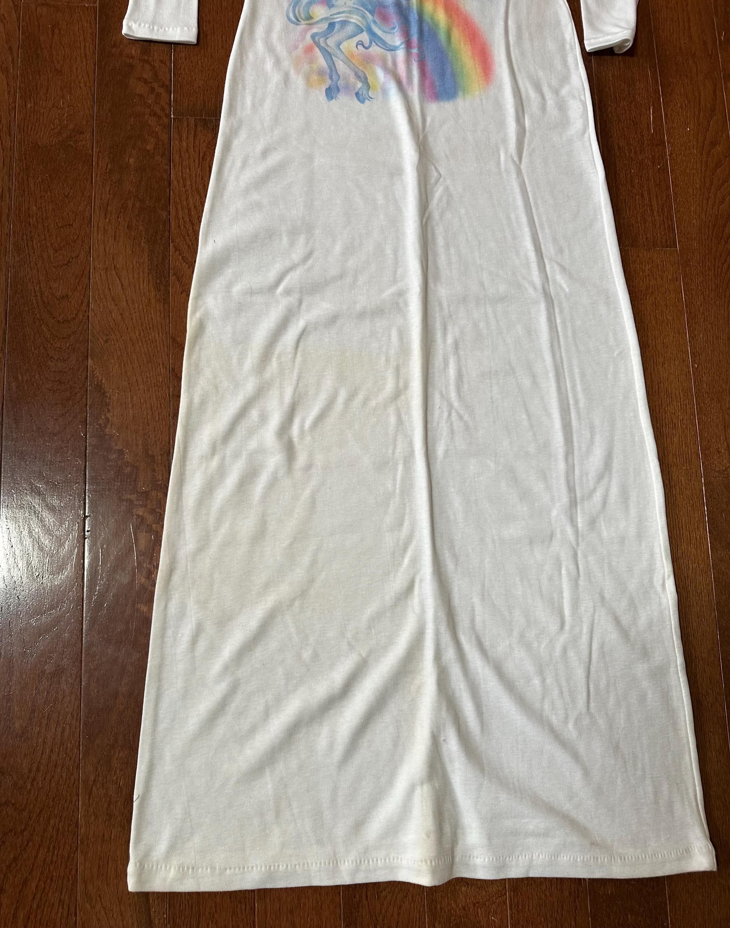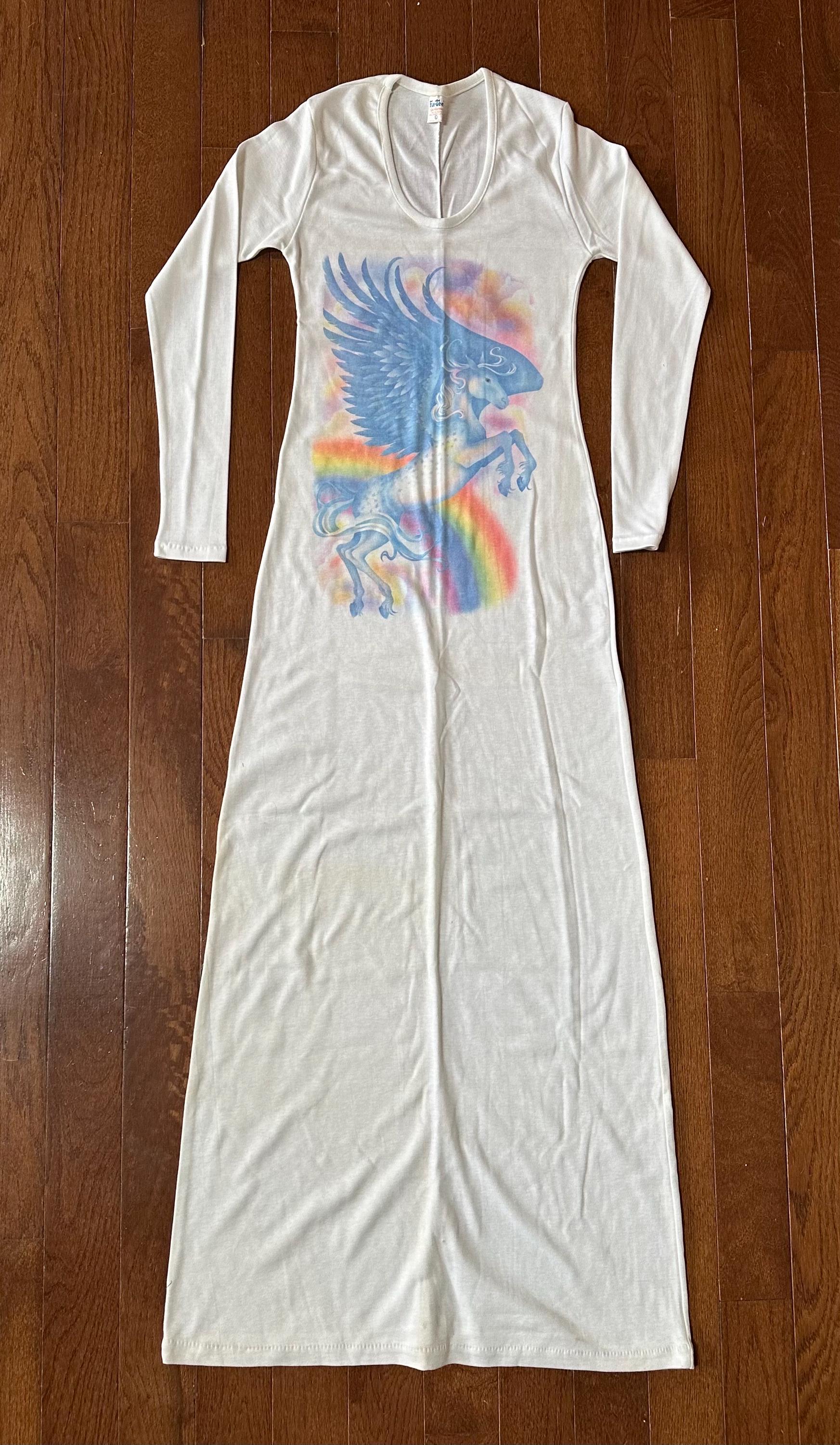 An incredible mid-century era Fun Tees Sportswear unicorn maxi dress featuring a soaring Pegasus surrounded by dreamy rainbow clouds, printed on soft white cotton blend fabric. It feels straight out of a fantasy paperback cover, a roller-rink poster, or a sun-bleached summer festival sometime decades ago.