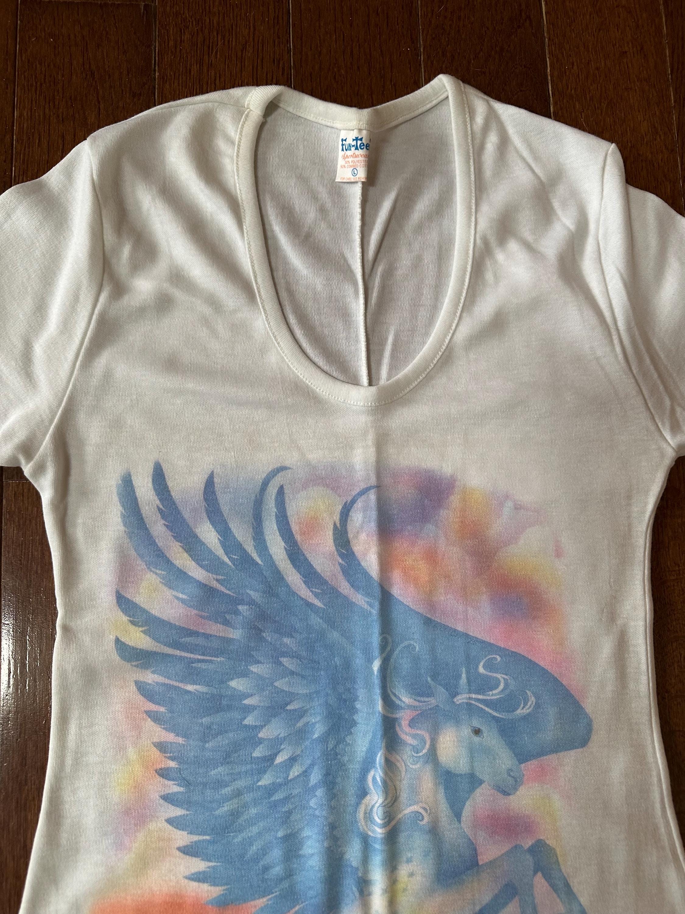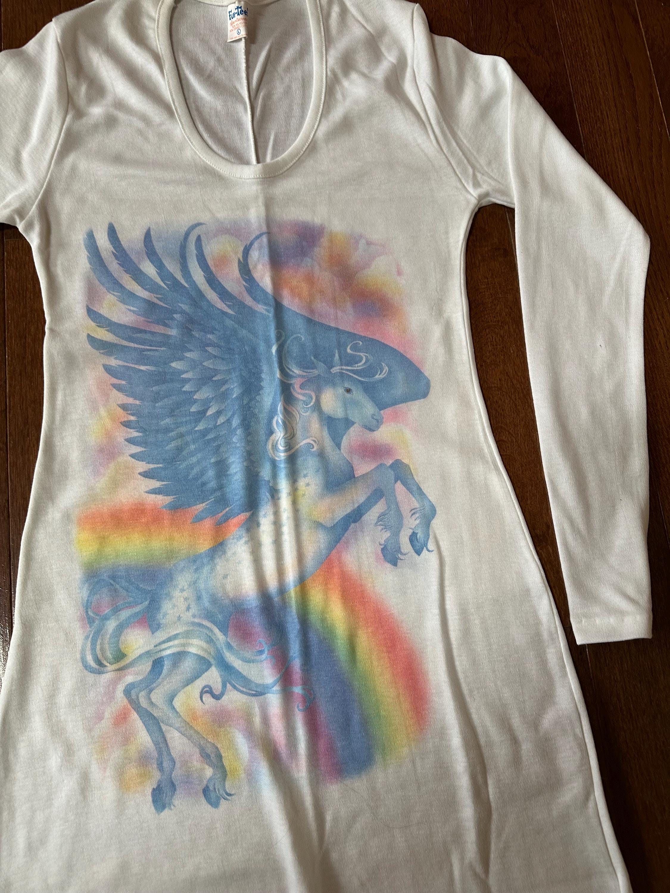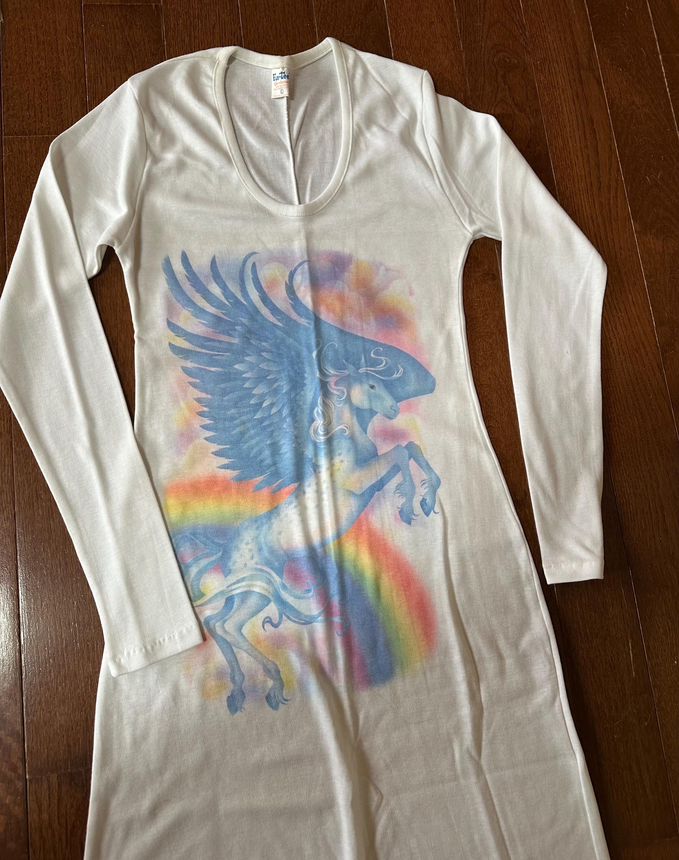 An incredible mid-century era Fun Tees Sportswear unicorn maxi dress featuring a soaring Pegasus surrounded by dreamy rainbow clouds, printed on soft white cotton blend fabric. It feels straight out of a fantasy paperback cover, a roller-rink poster, or a sun-bleached summer festival sometime decades ago.