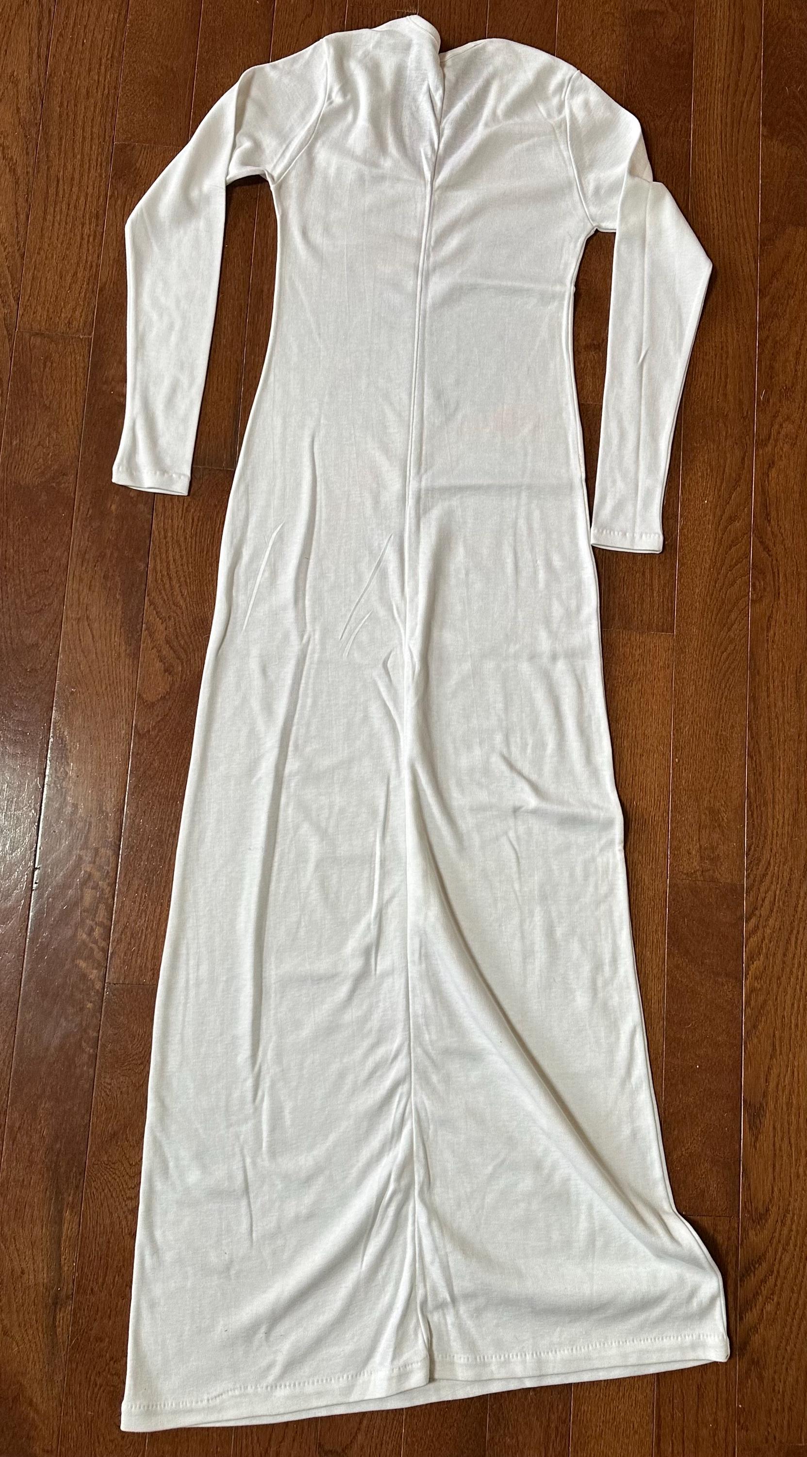 Very slim through the body with an ultra-long maxi length. Best for a modern XS–Small, depending on desired fit. Always compare measurements for best fit.