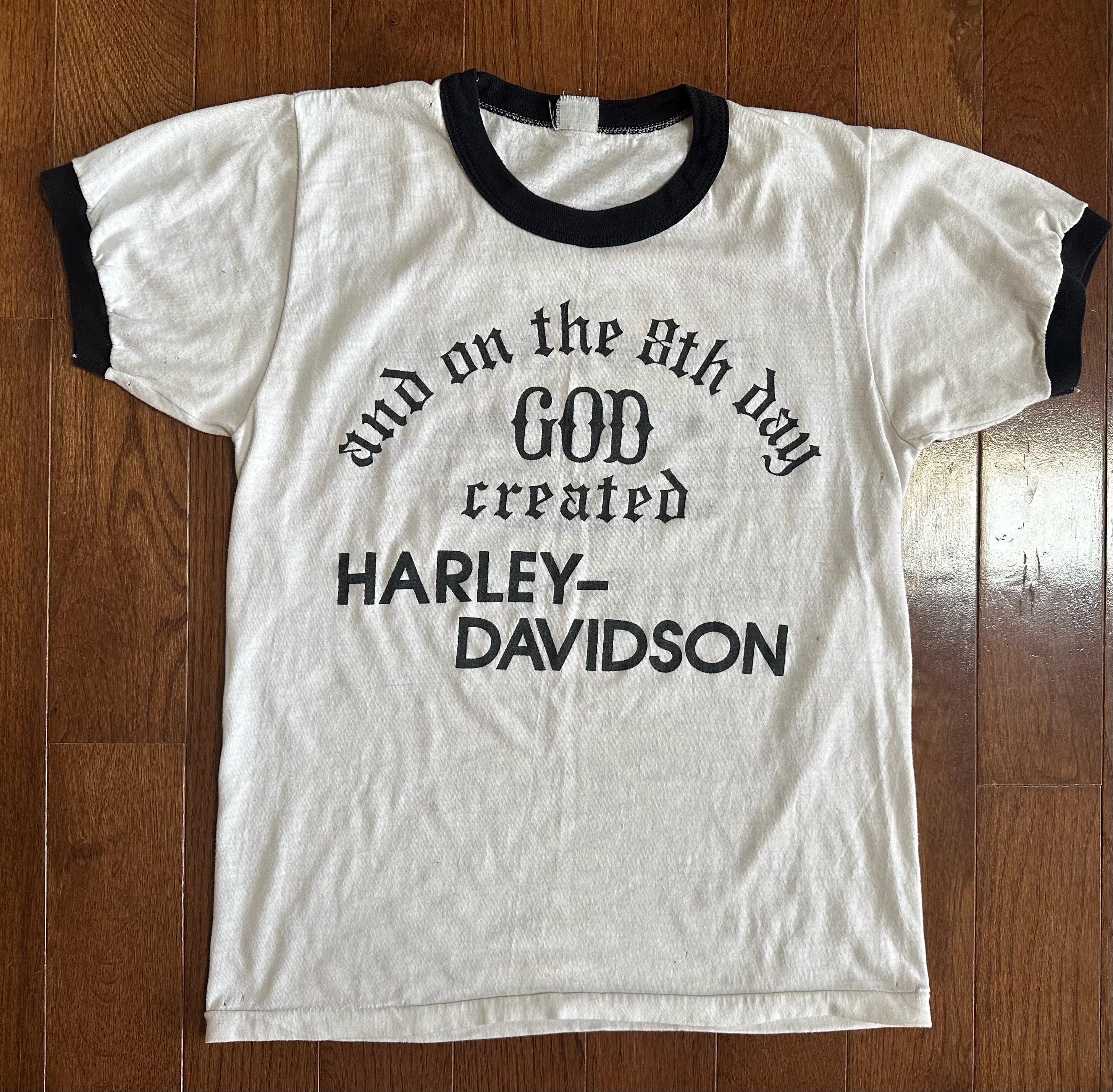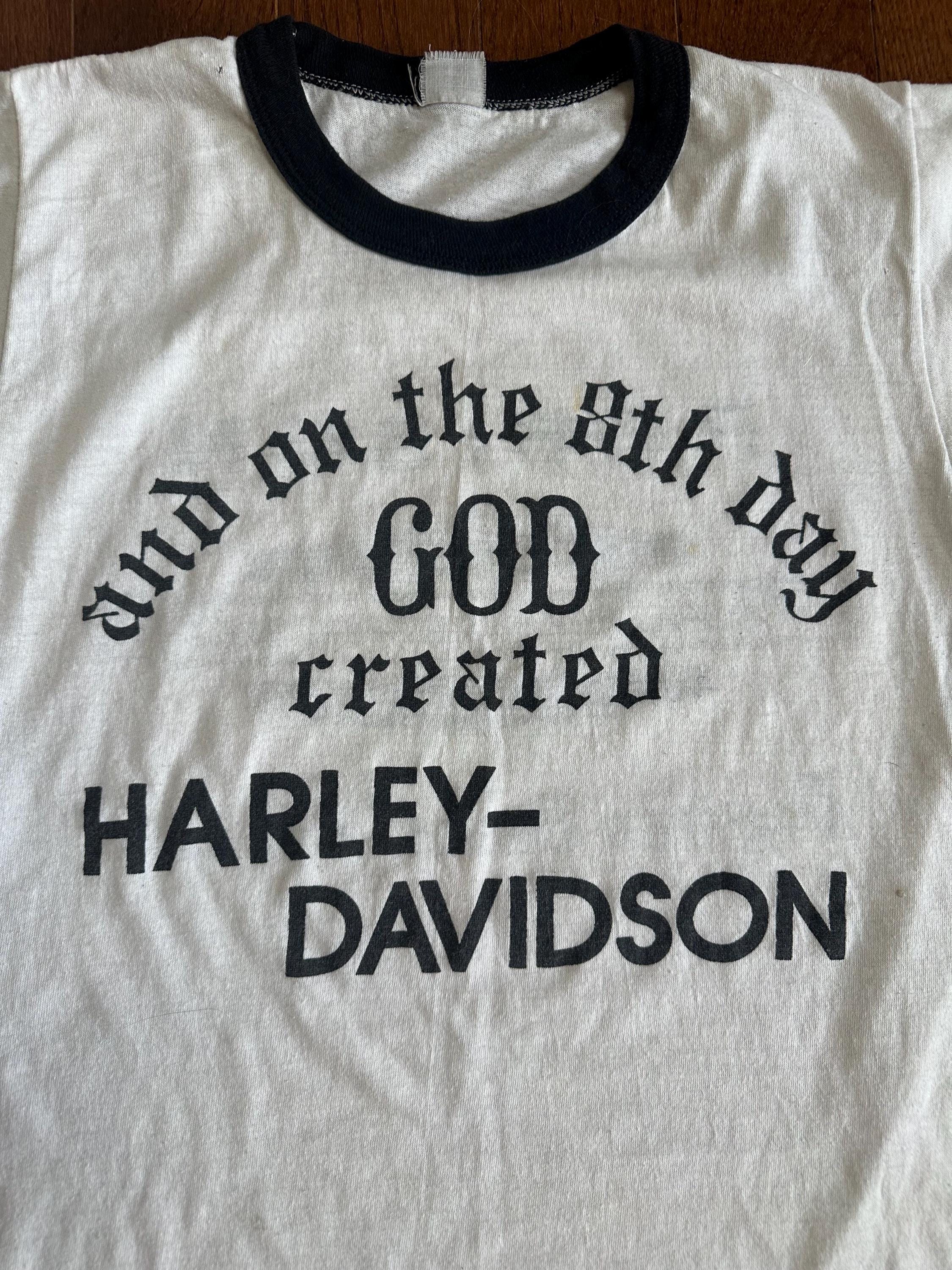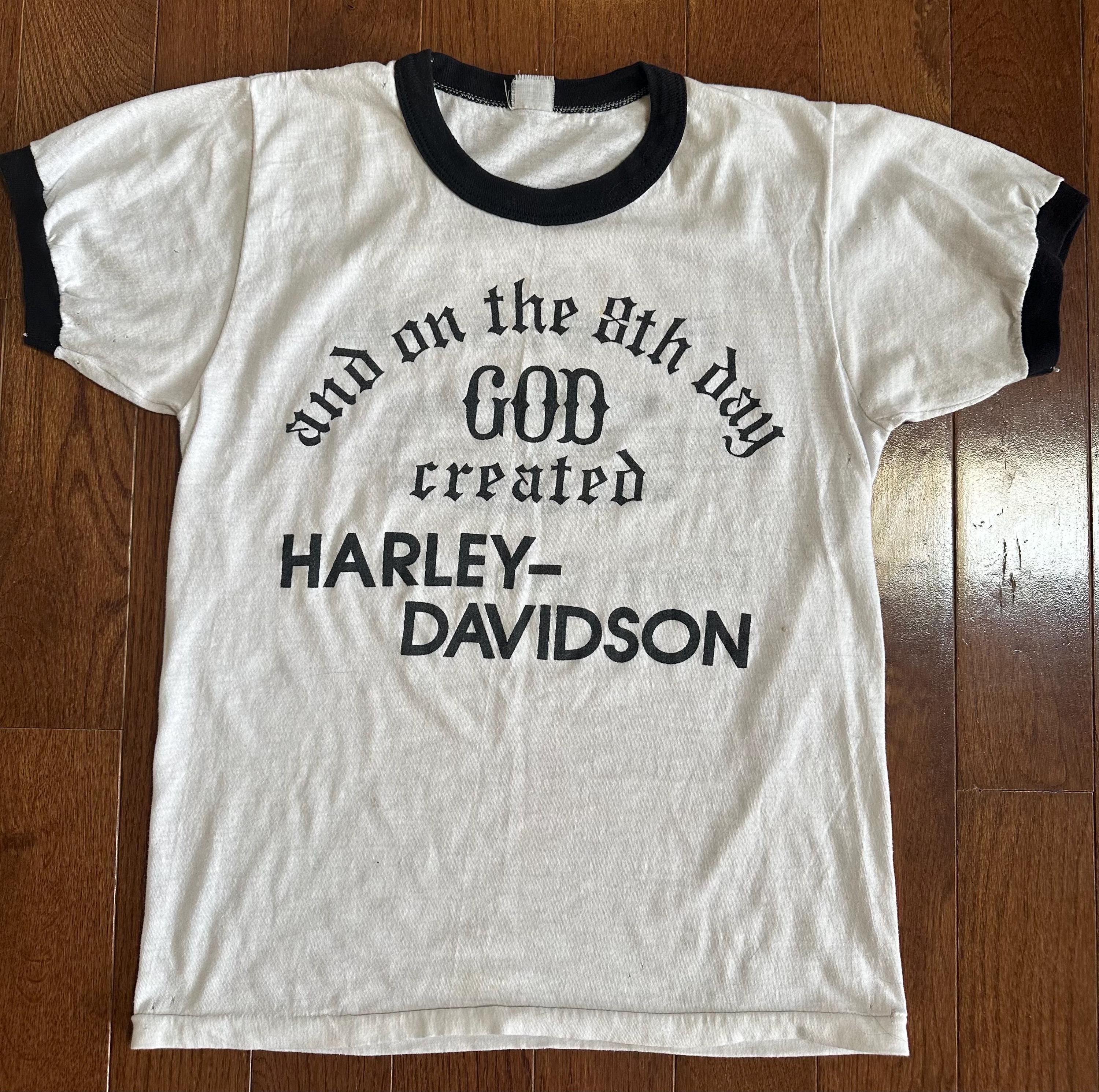 A perfectly worn vintage Harley-Davidson ringer tee featuring the iconic “And on the 8th day God created Harley-Davidson” graphic, paired with a Daytona Beach, Florida dealership back print. Classic biker humor, road culture history, and the kind of authenticity that can’t be replicated.