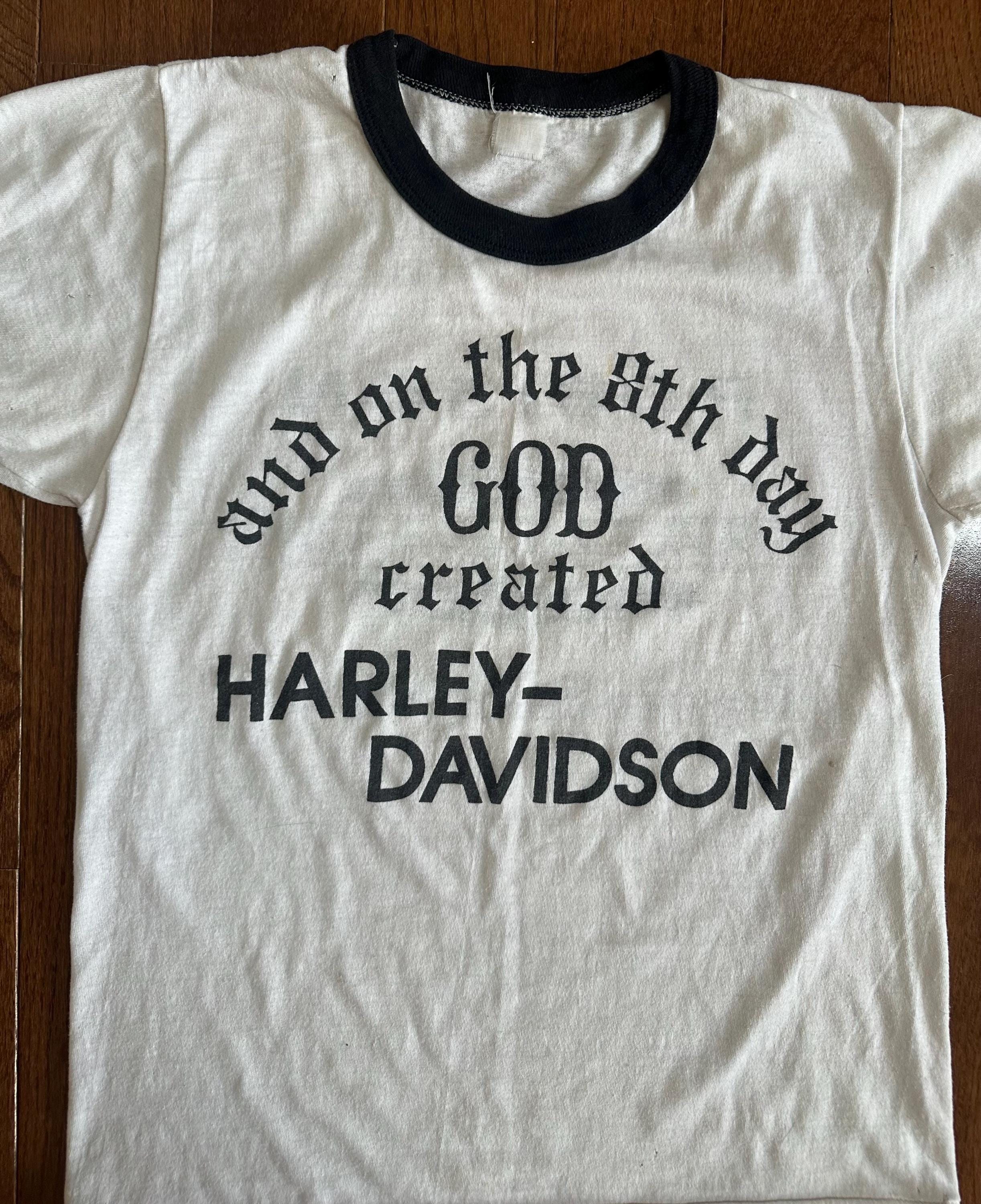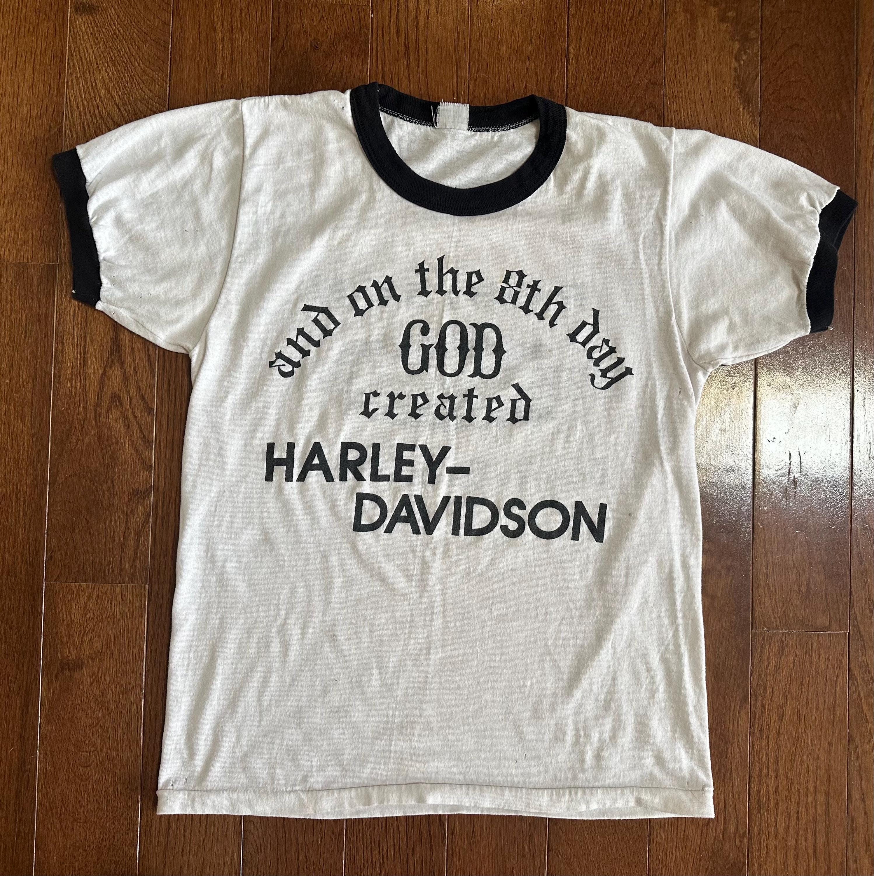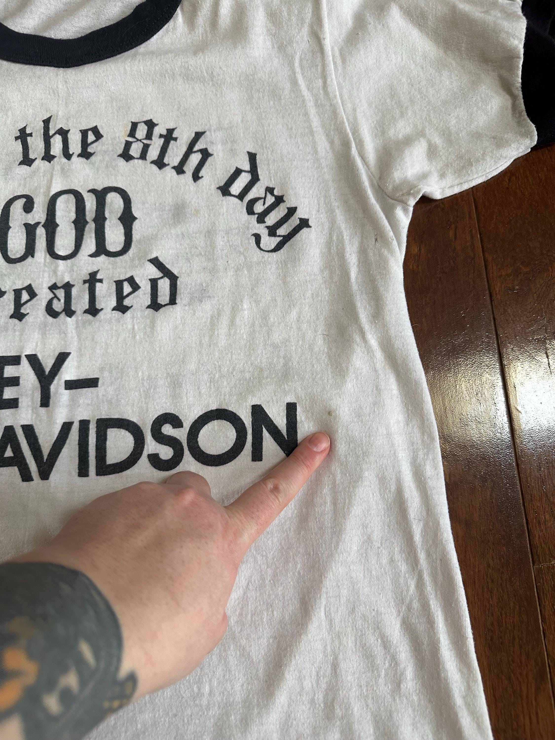 A perfectly worn vintage Harley-Davidson ringer tee featuring the iconic “And on the 8th day God created Harley-Davidson” graphic, paired with a Daytona Beach, Florida dealership back print. Classic biker humor, road culture history, and the kind of authenticity that can’t be replicated.