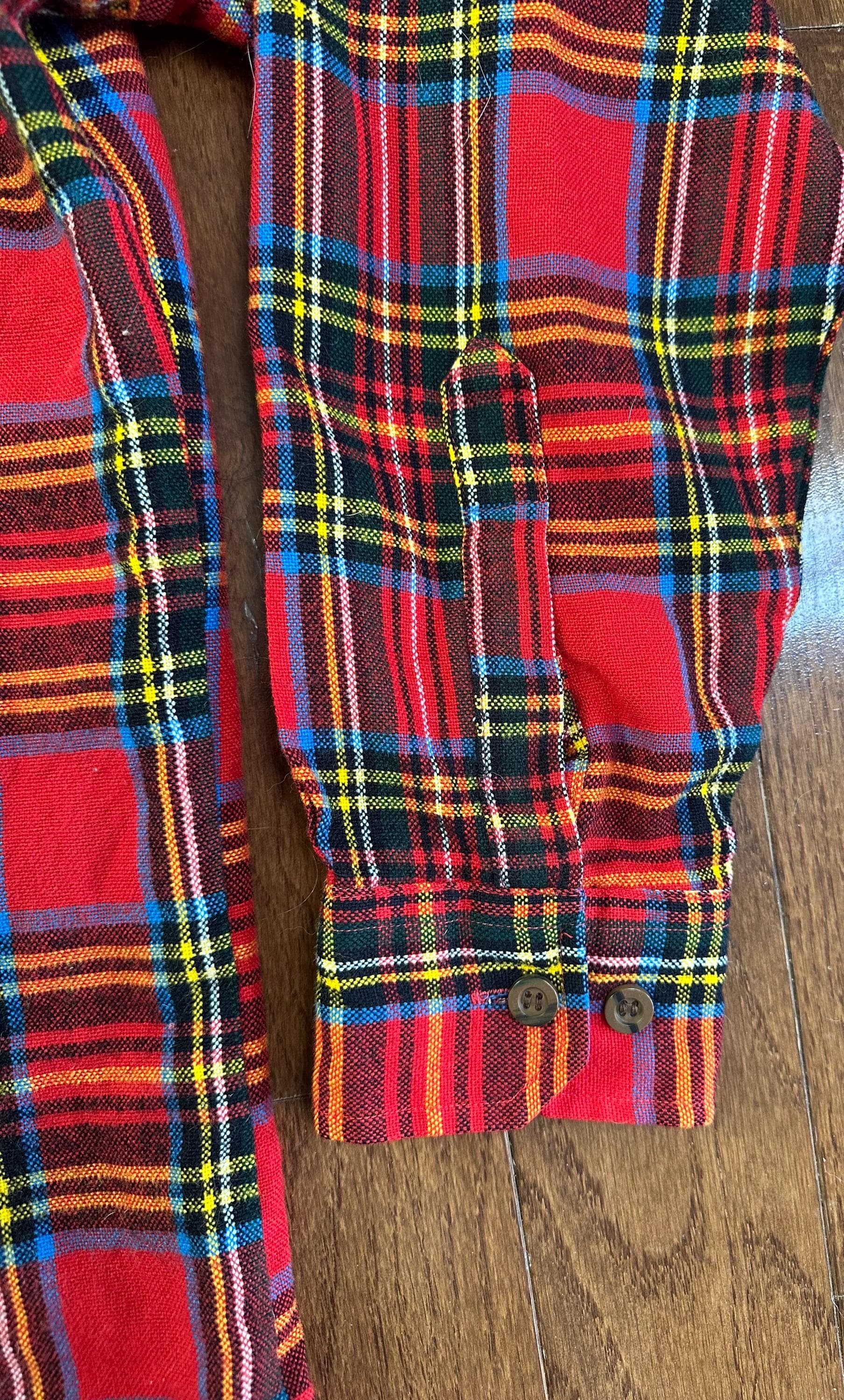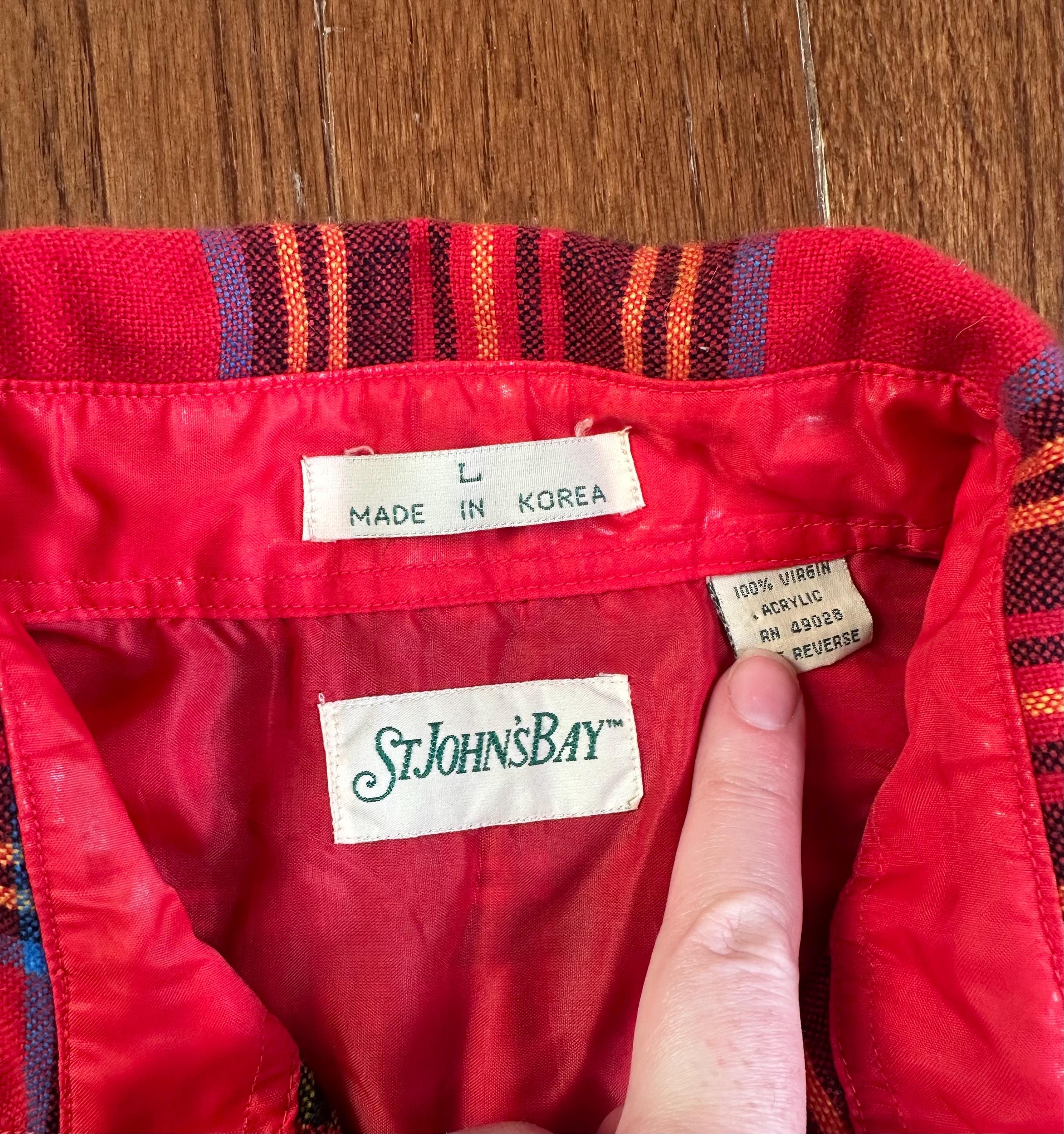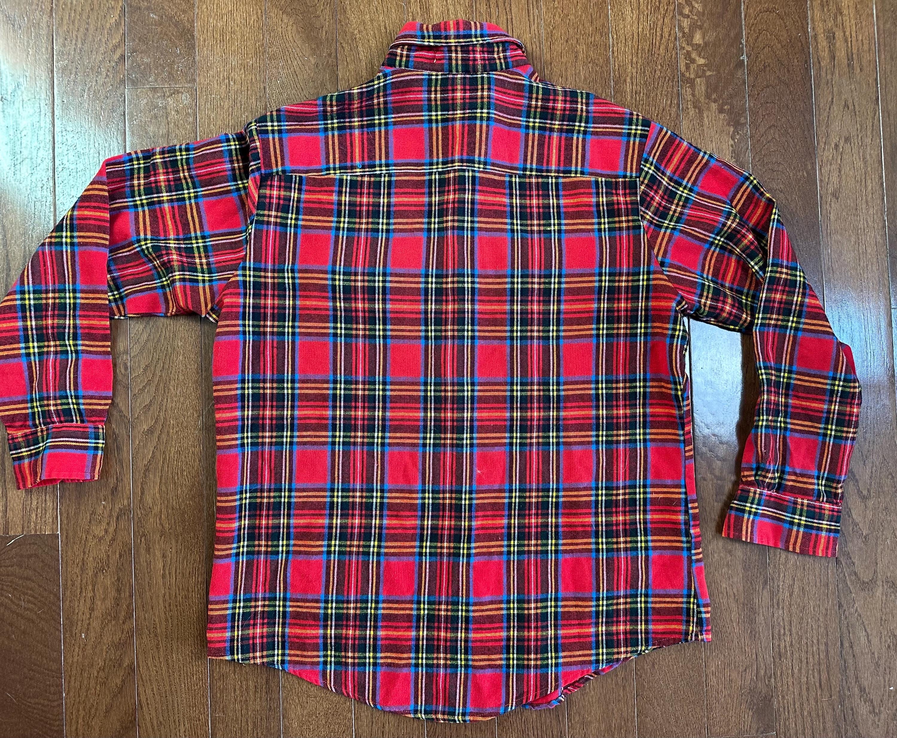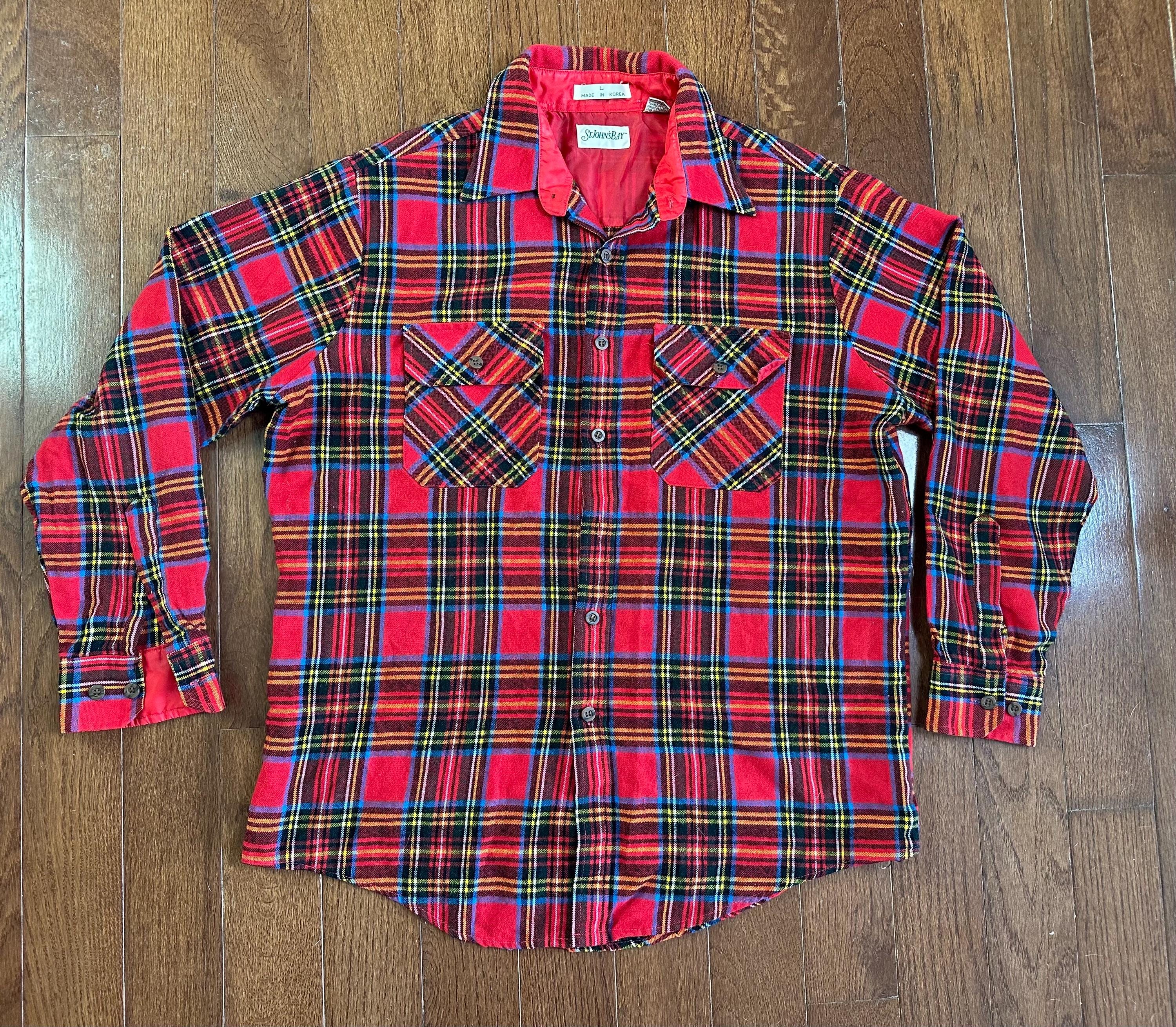 A true 1970s St. John’s Bay plaid flannel in one of those colorways you just don’t come across often. Bold red with layered tones throughout, giving it that rich, lived-in look that feels straight out of a mountain town.