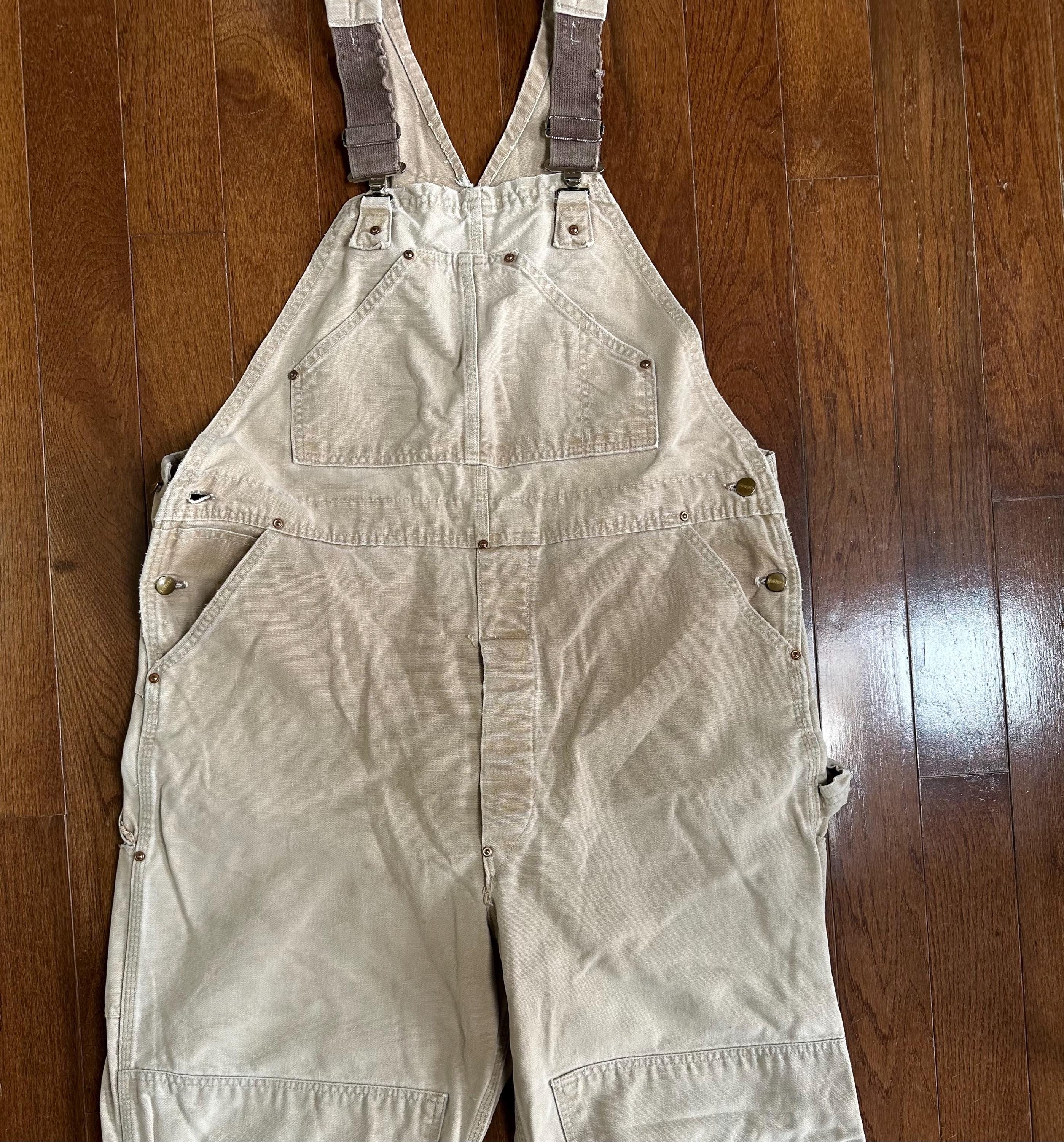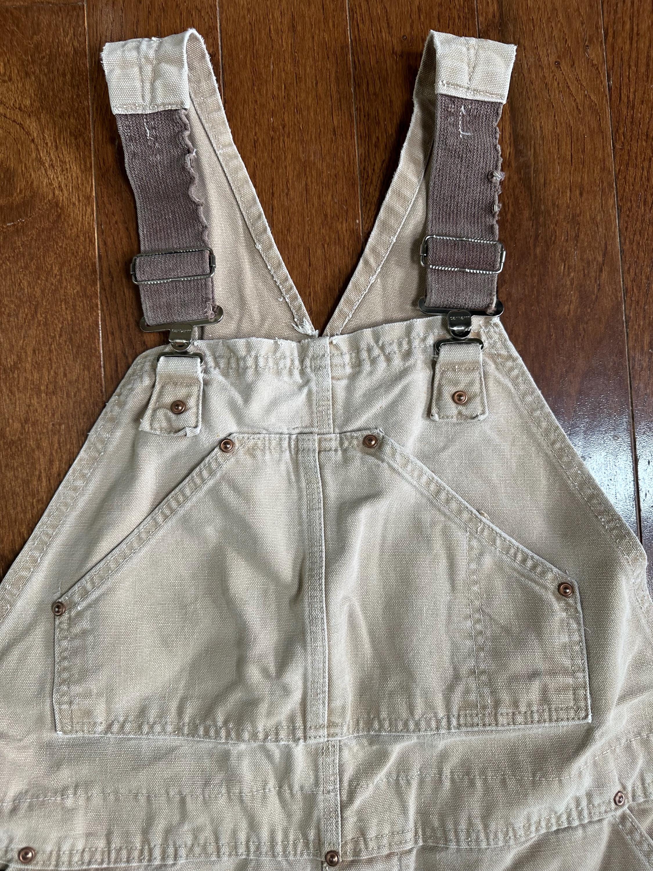 A vintage Carhartt pair in a soft tan canvas, broken in perfectly with natural fading and wear throughout. The distressing on the straps and fabric gives them that authentic, lived-in workwear look that Carhartt is known for.