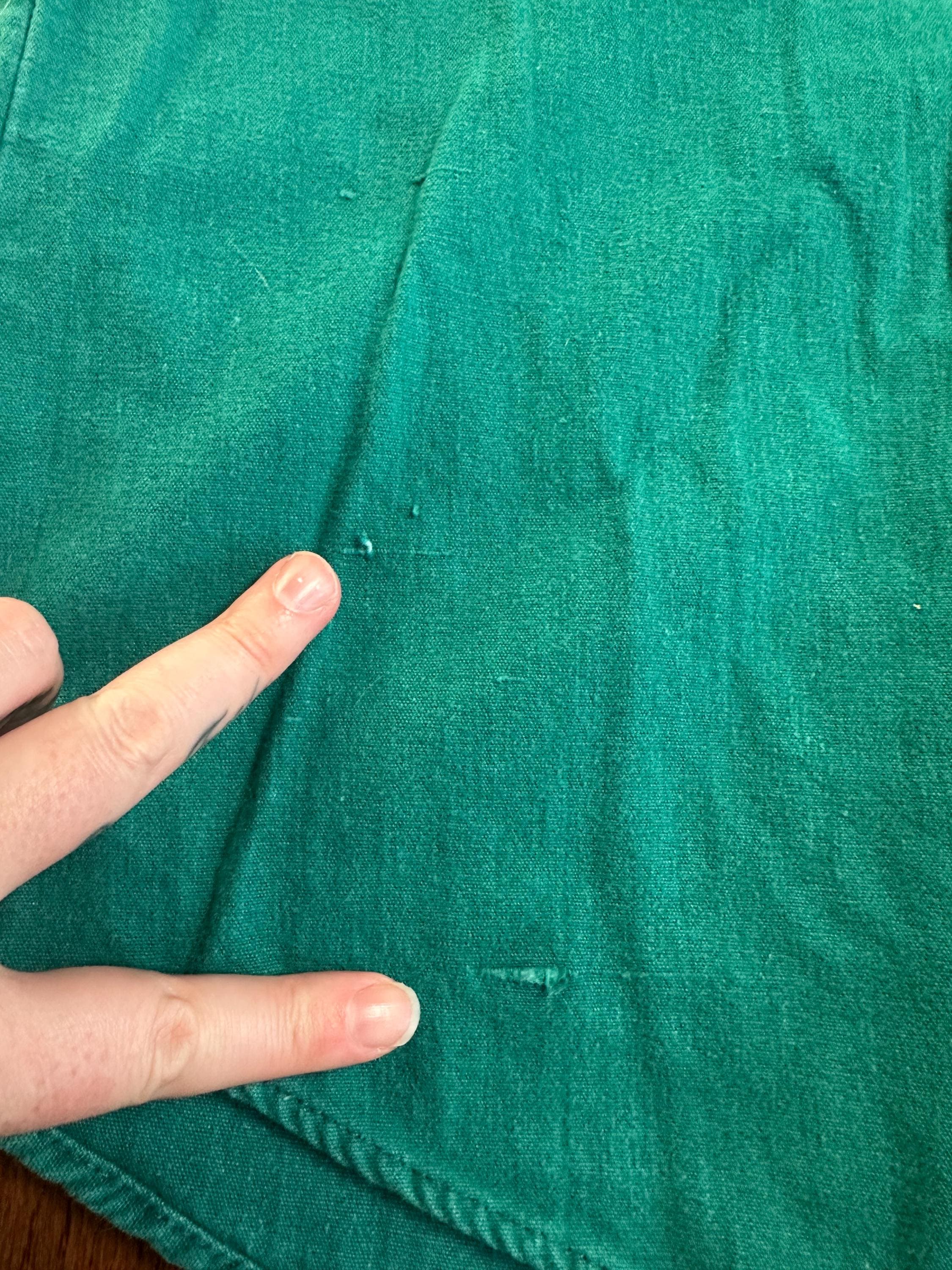 There is visible wear, including small holes/snags on the front and under the arm (see photos). Nothing that takes away from the overall character; if anything, it adds to that authentic vintage workwear look.