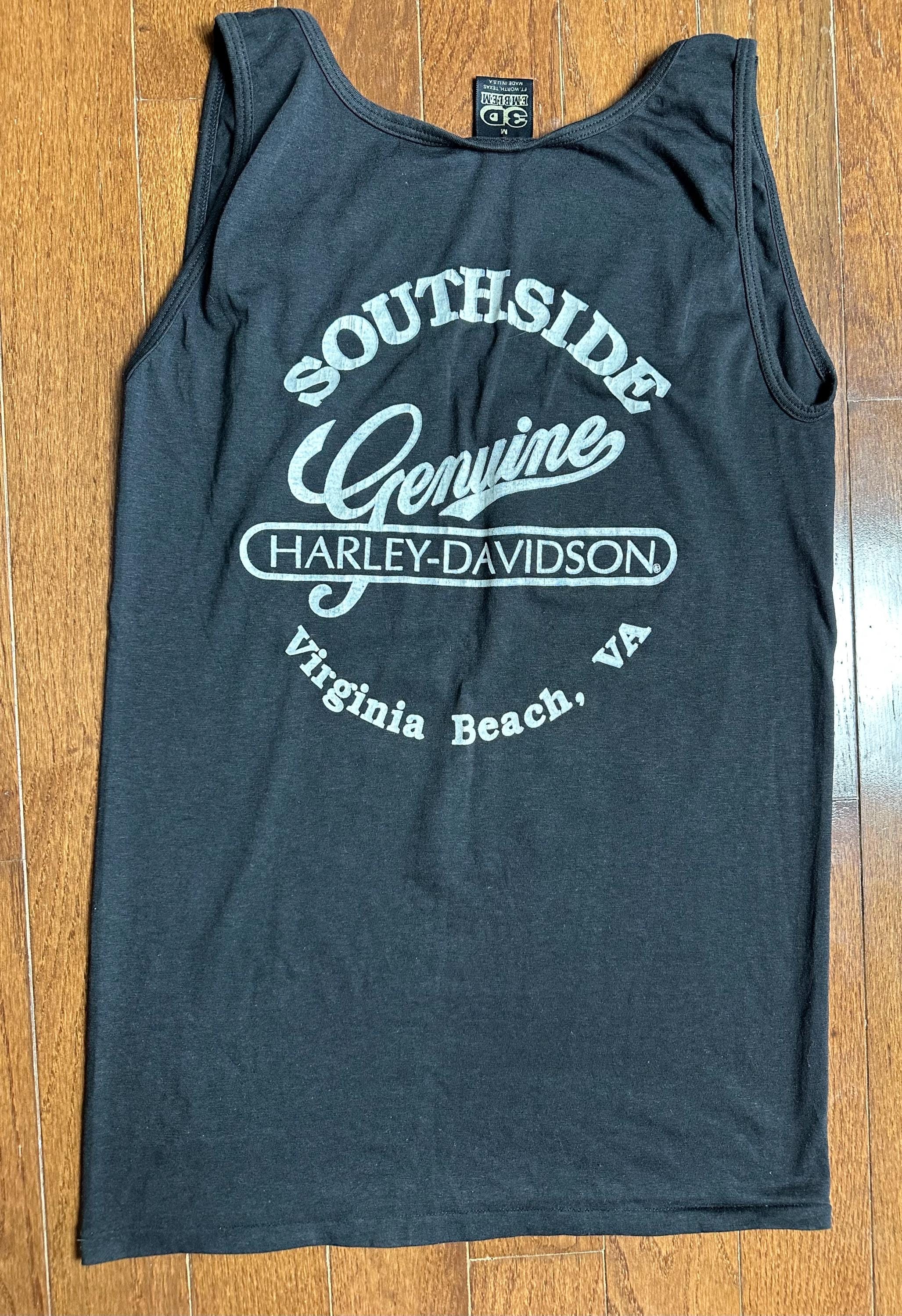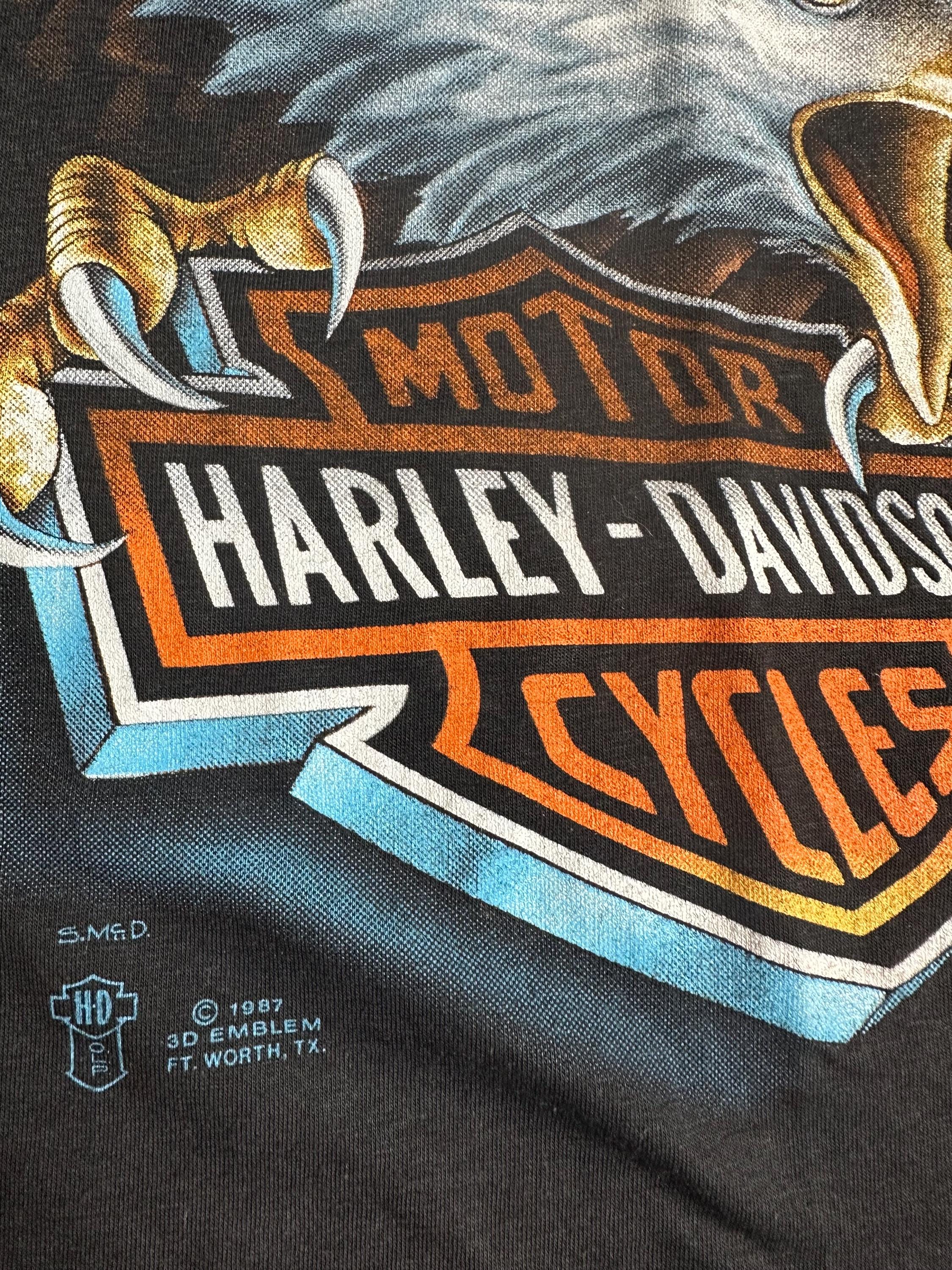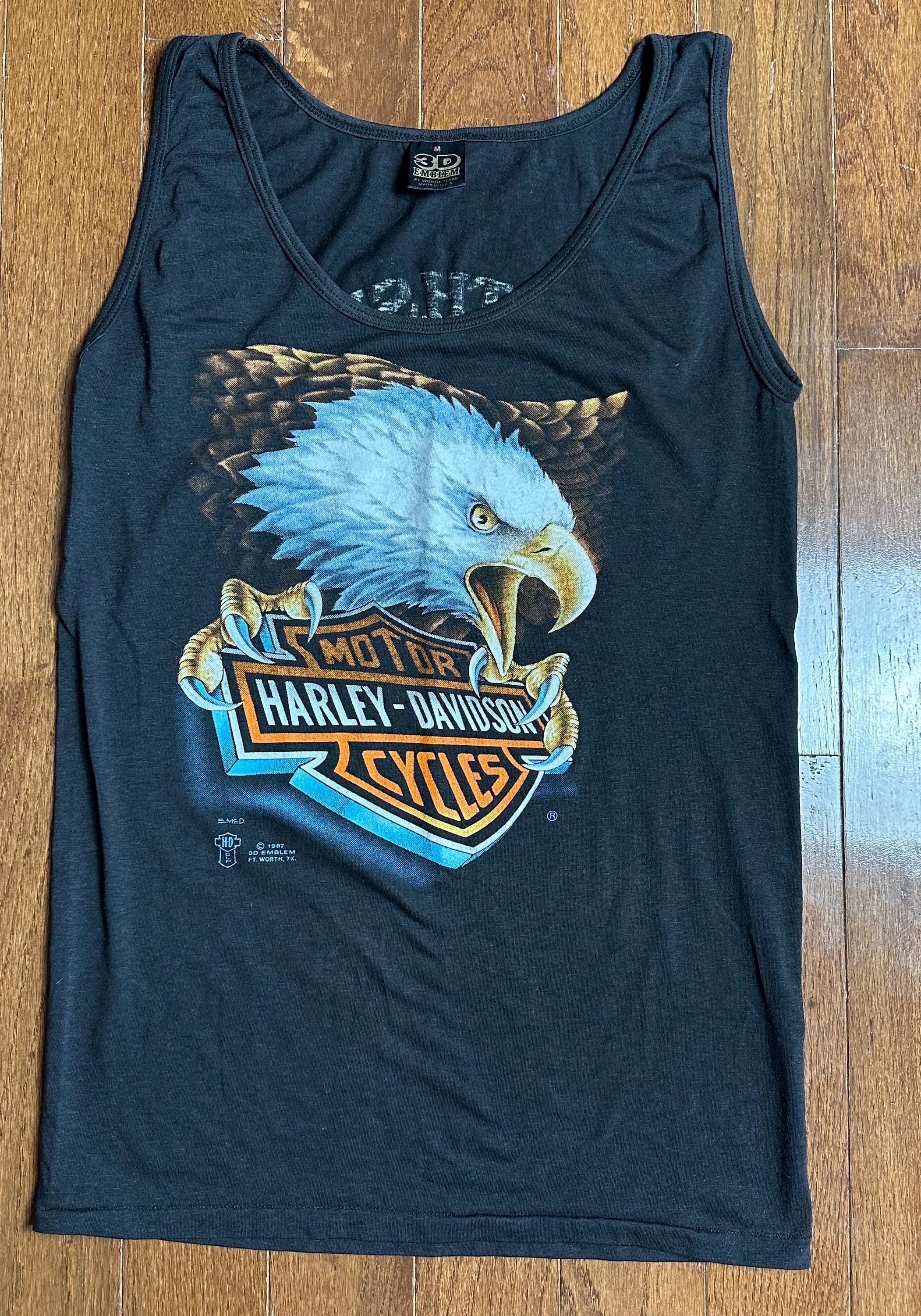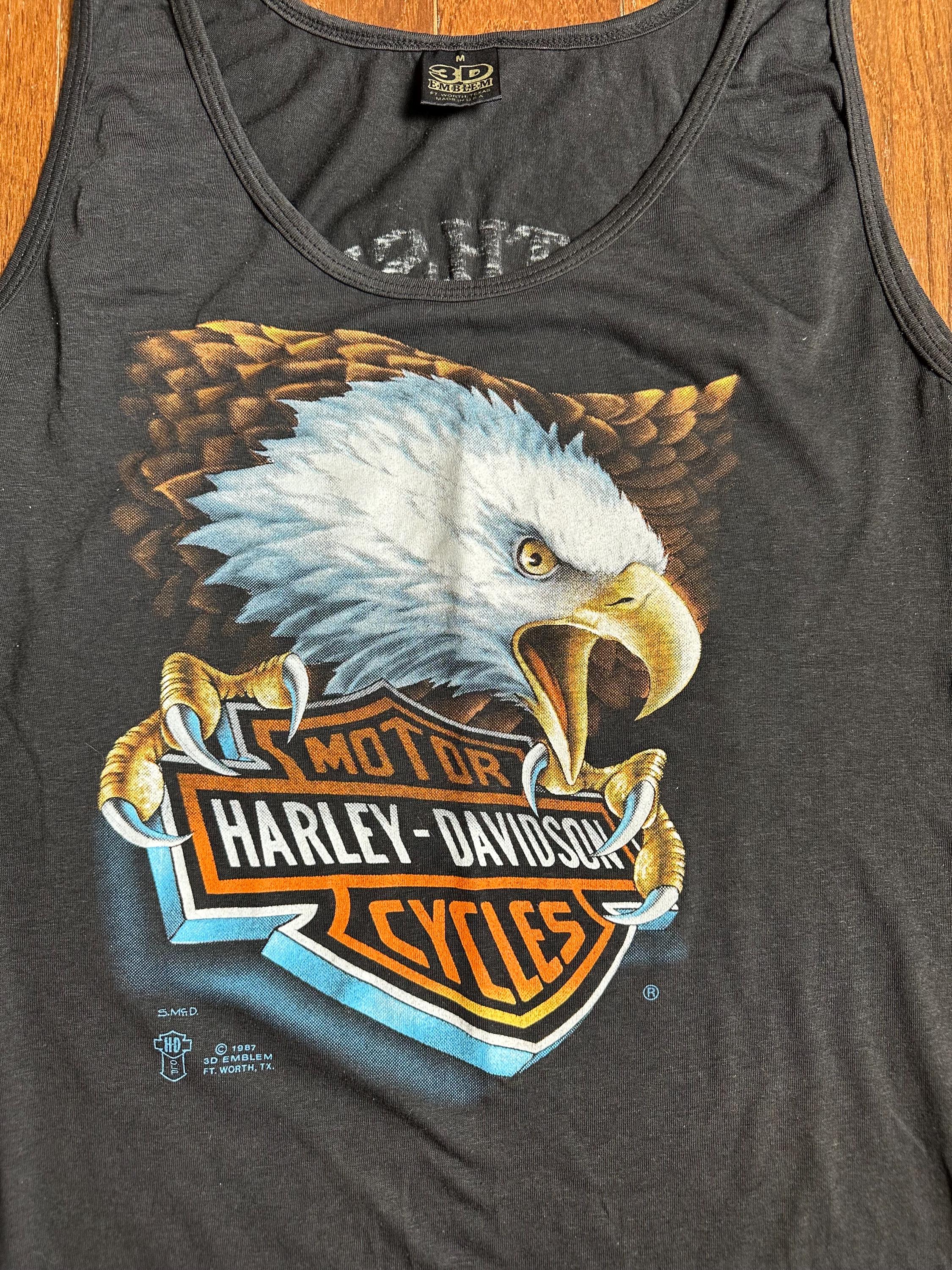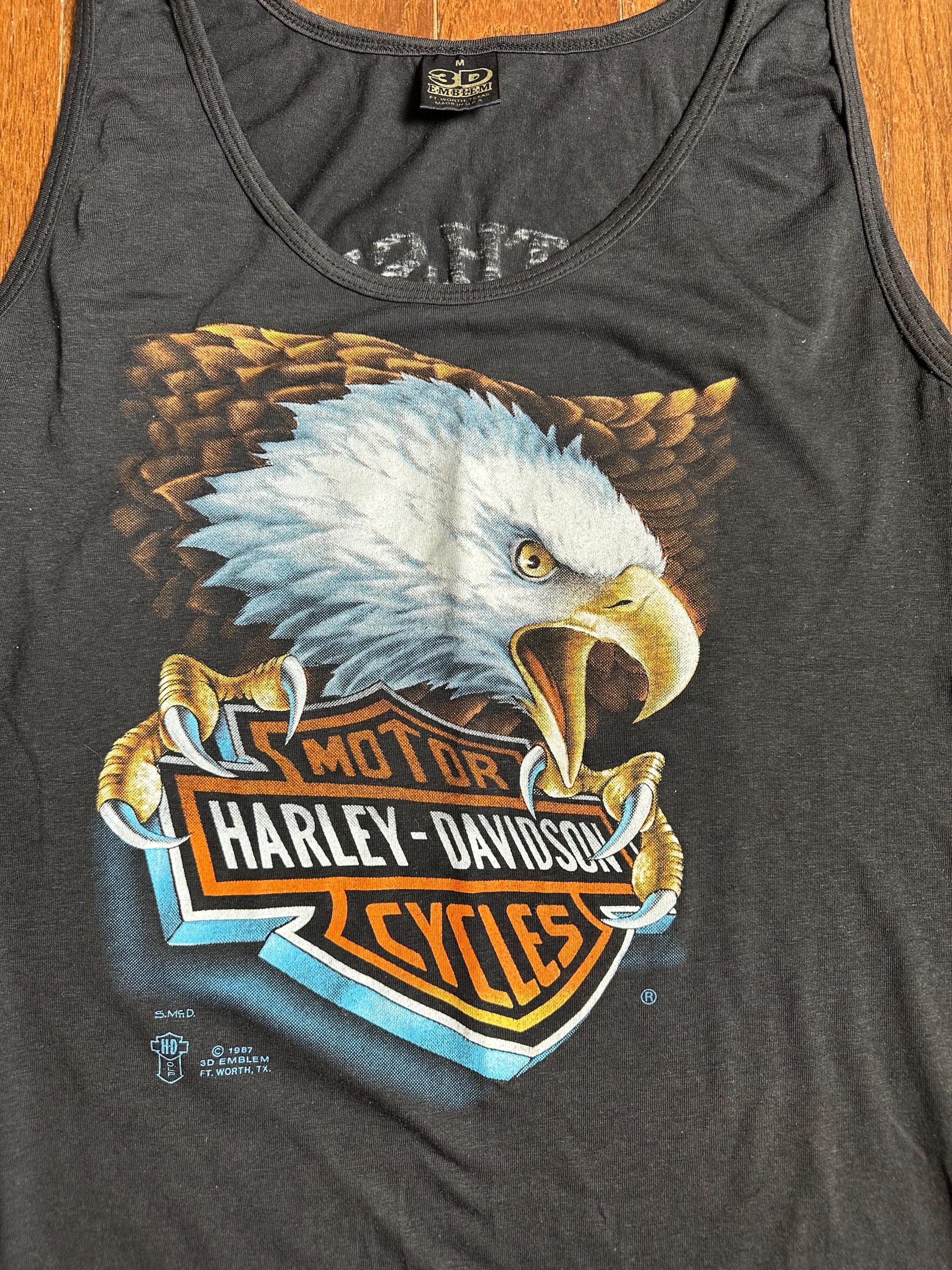 An original 1987 3D Emblem Harley Davidson tank featuring a bold eagle graphic across the front and a classic back hit from Virginia Beach. The colors, the detail, and the placement all come together in that unmistakable way that made these pieces so collectible.