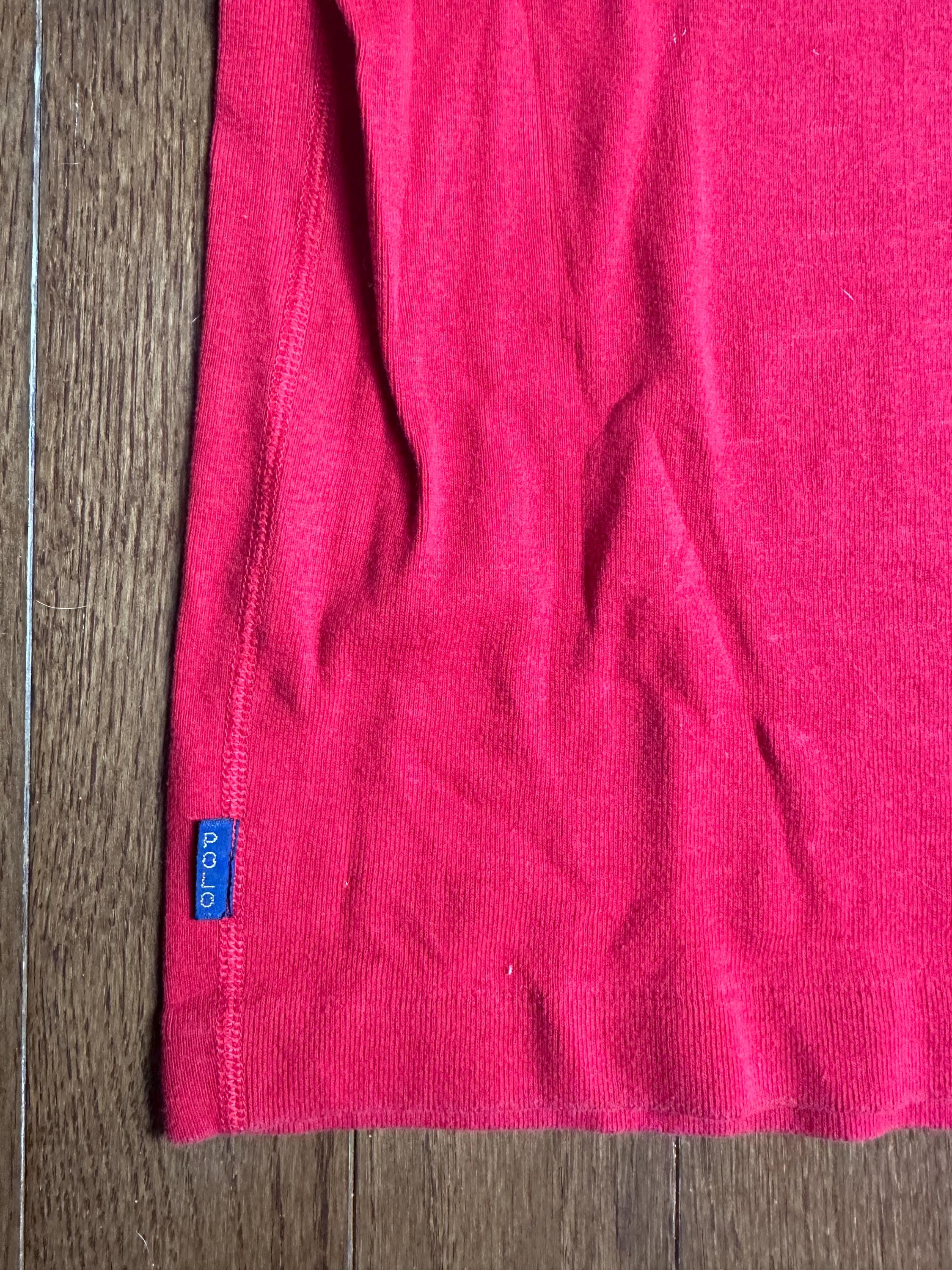 A vintage Polo by Ralph Lauren henley in a rich, worn-in red, made from 100% heavyweight cotton that gives it structure while still feeling soft and lived-in. The three-button neckline adds just enough detail, making it easy to wear on its own or layered under jackets and knits.