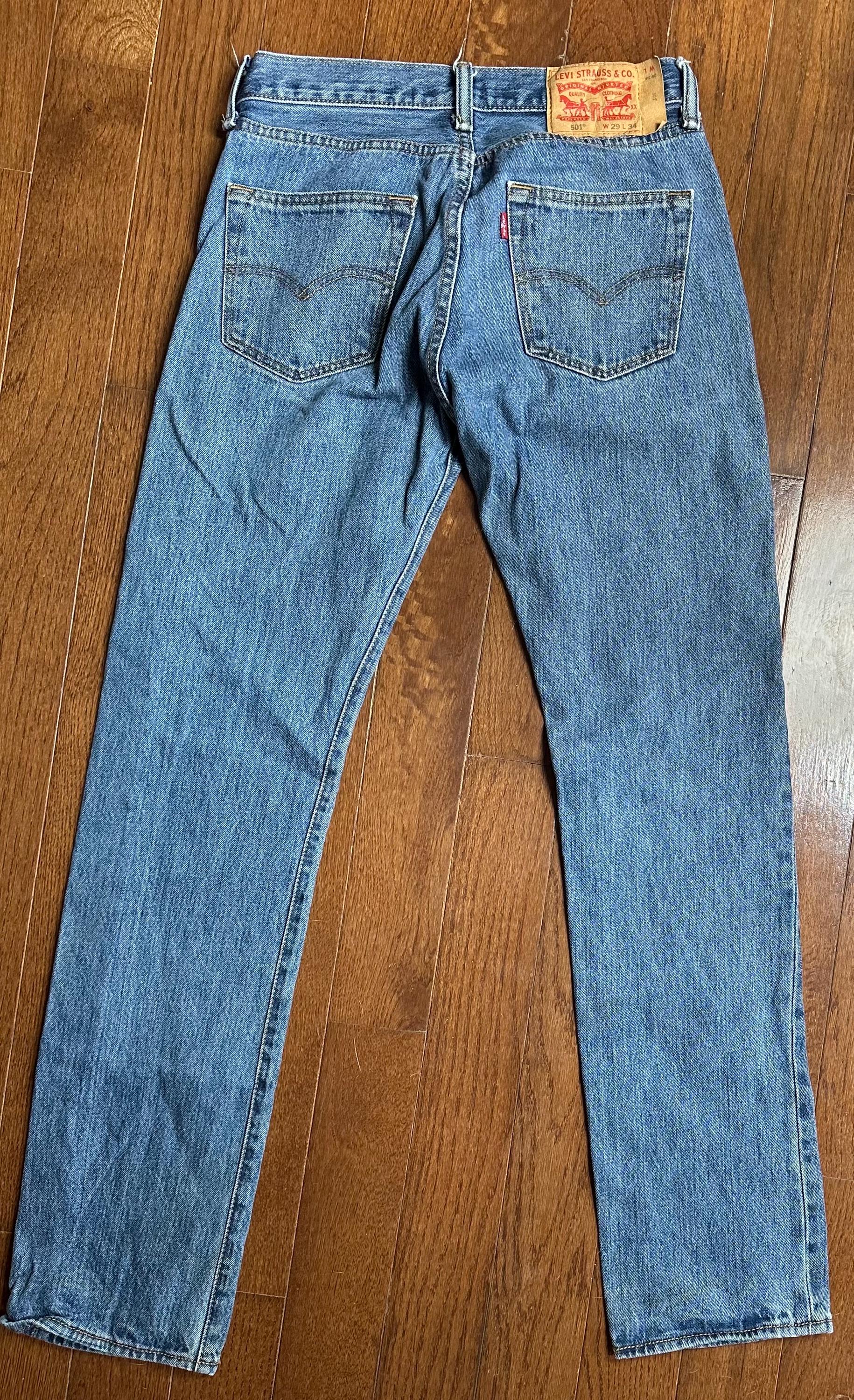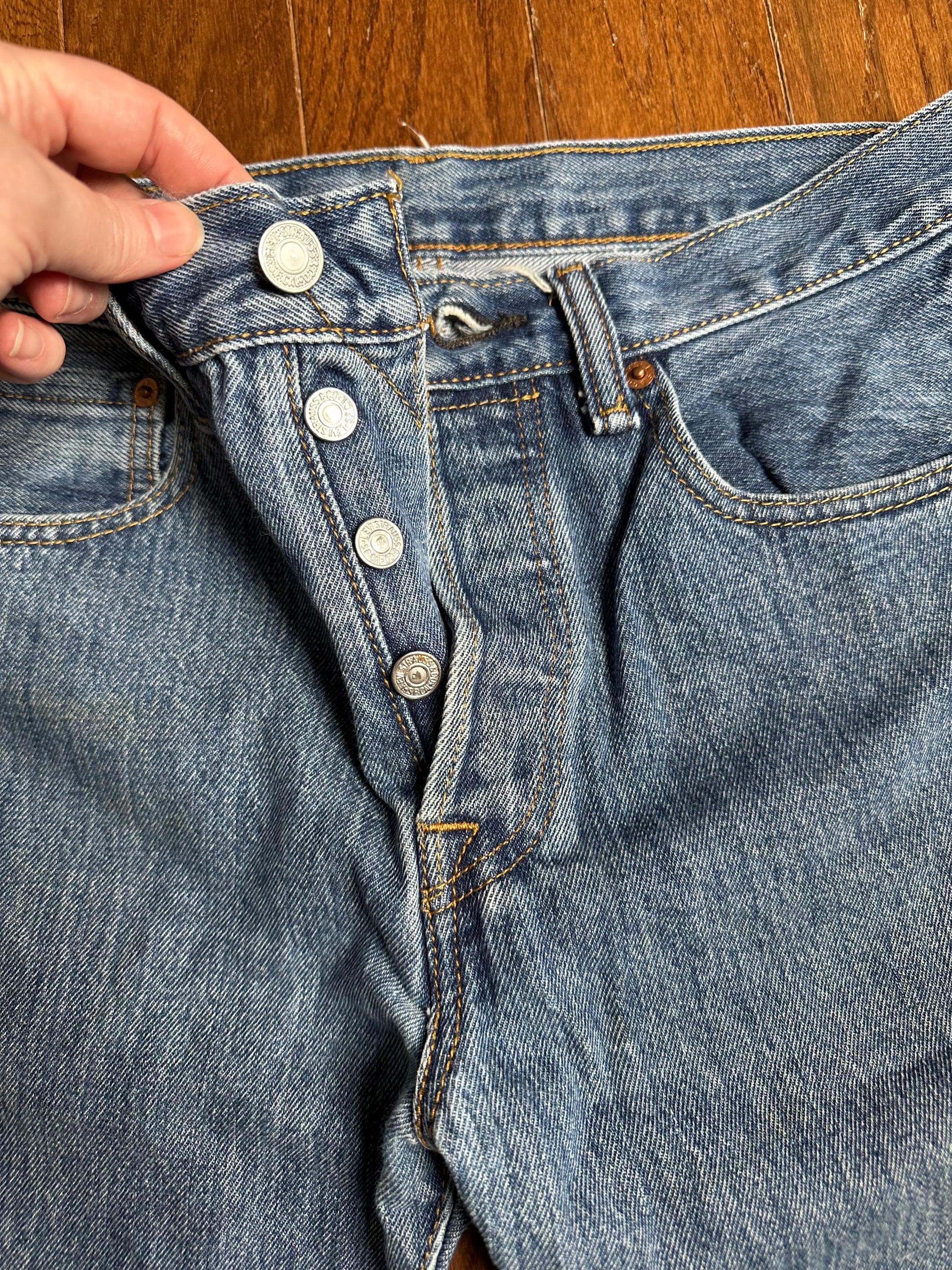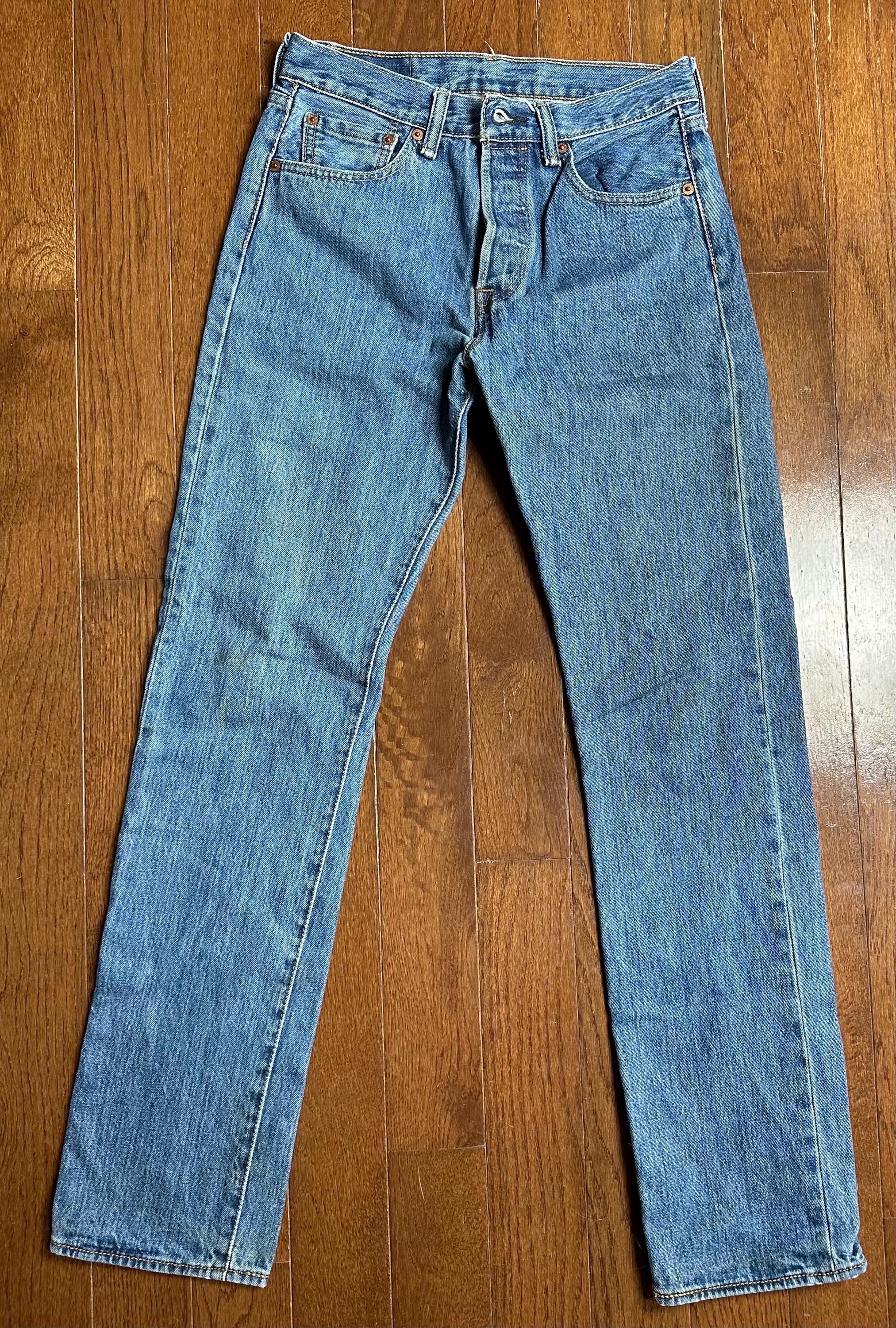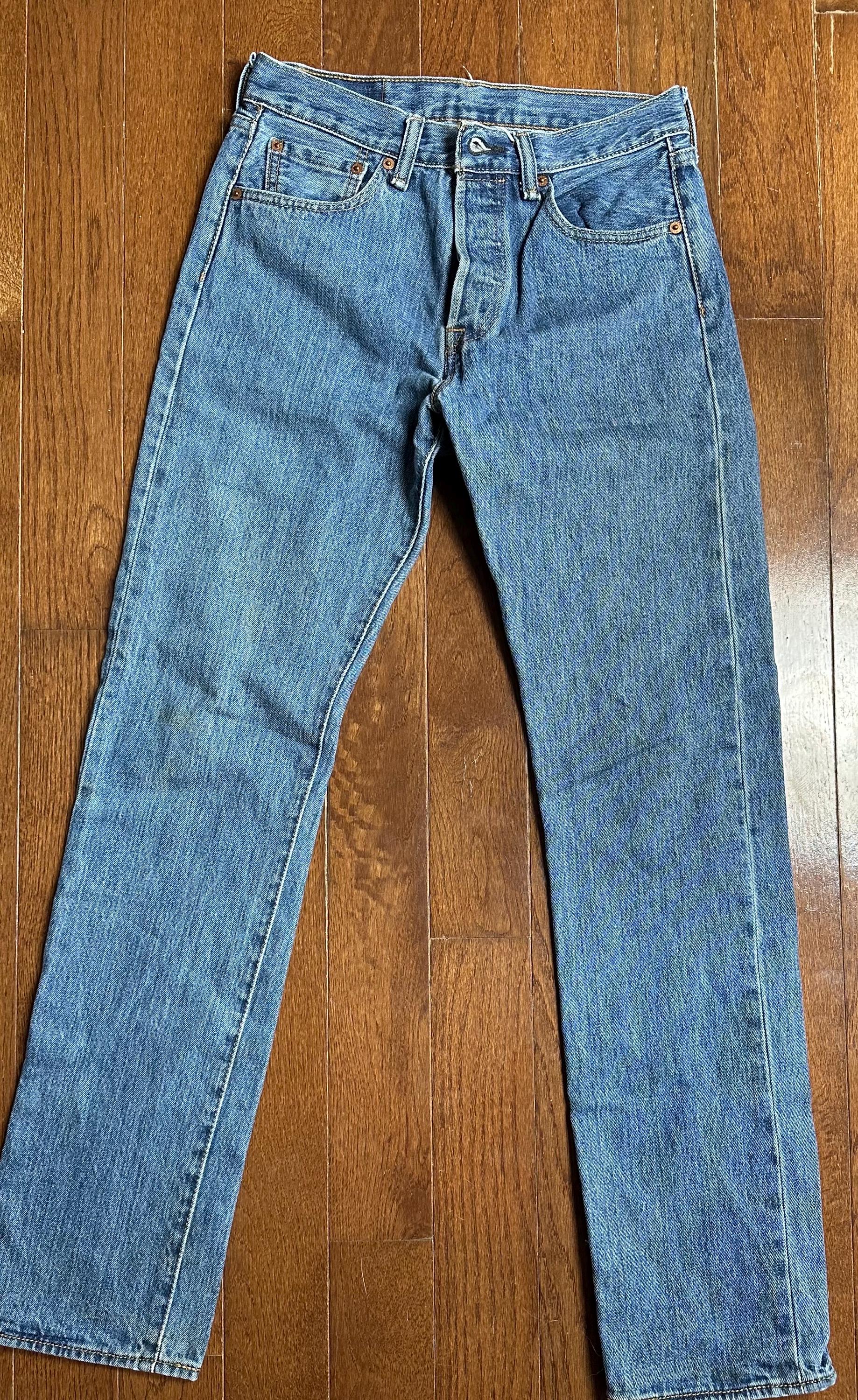 Classic Levi’s 501 jeans with that timeless straight leg fit and perfectly broken-in vintage wash.